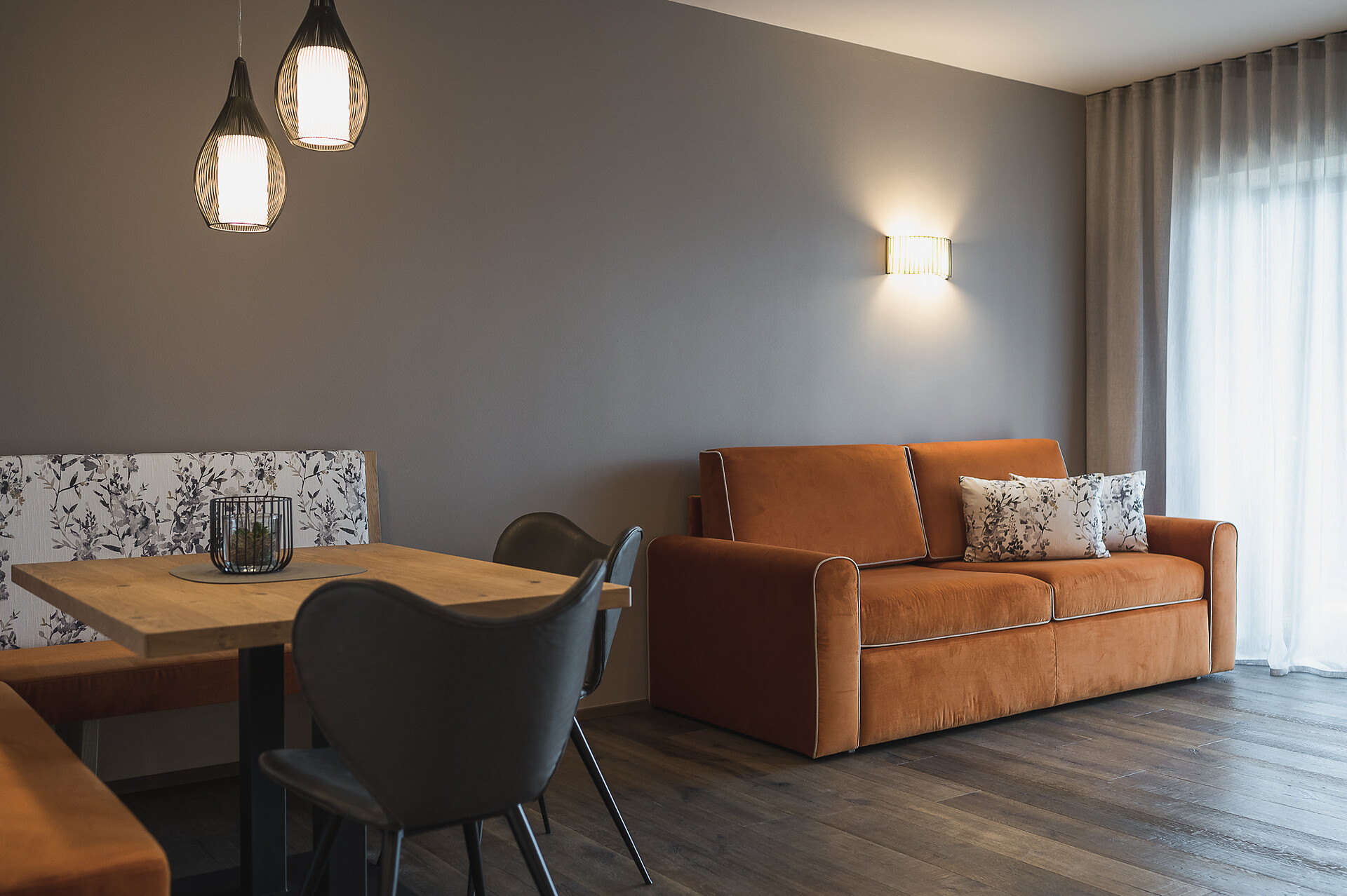 Es besteht aus einem Wohnraum mit Ausziehcouch und Essecke, abgetrenntes Schlaf- und Kinderzimmer sowie Eingangsbereich mit Küchenzeile, TV, Telefon, W-Lan, Safe.