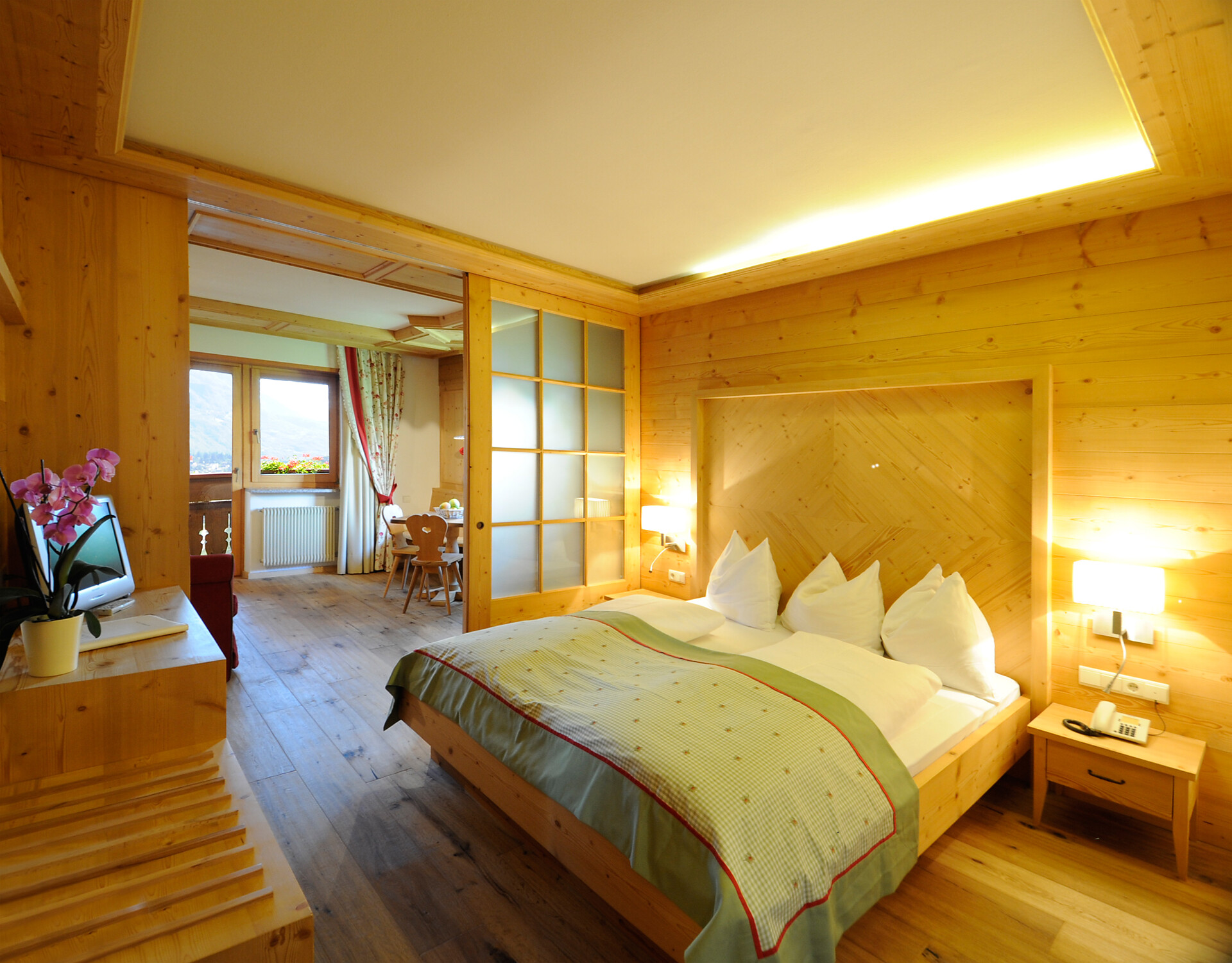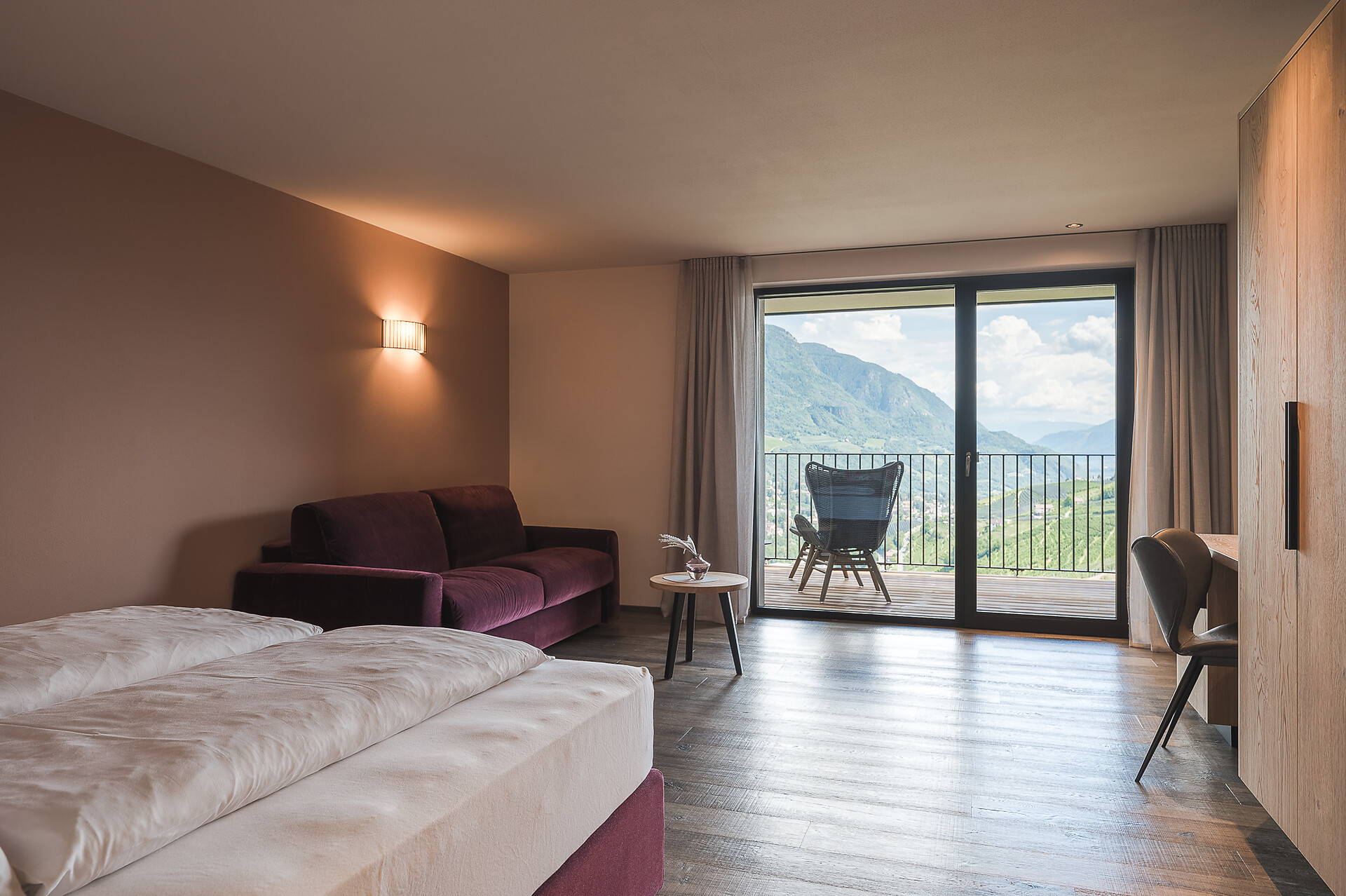 Familienappartement auch für 2 Personen mit Klimaanlage und eigener Gartenterrasse mit Blick auf die umliegende Bergwelt zur sonnigen Südseite.