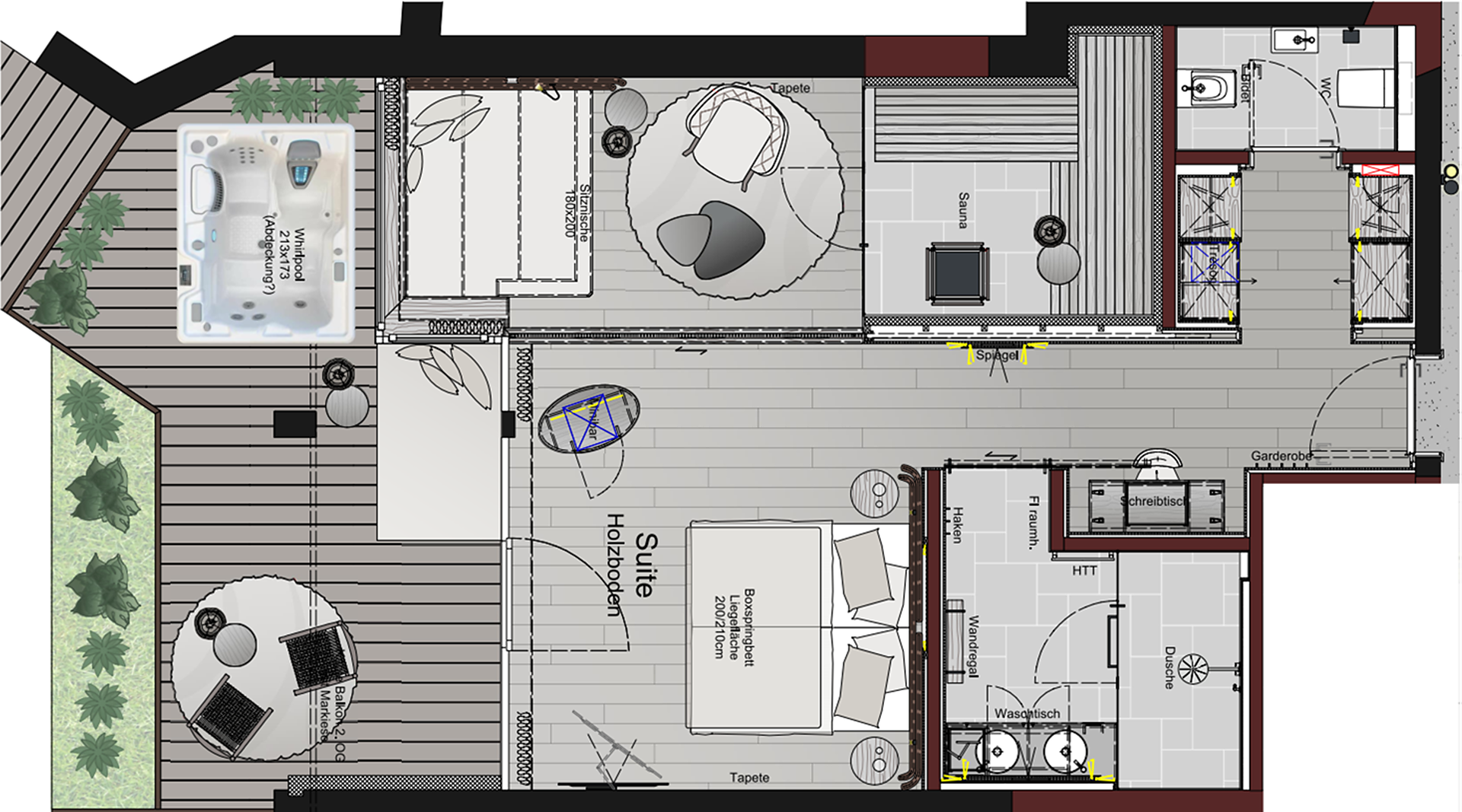 Suite "Sonnentraum Wellness & Spa" (ca. 36m²), nichtraucher, im alpinen Style eingerichtet, mit elegantem Altholz, Schlaf-Wohnraum, große Fensterfront zur Südseite, mit traumhaftem Ausblick, klimatisiert, Physiotherm Infrarotkabine, Bad, Dusche, Badewanne, getrenntes WC & Bidet, Kosmetikspiegel, Haarfoen, Flachbild-SAT-TV, Frigobar, WLAN, Tel, Safe, Südbalkon mit Sitzgarnitur, Dachgarten mit Liegen, Finnische Panoramasauna und exklusivem Whirlpool (der Whirlpool ist von 09.00 Uhr bis 22.00 Uhr nutzbar). Hunde nicht erlaubt. Tiefgaragenstellplatz inklusive.