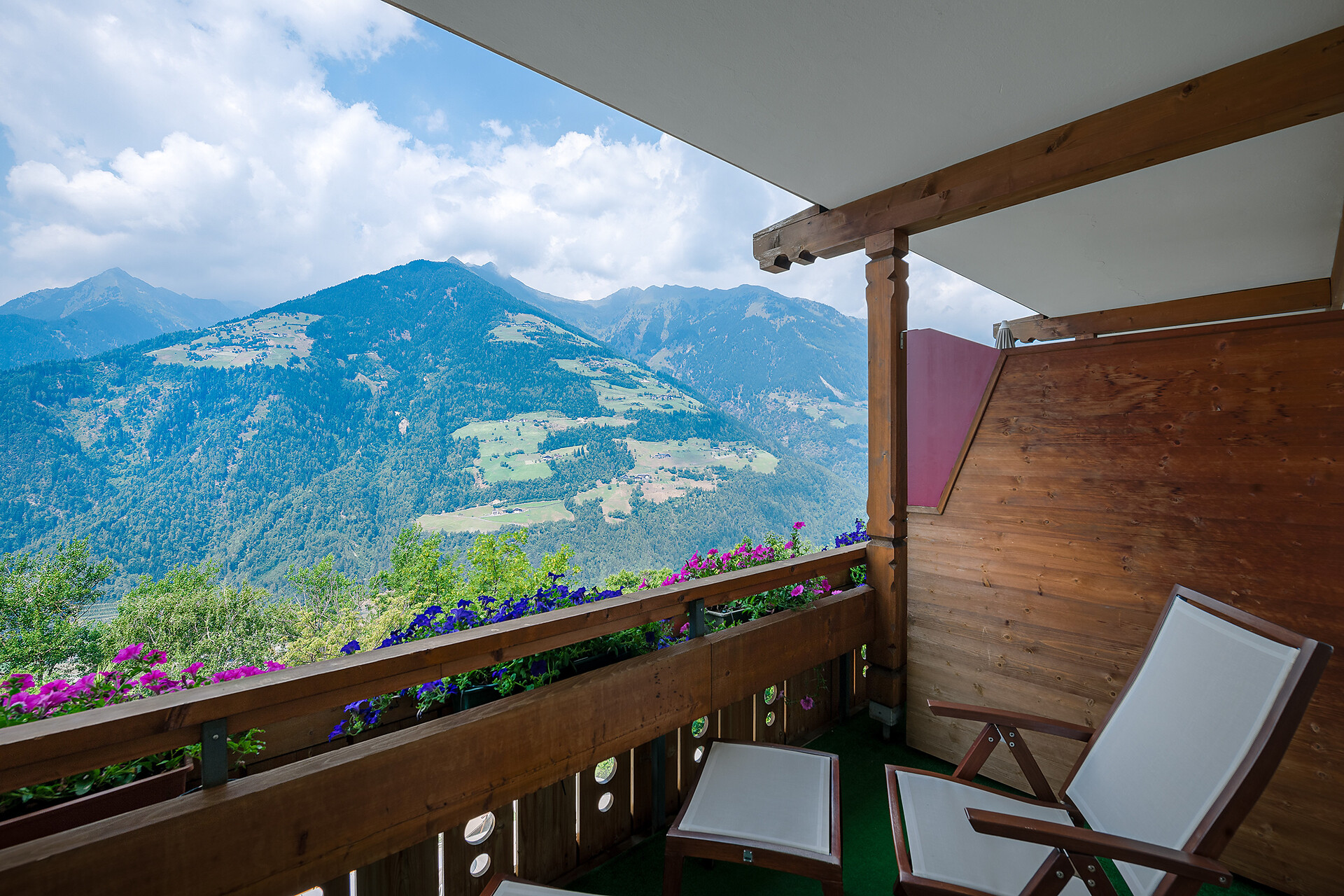 Erleben Sie erholsame Tage und genießen Sie unser uriges Wellnessdörfl, mitten zwischen Birken-und Kastanienbäumen mit Panoramablick auf den Meraner Talkessel.