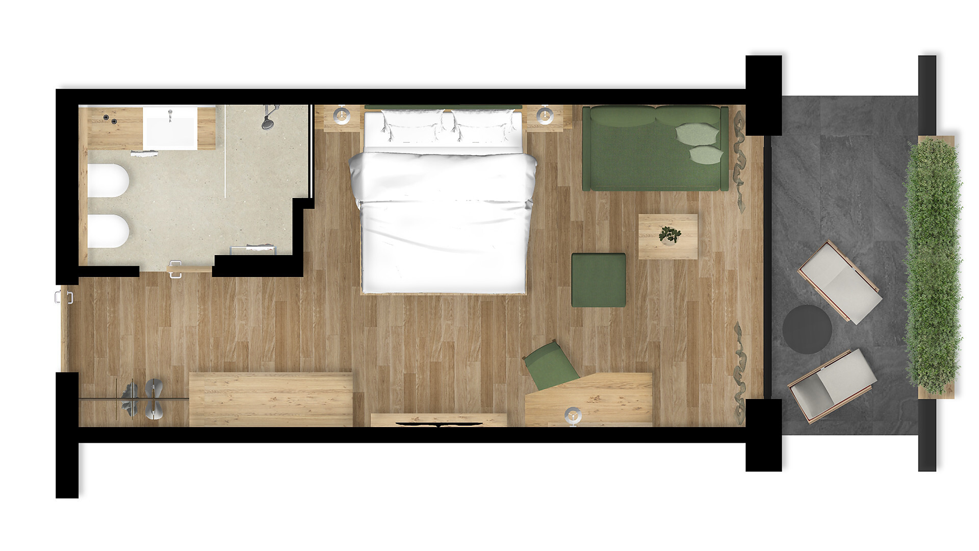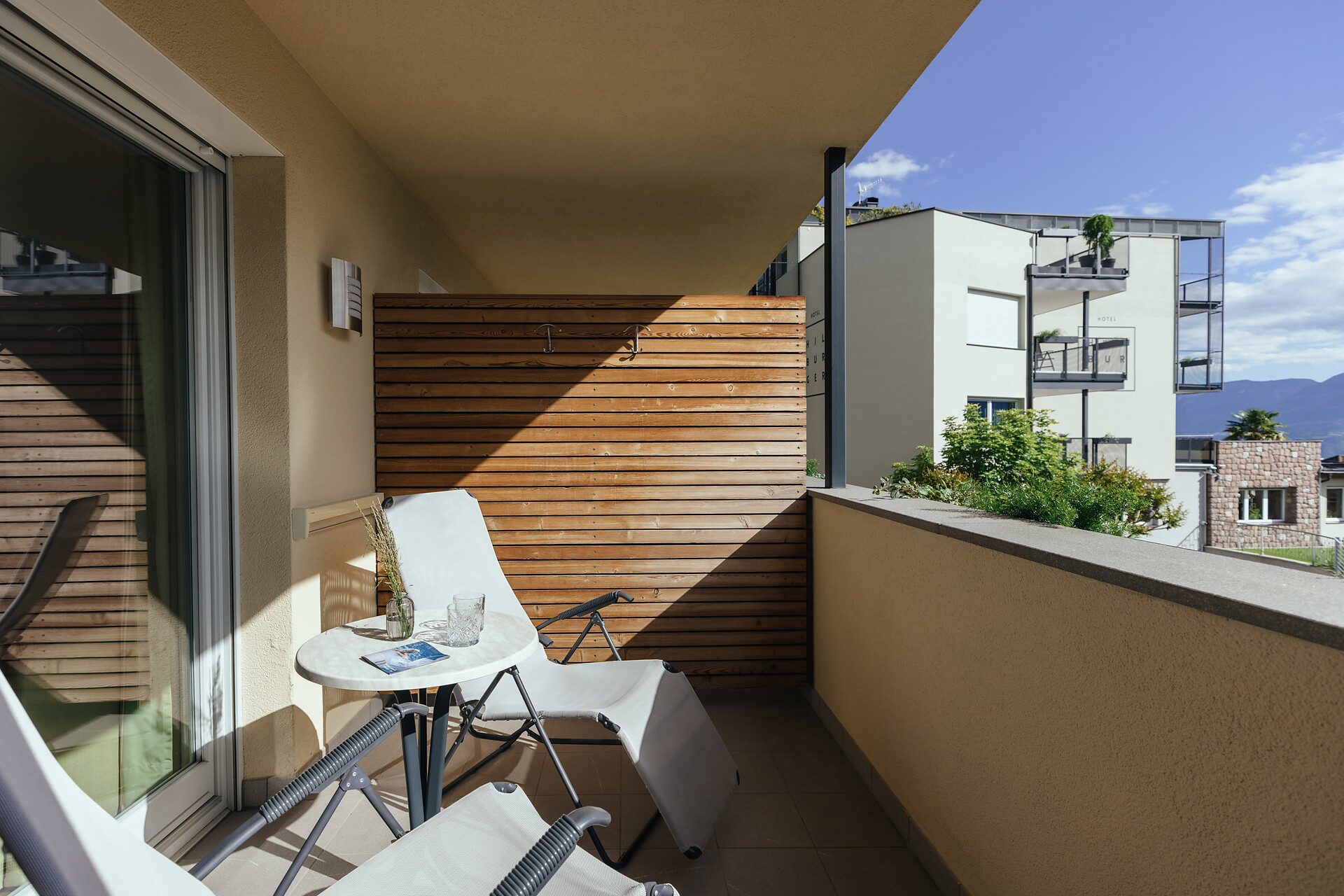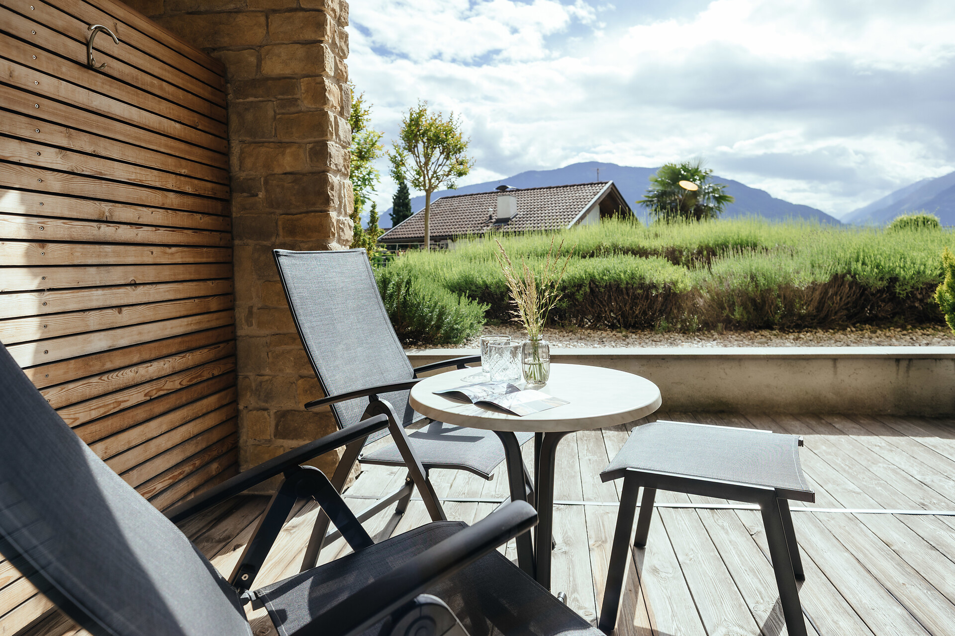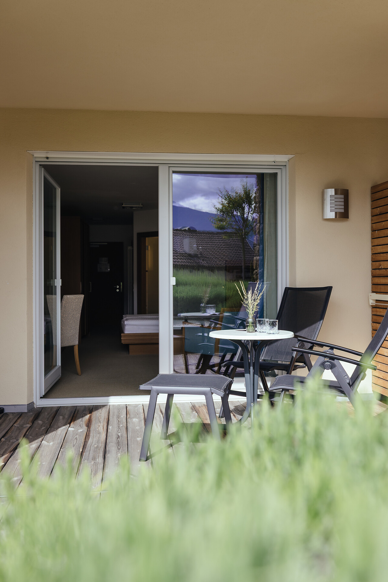 25 m² Südbalkon/Terrasse, mit Blick auf unseren Lavendelgarten, Holzboden, Dusche/WC, Bidet, Kühlbox, Nichtraucherzimmer.