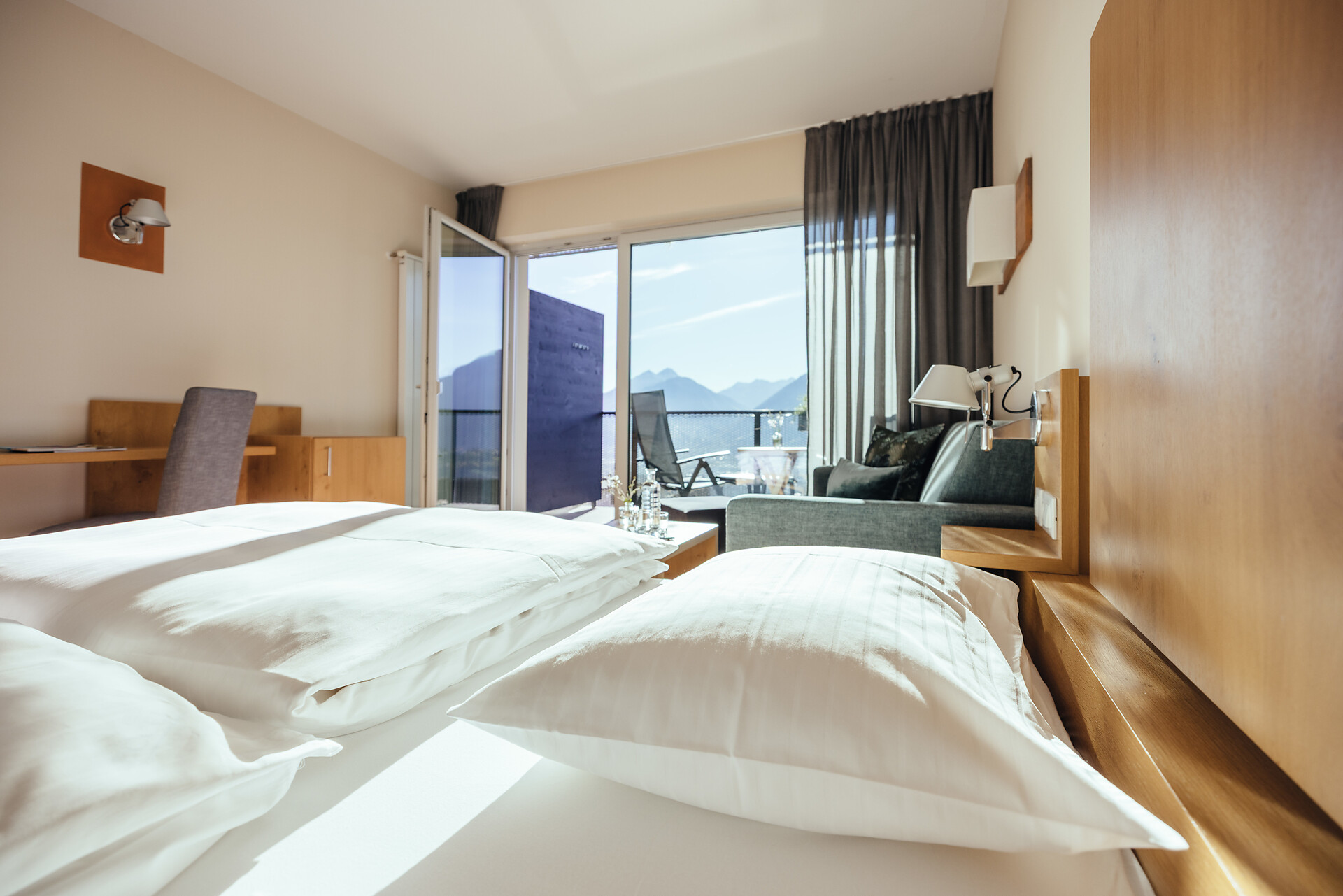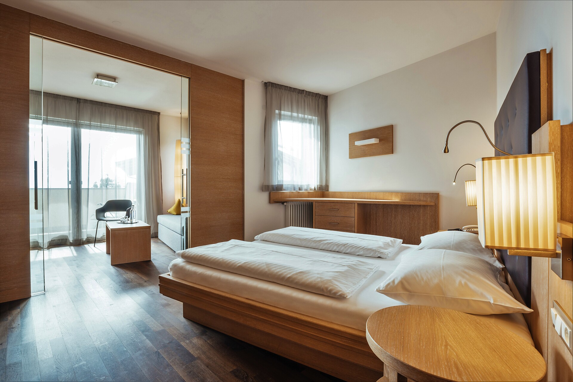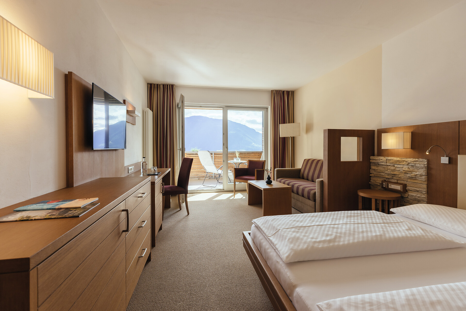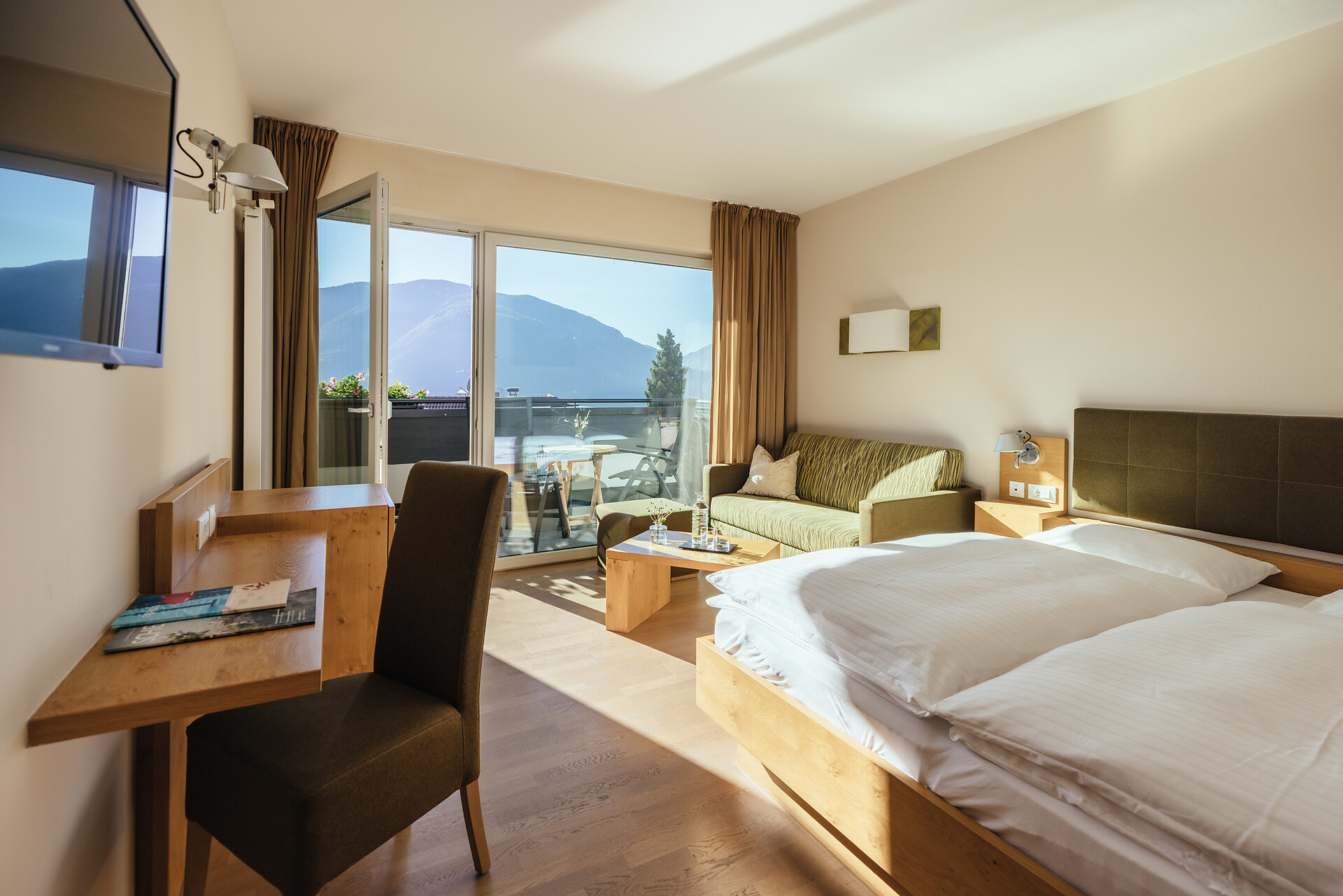 Doppelzimmer 25 m², mit Südbalkon, Holzboden, Dusche/WC, Bidet, Kühlbox, Safe,TV, bequeme Sitzecke, Nichtraucherzimmer, Klimaanlage.