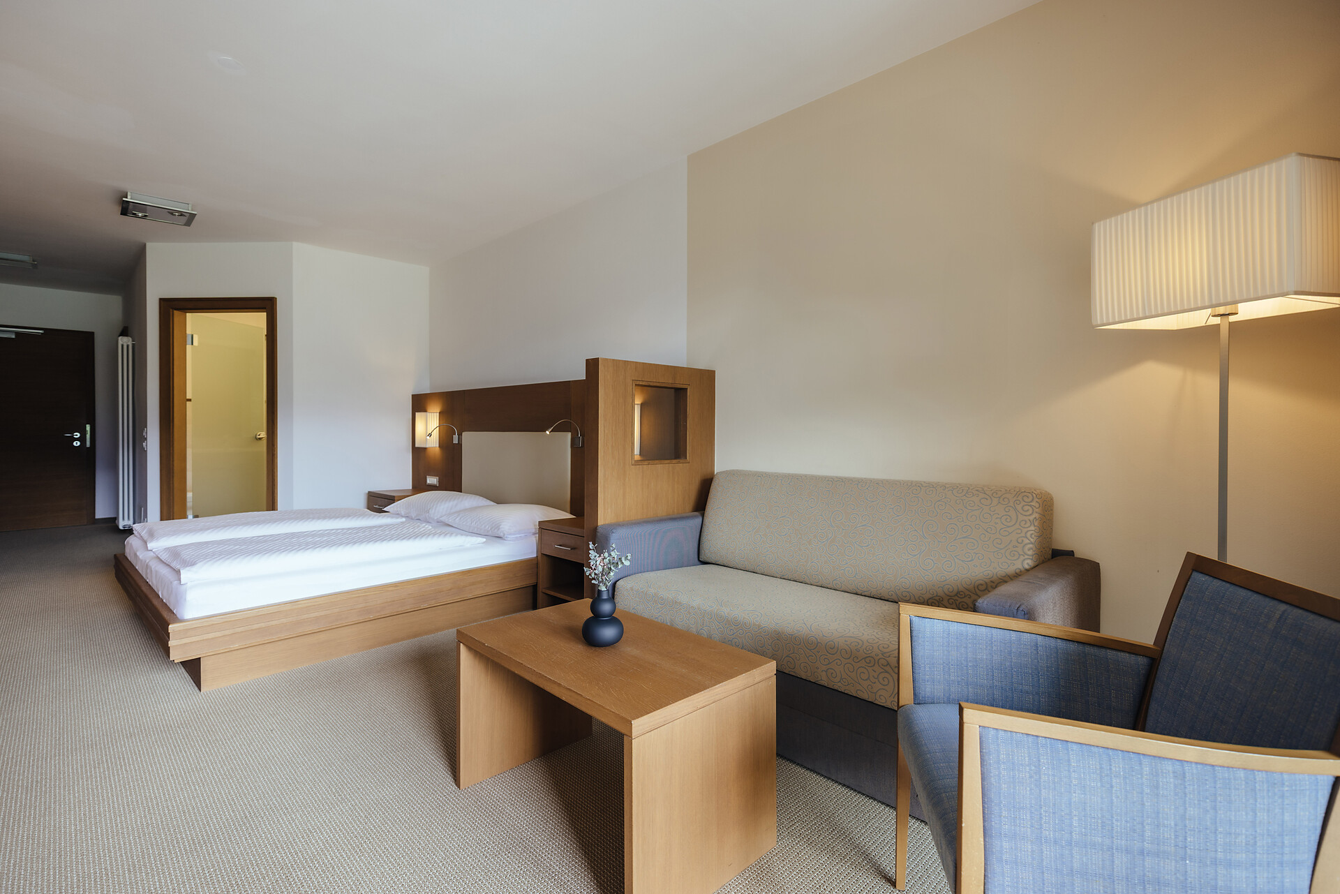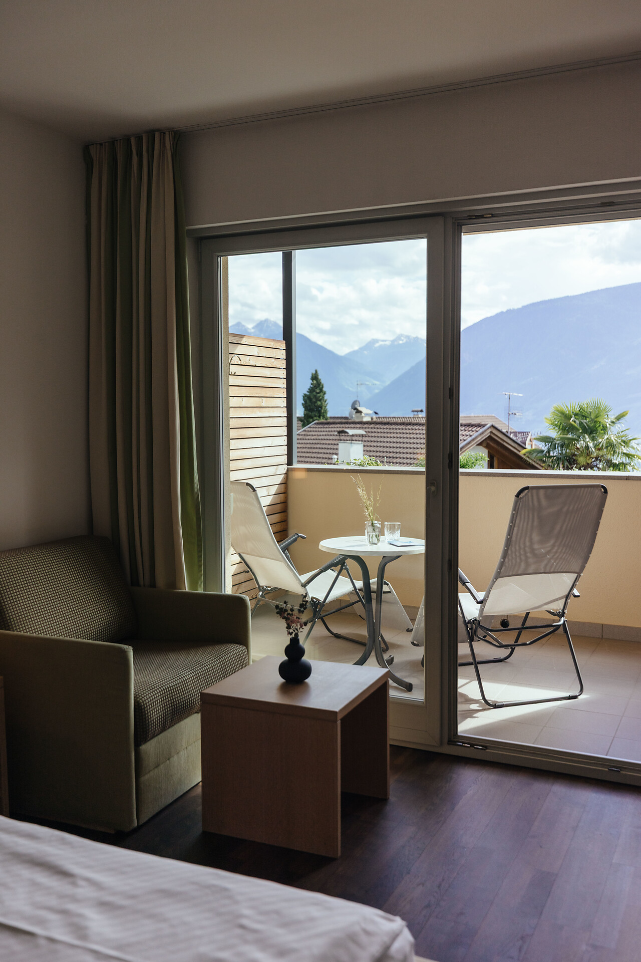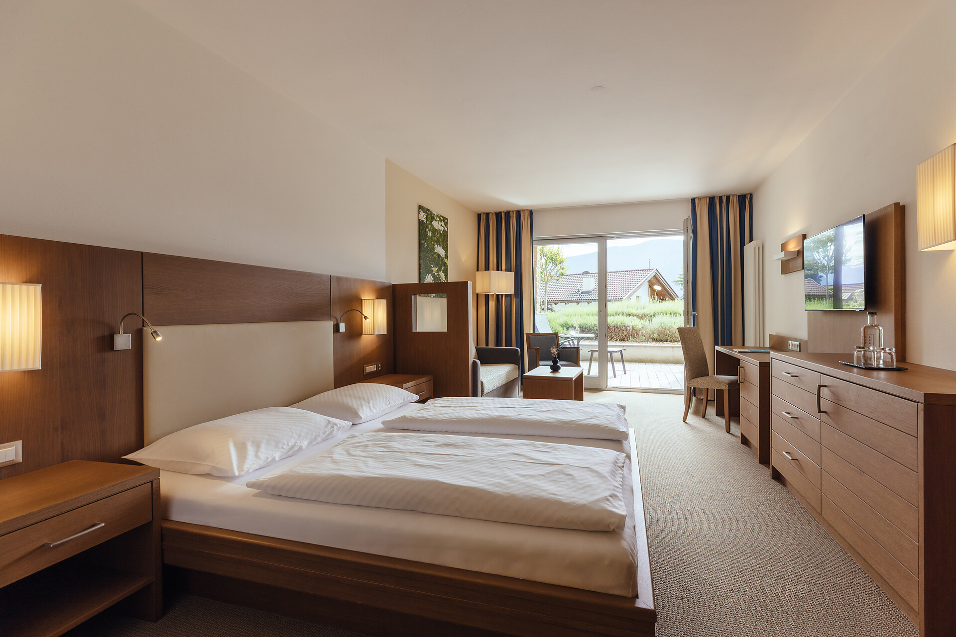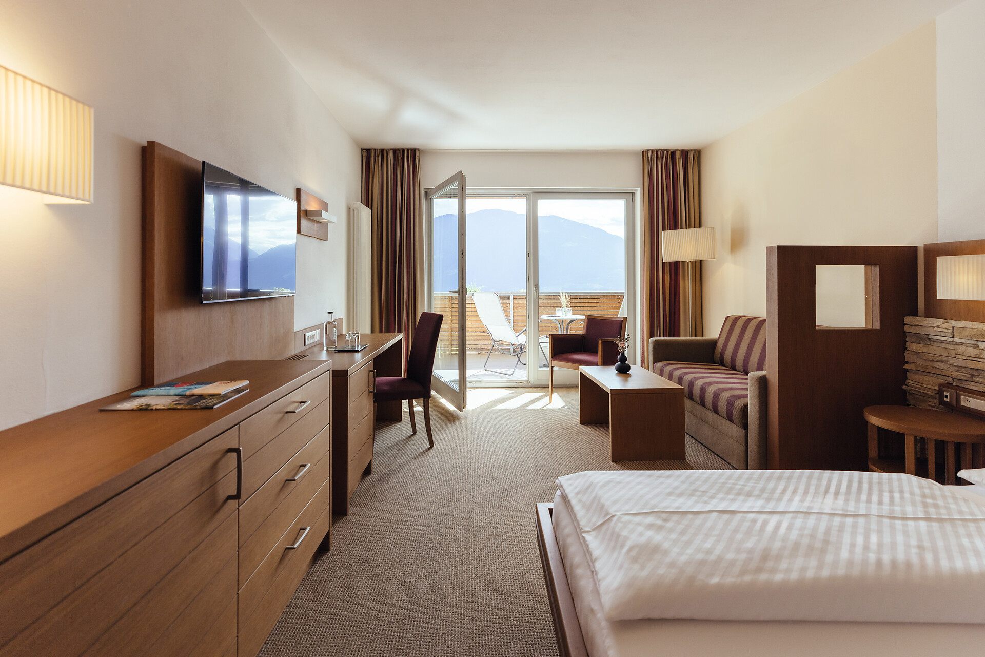 Doppelzimmer 25 m², mit Südbalkon, Holzboden, Dusche/WC, Bidet, Kühlbox, Safe,TV, bequeme Sitzecke, Nichtraucherzimmer, Klimaanlage.