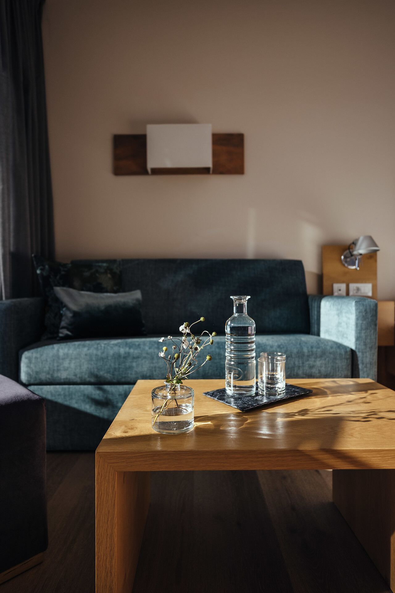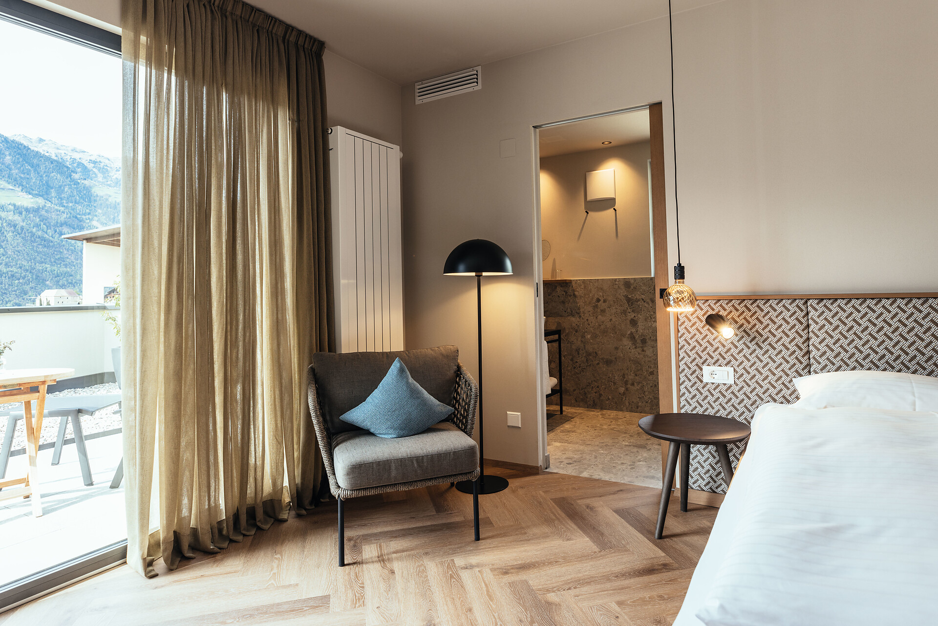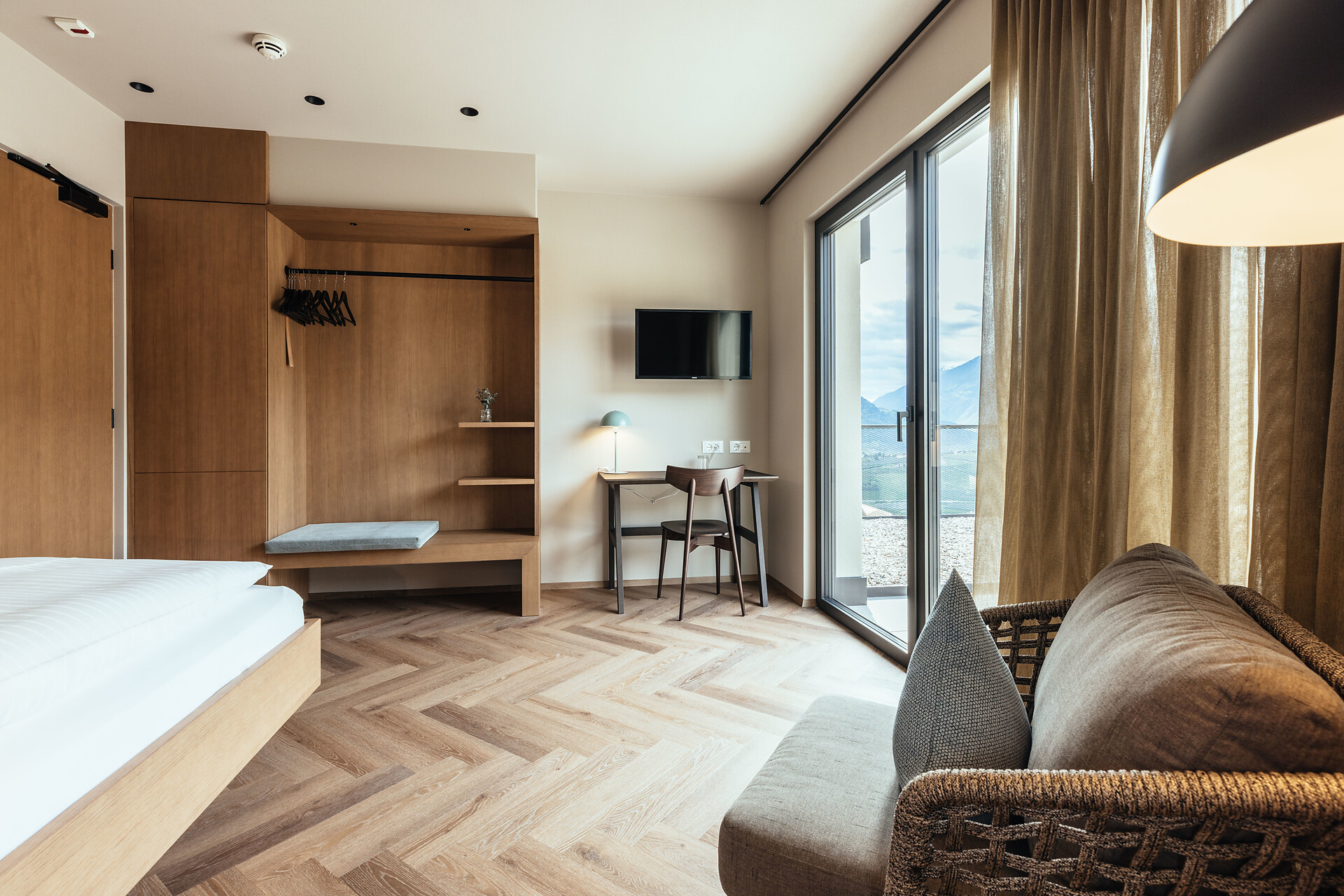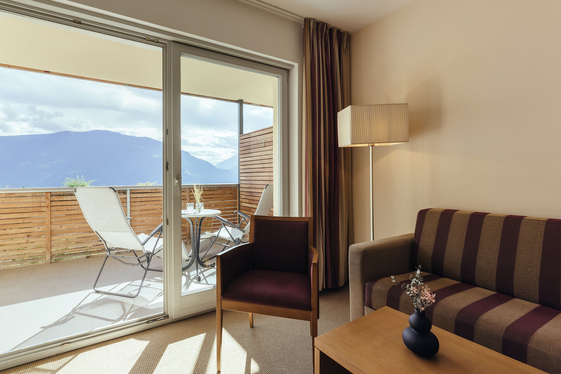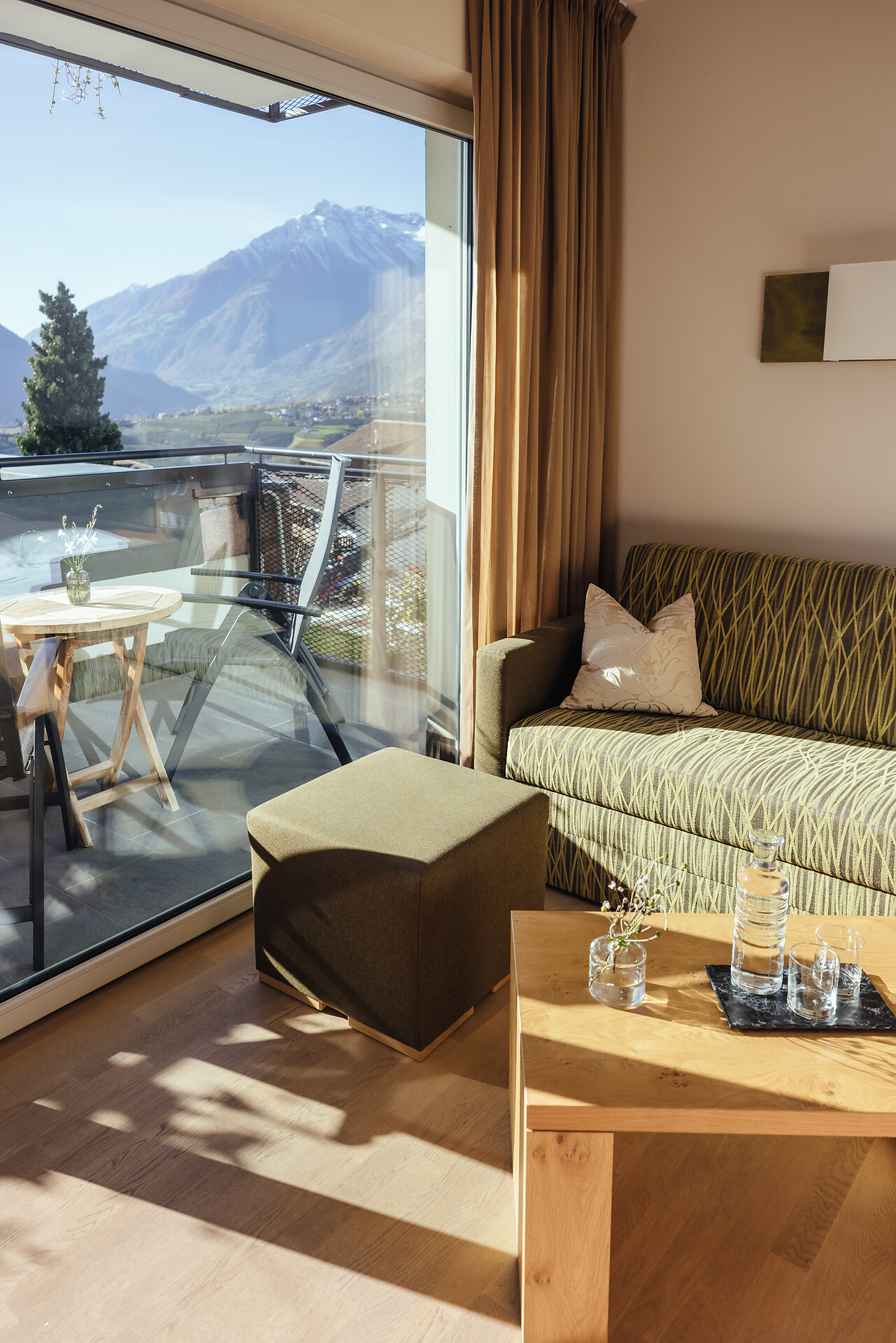 Natürlich wohlfühlen. Viel Holz, Glas und warme Farben. Das Wohlfühlambiente begleitet Sie durch das ganze Hotel in Schenna.