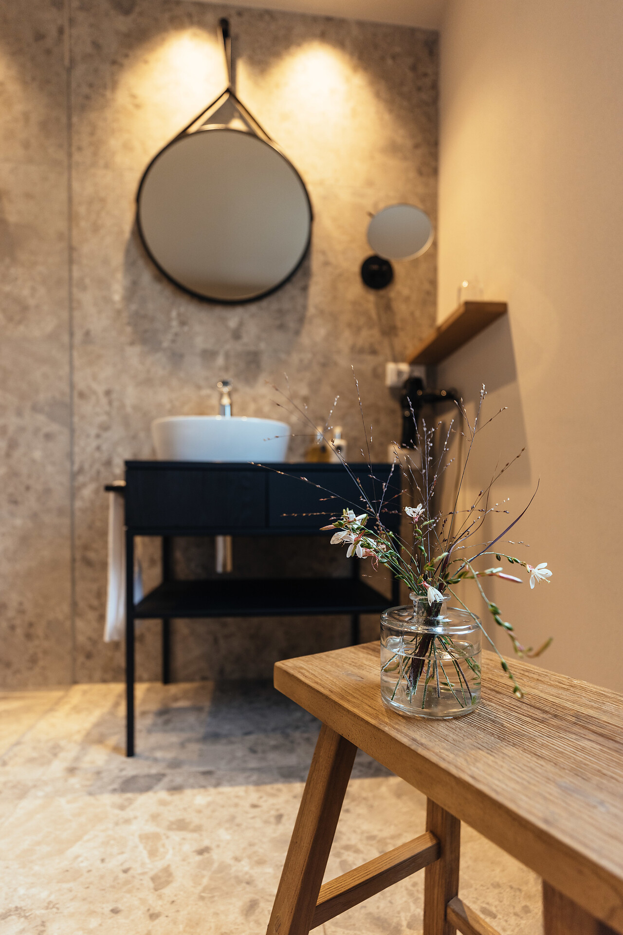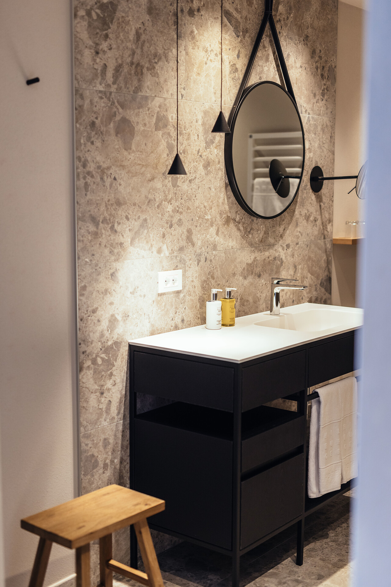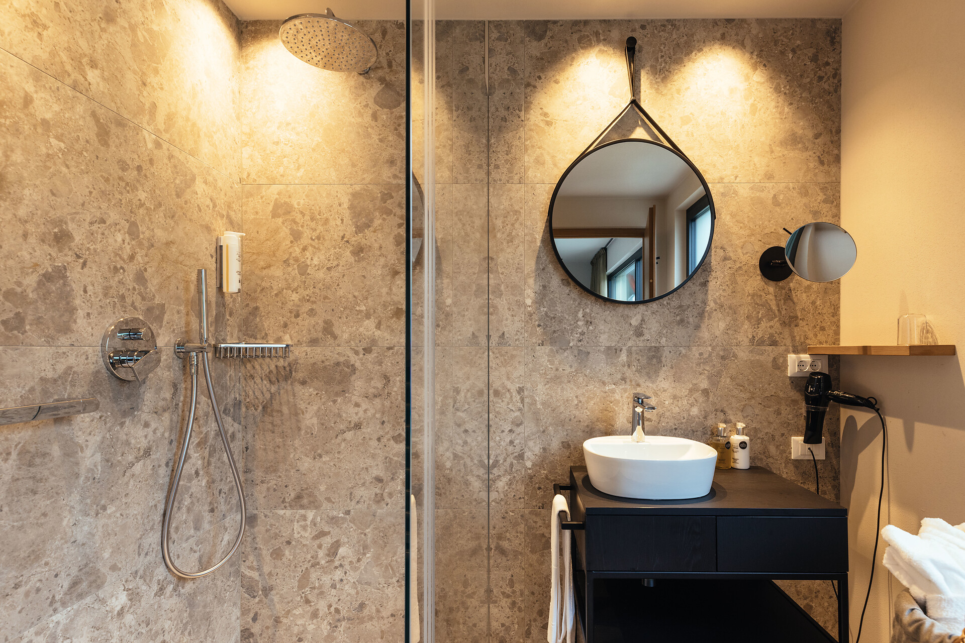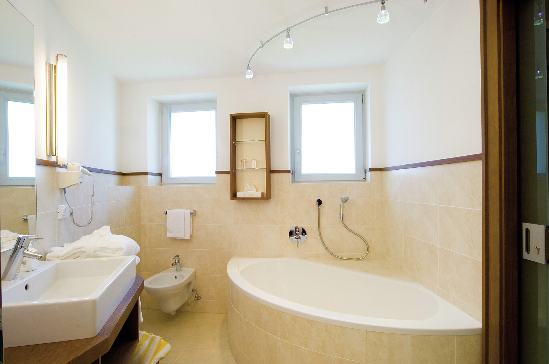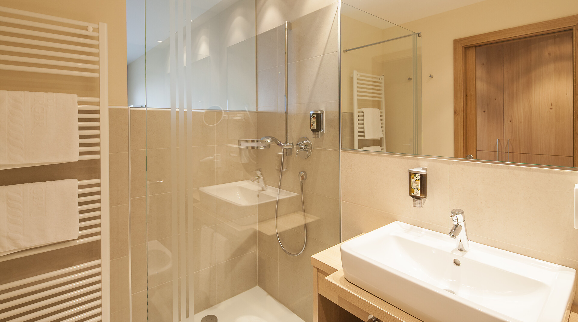 Natürlich wohlfühlen. Viel Holz, Glas und warme Farben. Das Wohlfühlambiente begleitet Sie durch das ganze Hotel in Schenna.