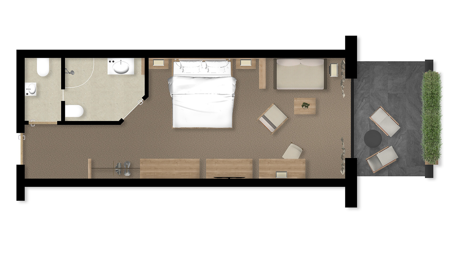Doppelzimmer, Doppelbett, Zustellbett, Babybett, Bettsofa, Balkon, Klimaanlage, Minibar, Safe, Dusche / Bad, Bidet, Haarfön, Bademantel, TV, Satellit/Kabel, WLAN, Südseite