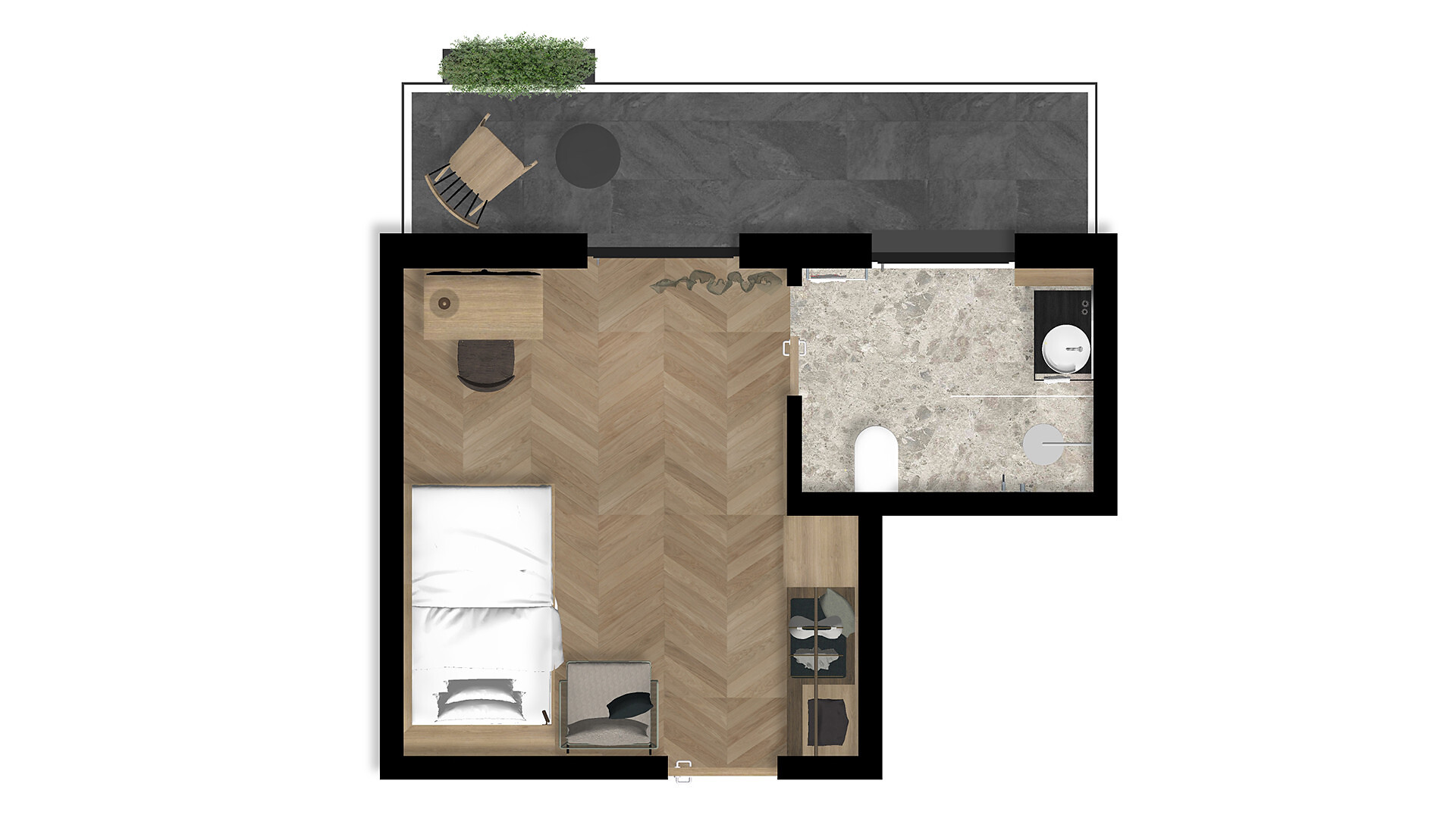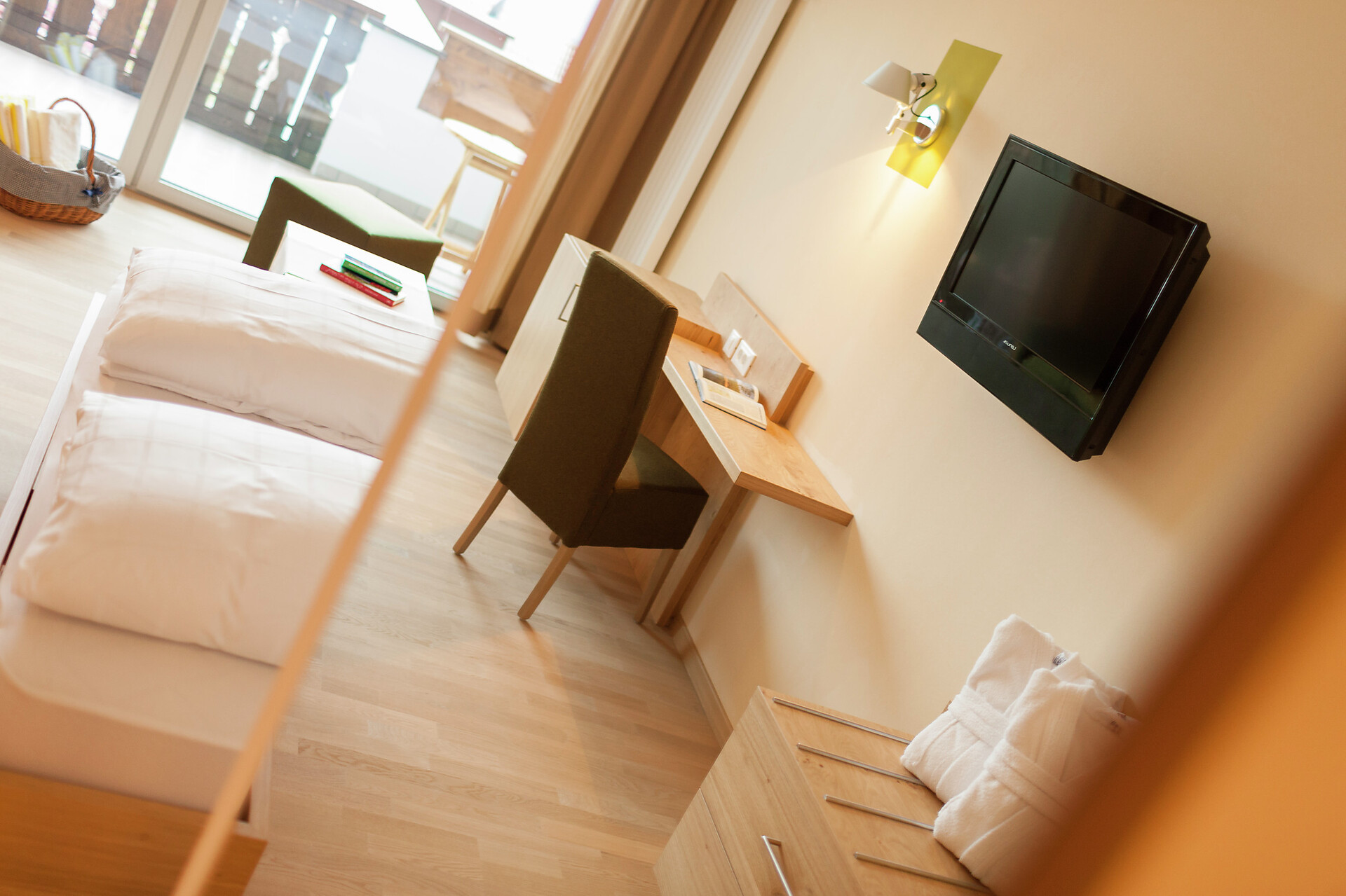 Zimmer 24 m² mit Südbalkon 2. oder 3. Etage, Dusche/WC, Safe, TV, Nichtraucherzimmer, Holzboden.
