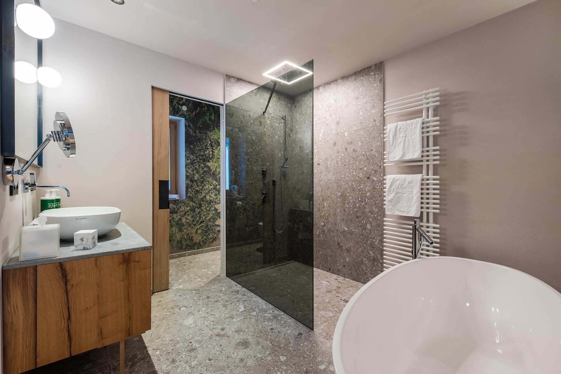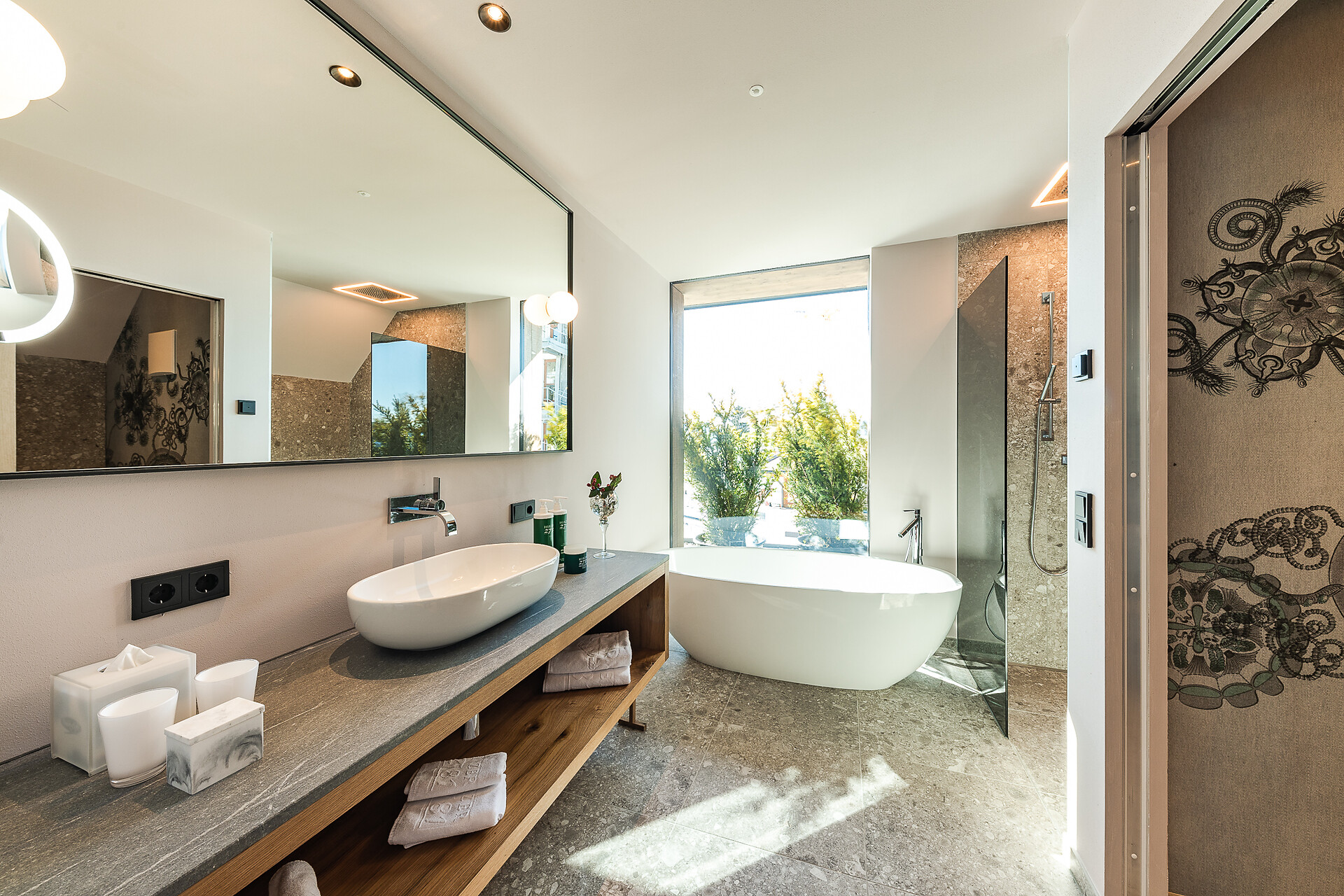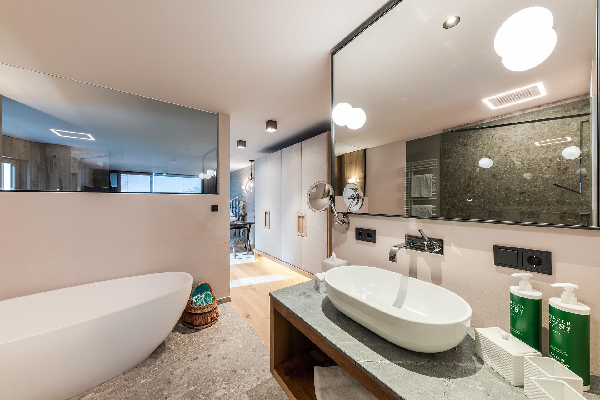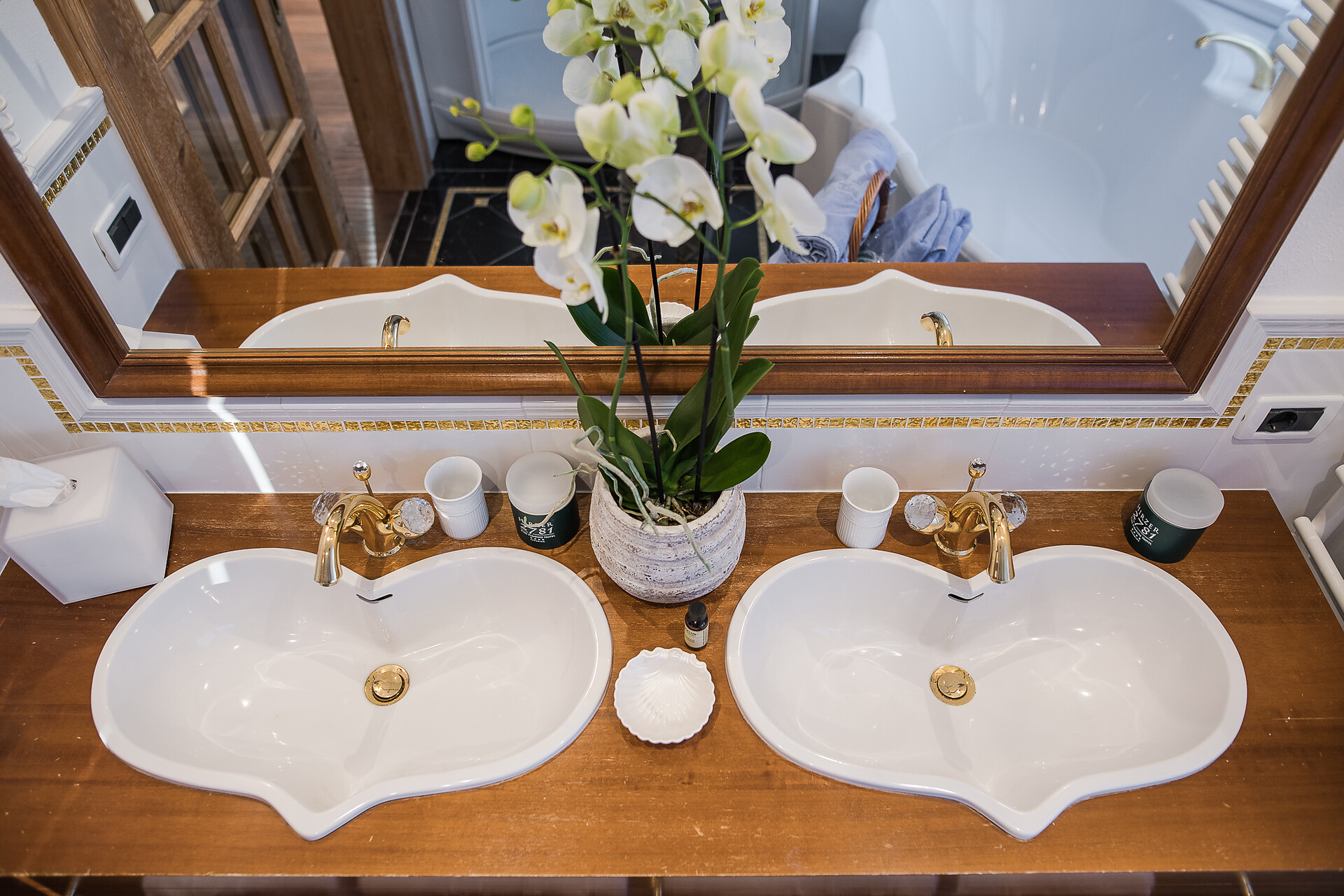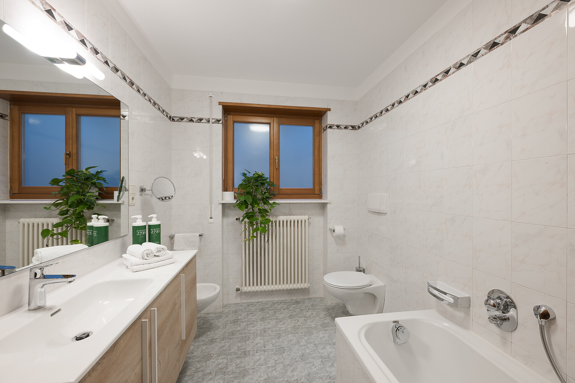 - Großes Badezimmer mit Badewanne, Doppelwaschbecken, WC, Bidet, Föhn, Kosmetikspiegel
