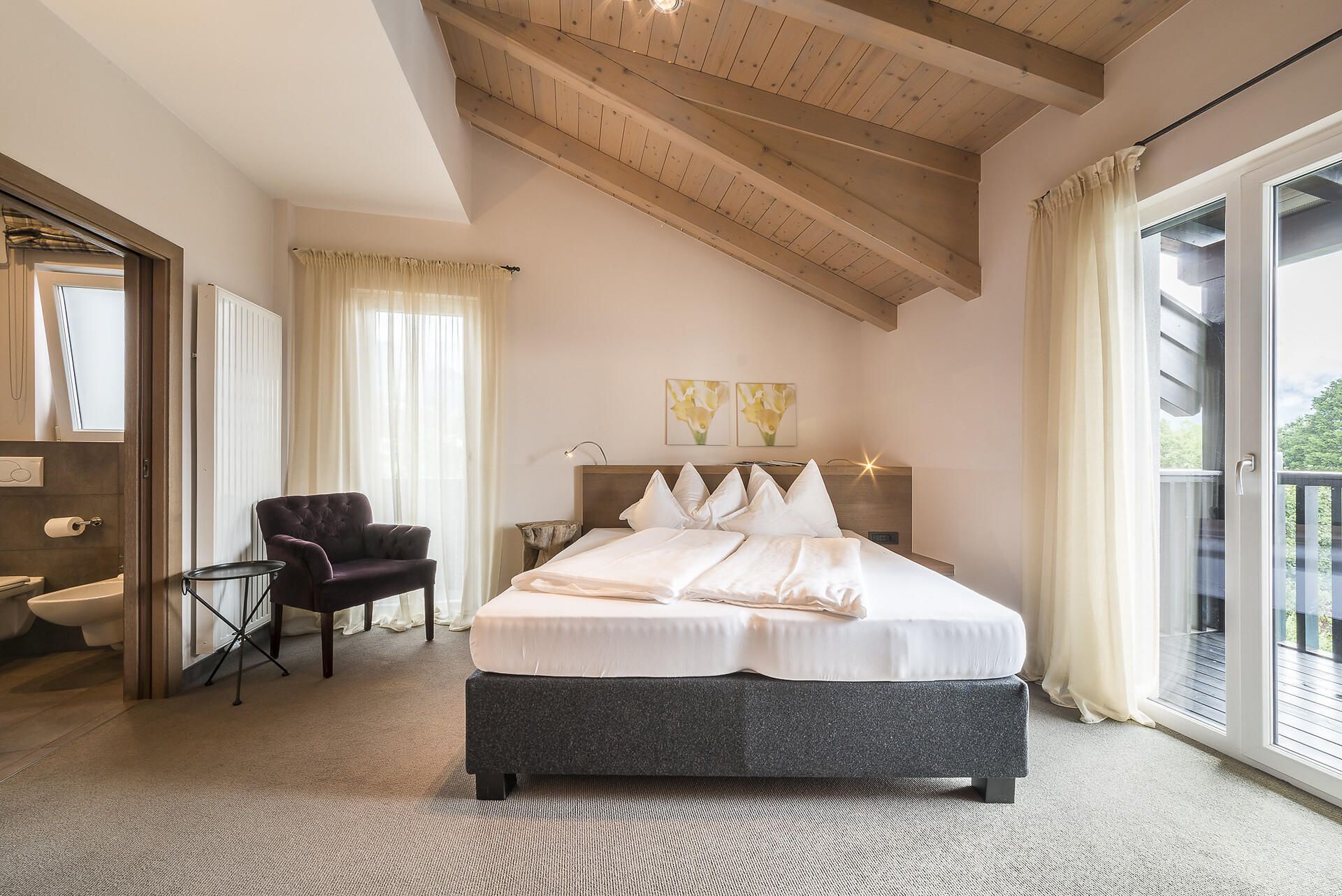 Doppelzimmer, Doppelbett, Zustellbett, Babybett, Balkon, Safe, Dusche / Bad, Haarfön, TV, Satellit/Kabel, WLAN, Internetanschluss, Haupthaus, Südseite