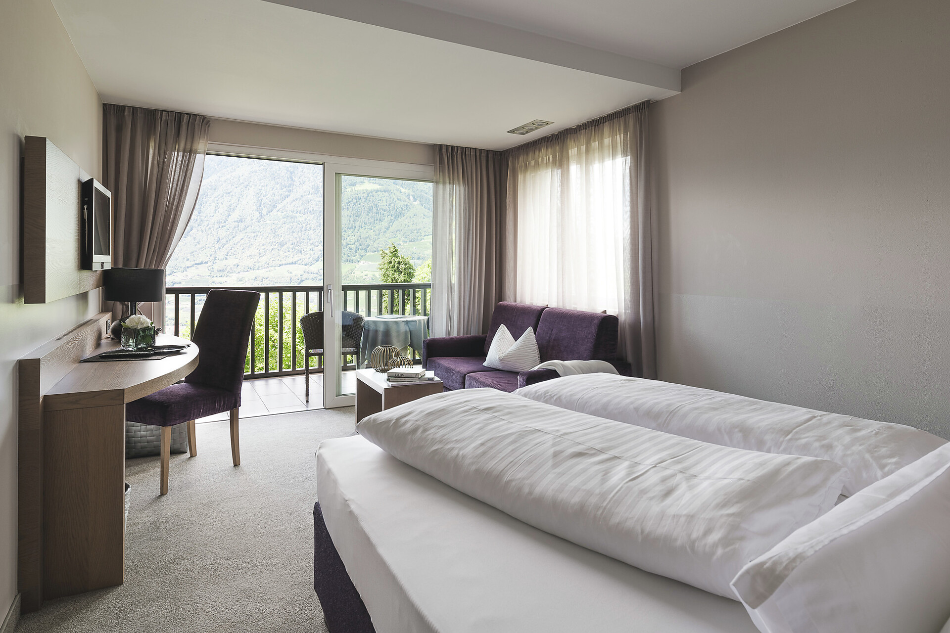 Dieses Zimmer bietet einen Panoramabalkon mit wundervoller Aussicht auf den Garten und die umliegenden Berge und ist mit Teppichboden und einem LCD-Sat-TV ausgestattet. Das moderne Designerbadezimmer verfügt über Dusche, WC und Haarföhn. Zudem befinden sich im Zimmer eine bequeme ausziehbare Doppelcouch inkl. Beistelltisch, Komfortbett [auch für Allergiker geeignet], Schreibtisch mit Leselampe, Zimmersafe, Internet-LAN und W-LAN.