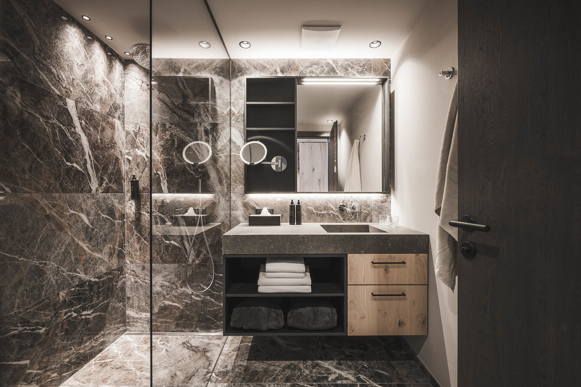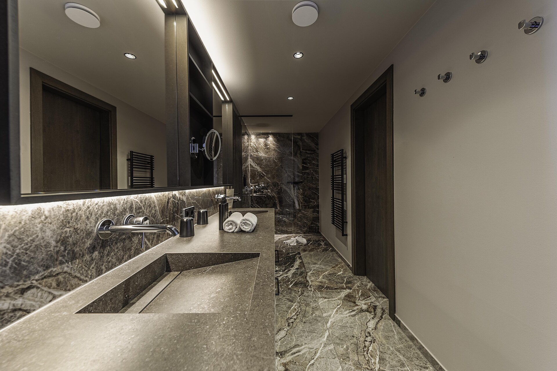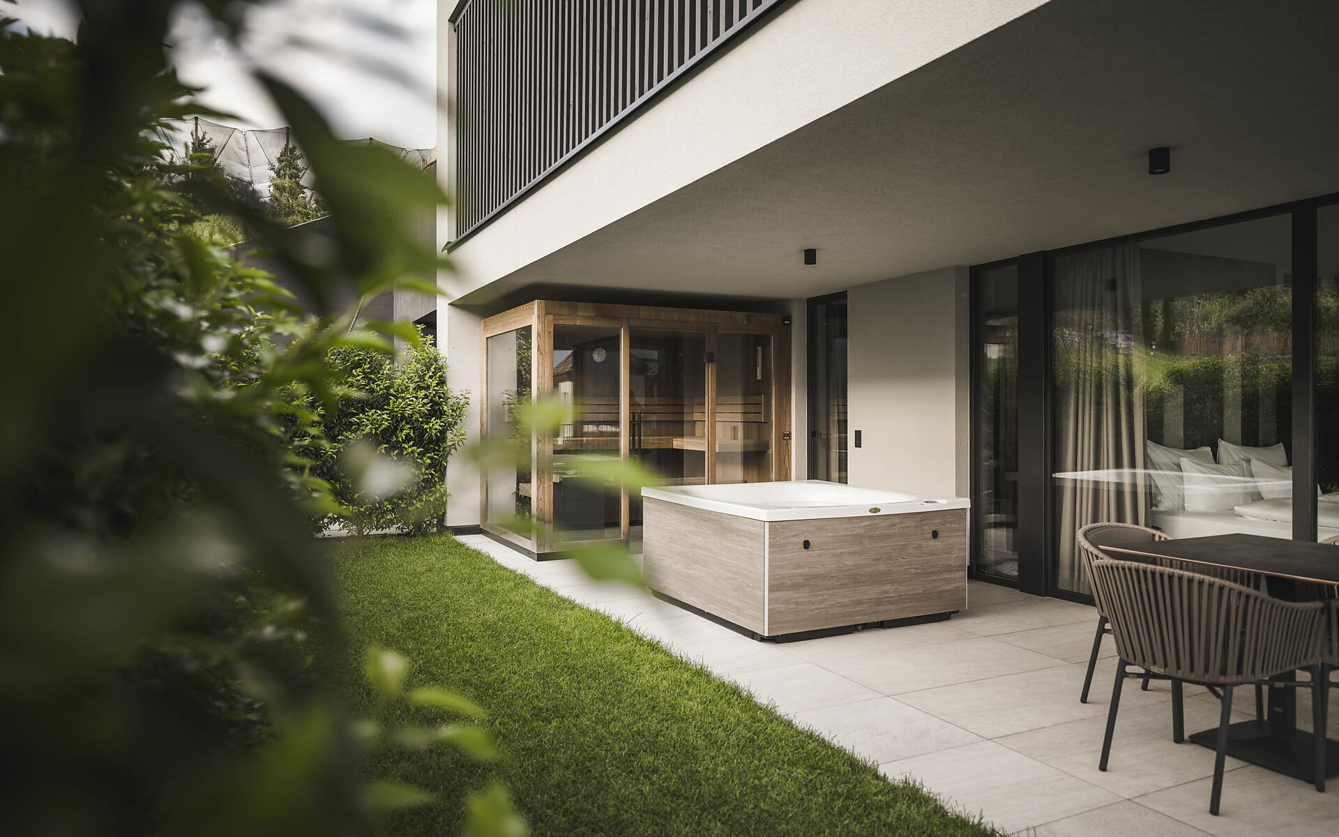 Zwei Kingsize-Boxspringbetten | ausziehbare Couch | zwei Badezimmer mit großzügiger Dusche | Bidet | eigene Sauna | Whirlpool | Balkon möbliert mit privatem Gartenanteil | Smart TV | Klimaanlage | Minibar | Kaffeemaschine | Wasserkocher | Safe