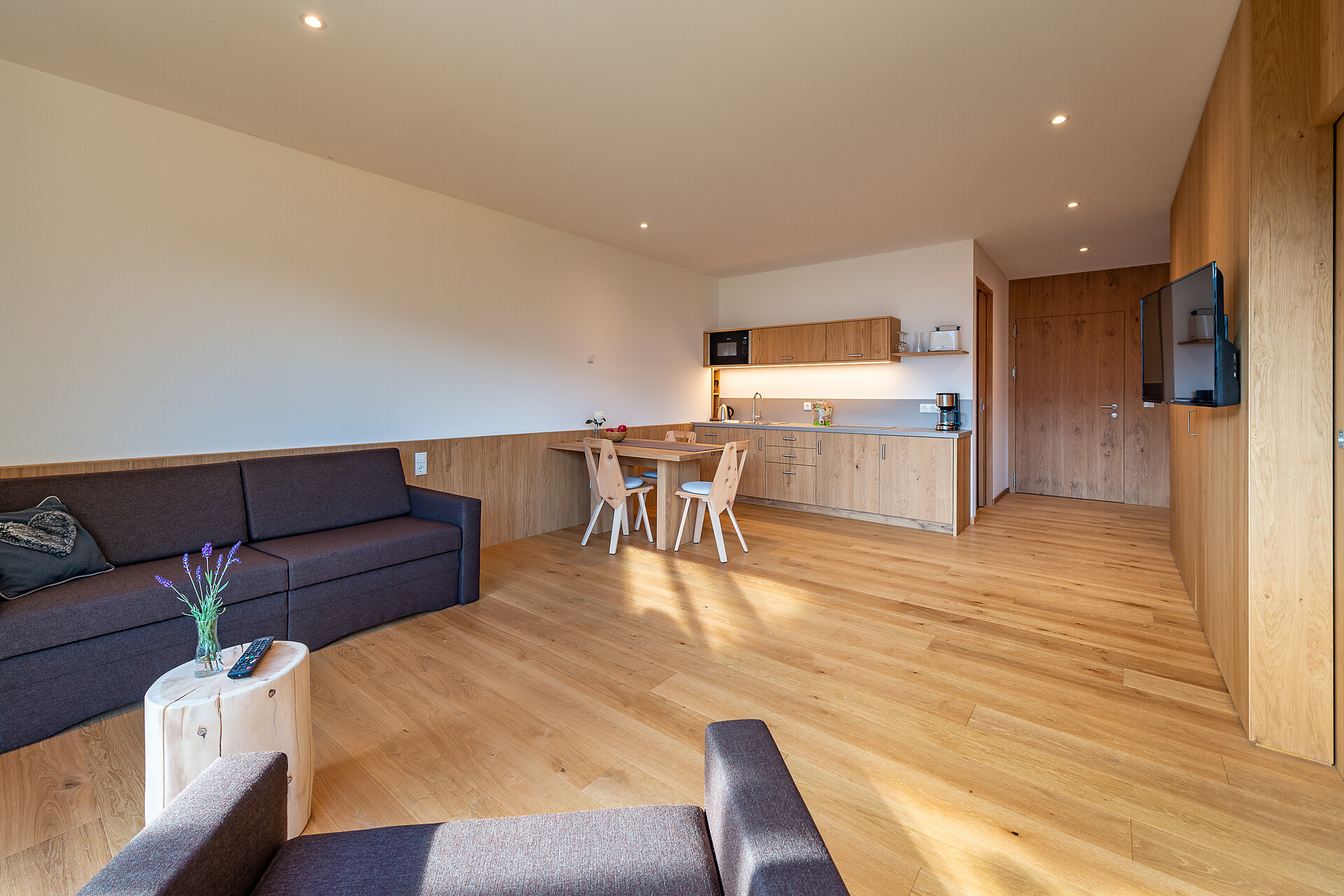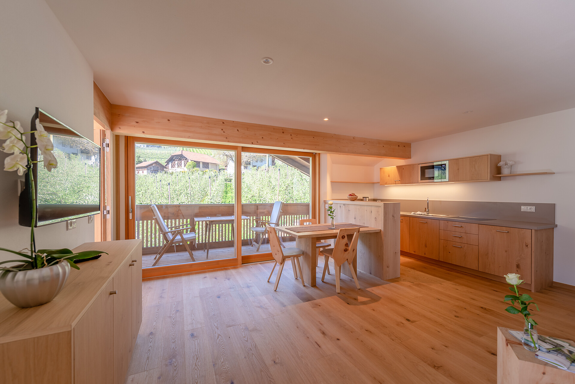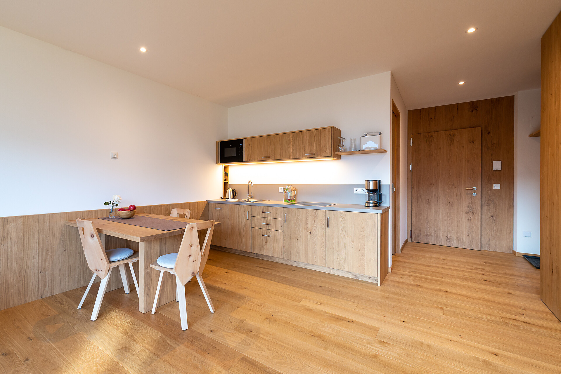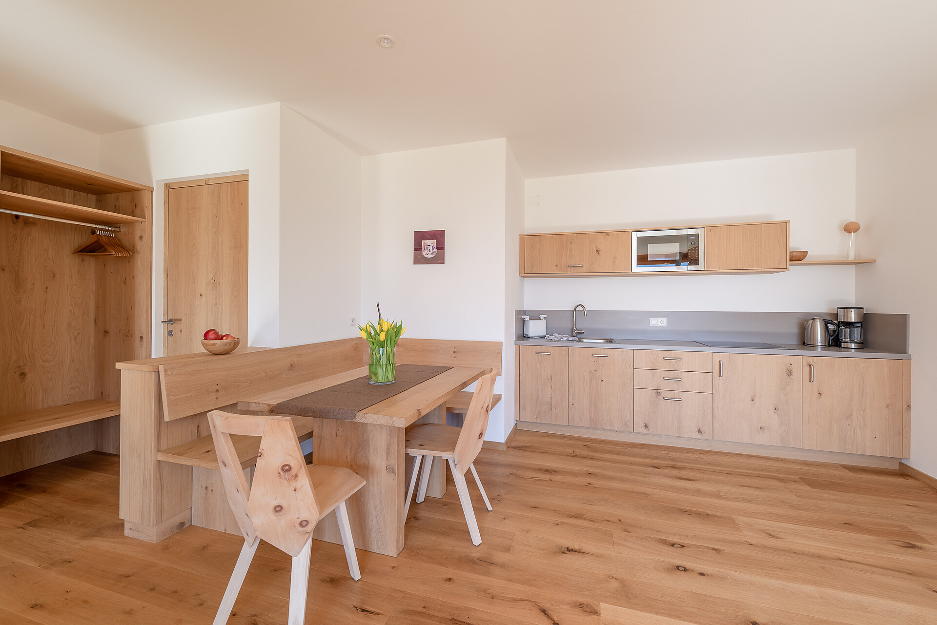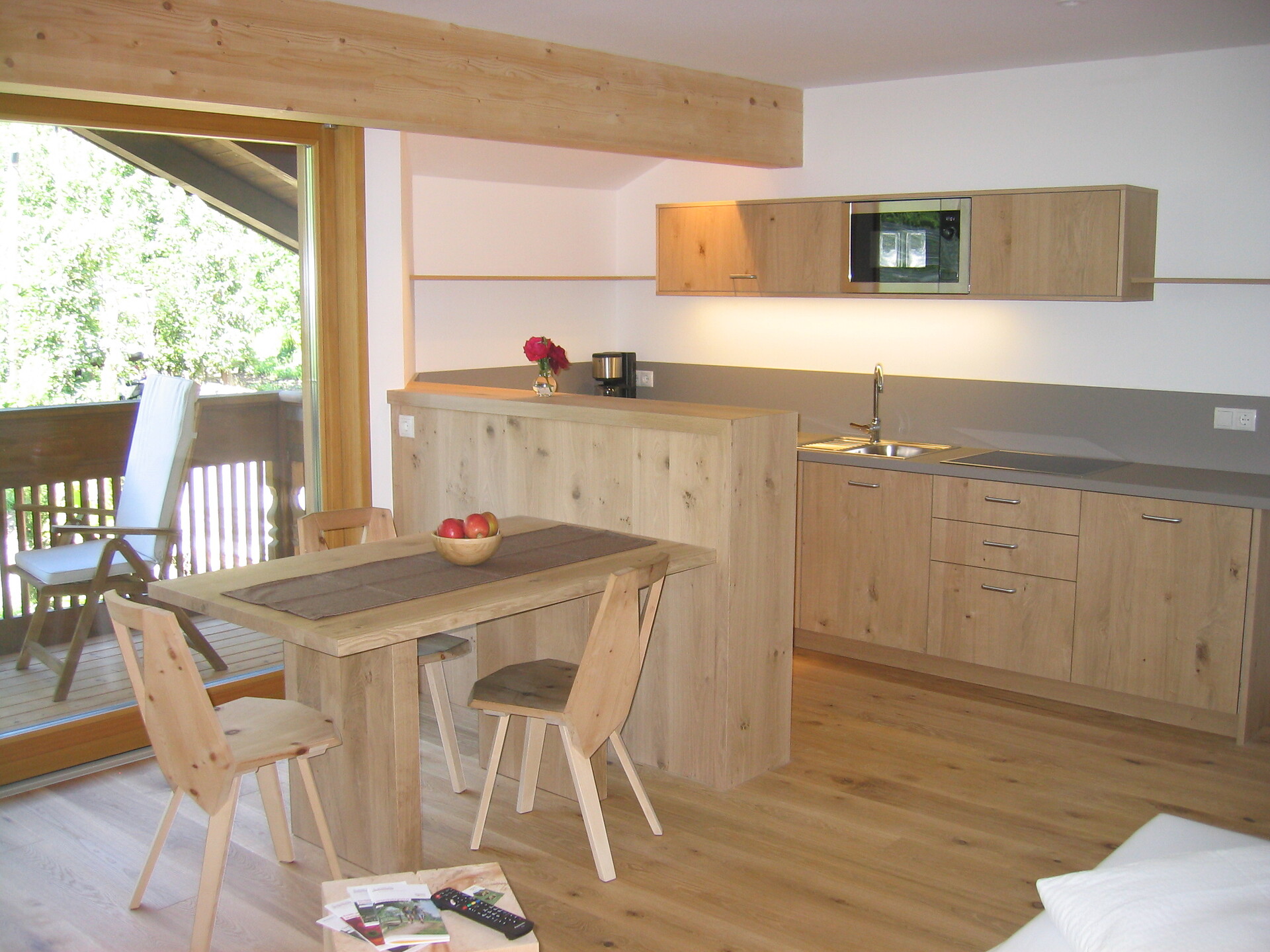 Schlafzimmer in Zirbenholz aus dem Schnalstal, Wohnzimmer im Eiche natur, Böden in Eiche natur. Die Küche ist funktionell eingerichtet, mit Ceran-.Kochfeld, Geschirrspüler, Kaffemaschine, Kühlschrank, Mikrowelle und Wasserkocher, die Badeoase mit großer flächenbündiger Dusche, Badetisch Wc und Föhn.