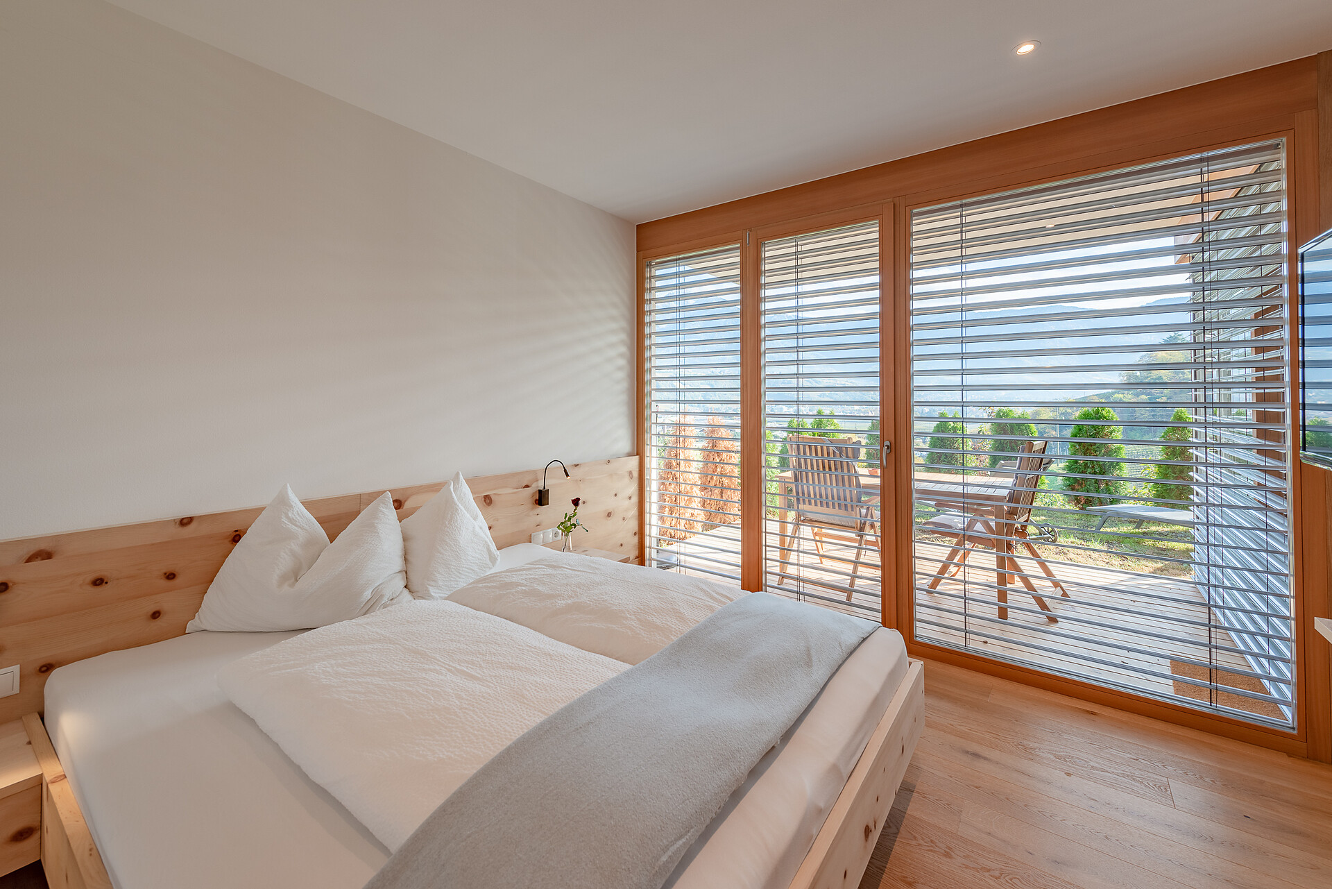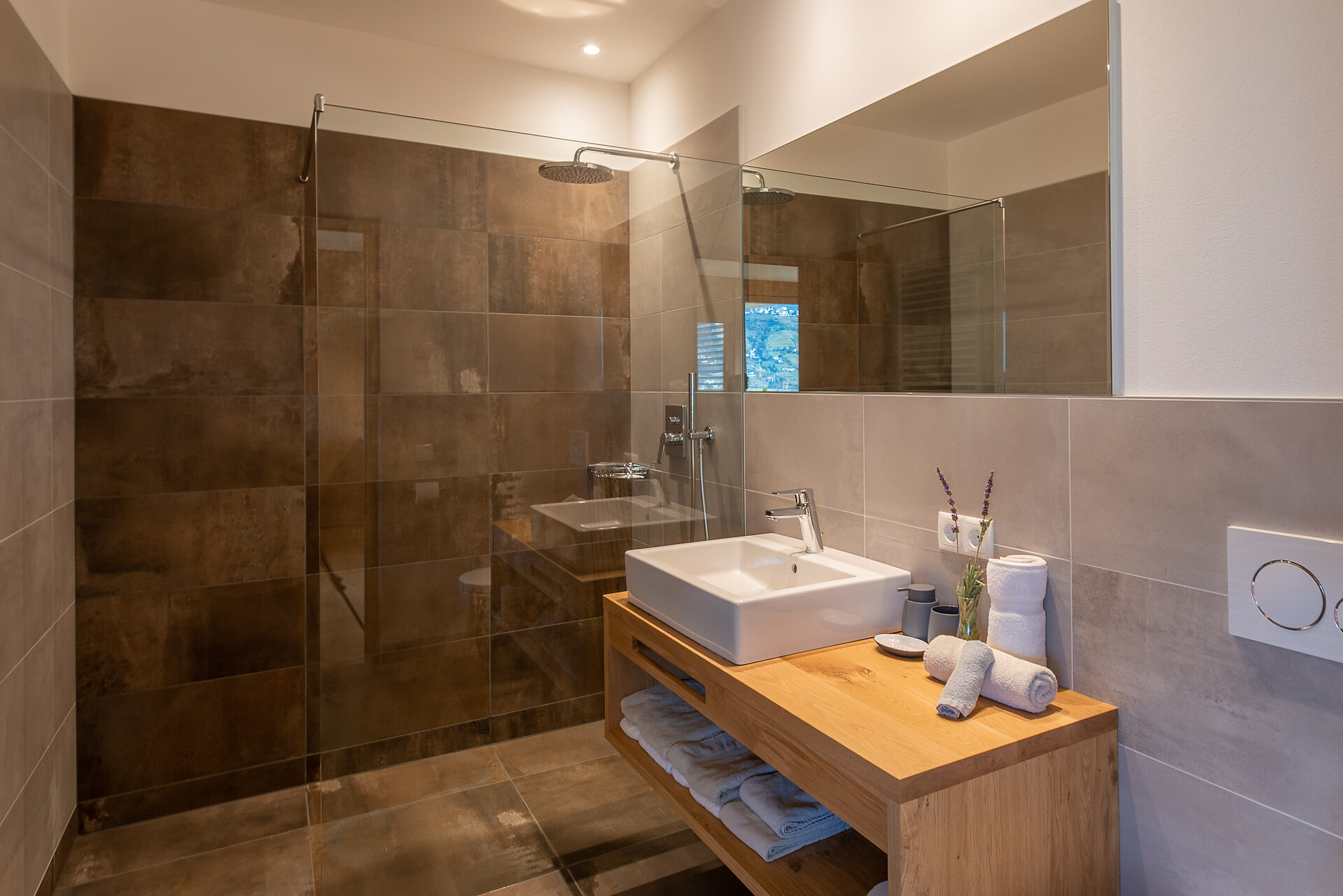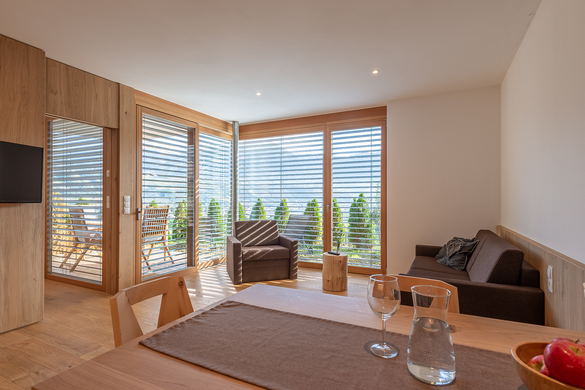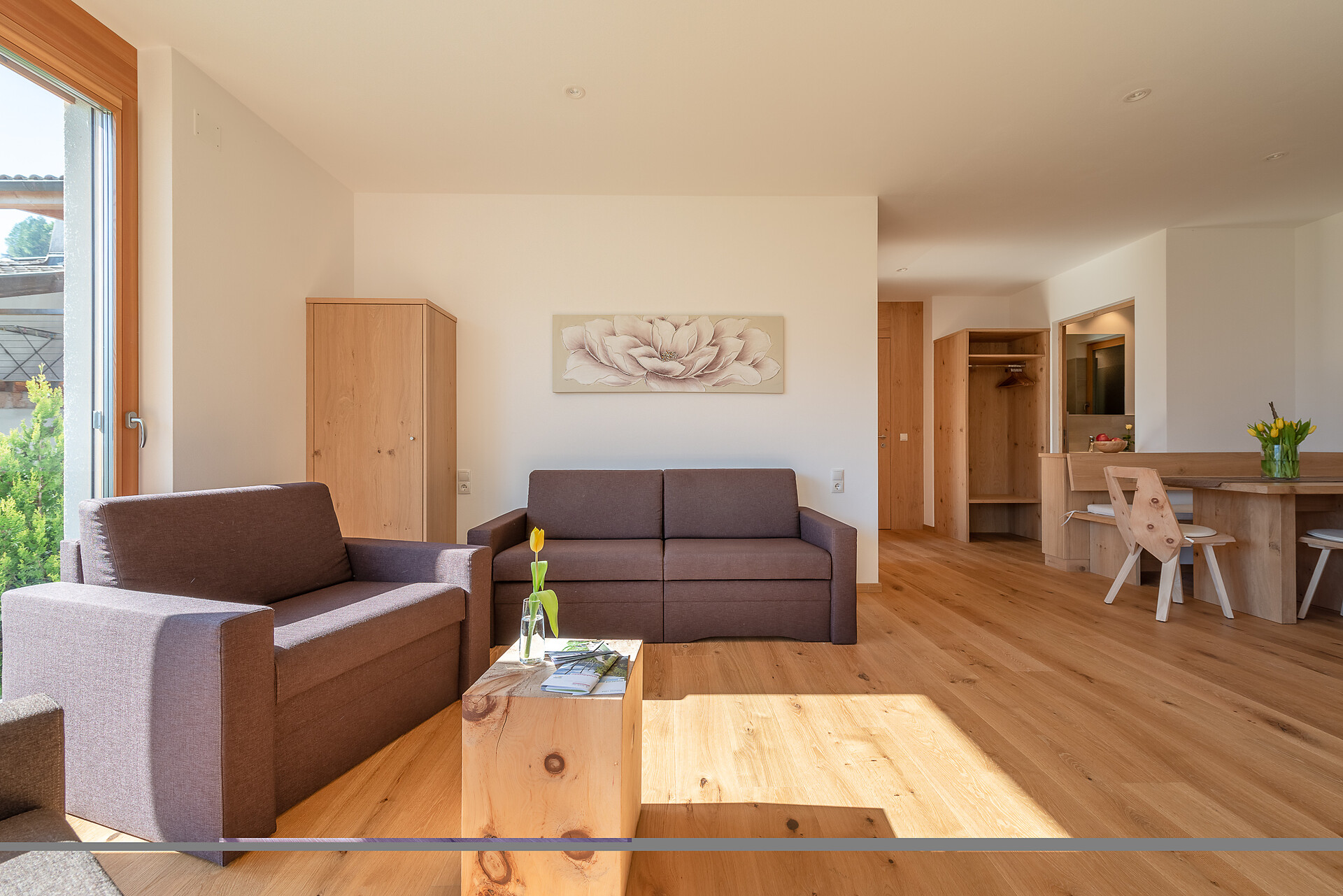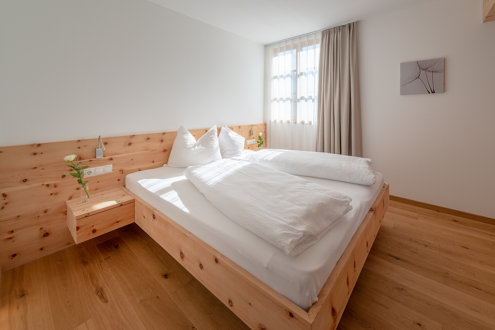 Schlafzimmer in Zirbenholz aus dem Schnalstal, Wohnzimmer im Eiche natur, Böden in Eiche natur. Die Küche ist funktionell eingerichtet, mit Ceran-.Kochfeld, Geschirrspüler, Kaffemaschine, Kühlschrank, Mikrowelle und Wasserkocher, die Badeoase mit großer flächenbündiger Dusche, Badetisch Wc und Föhn.