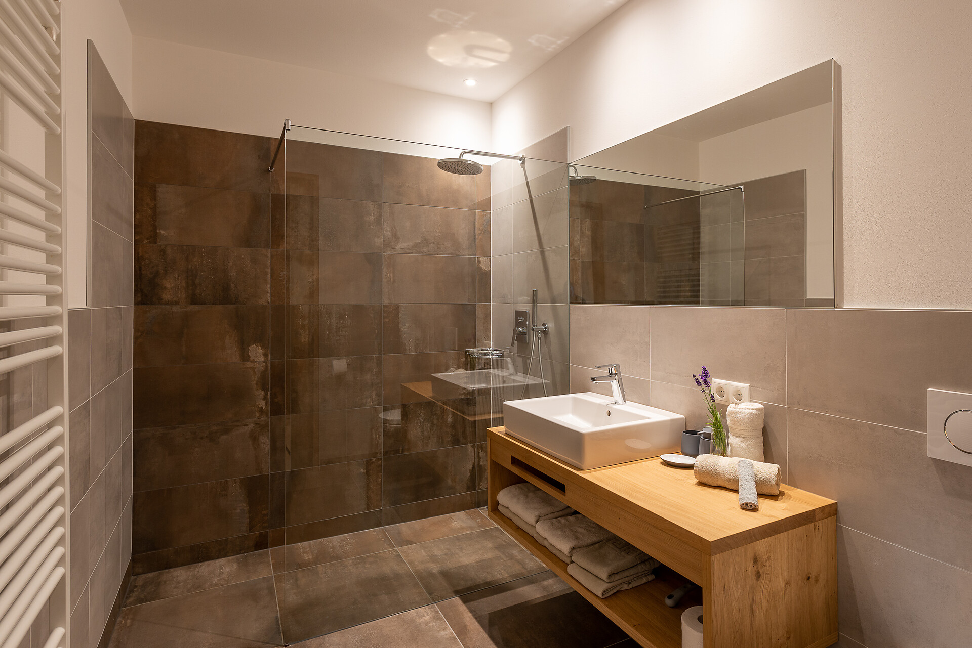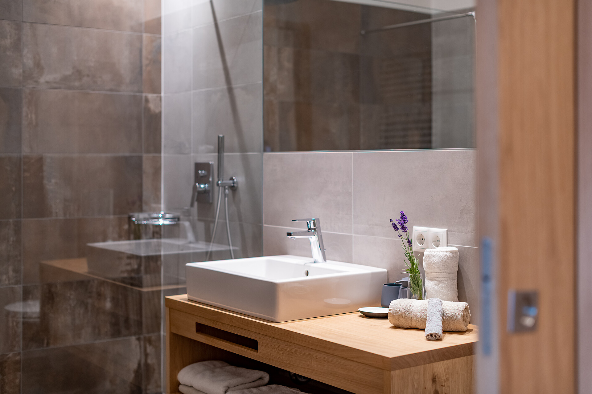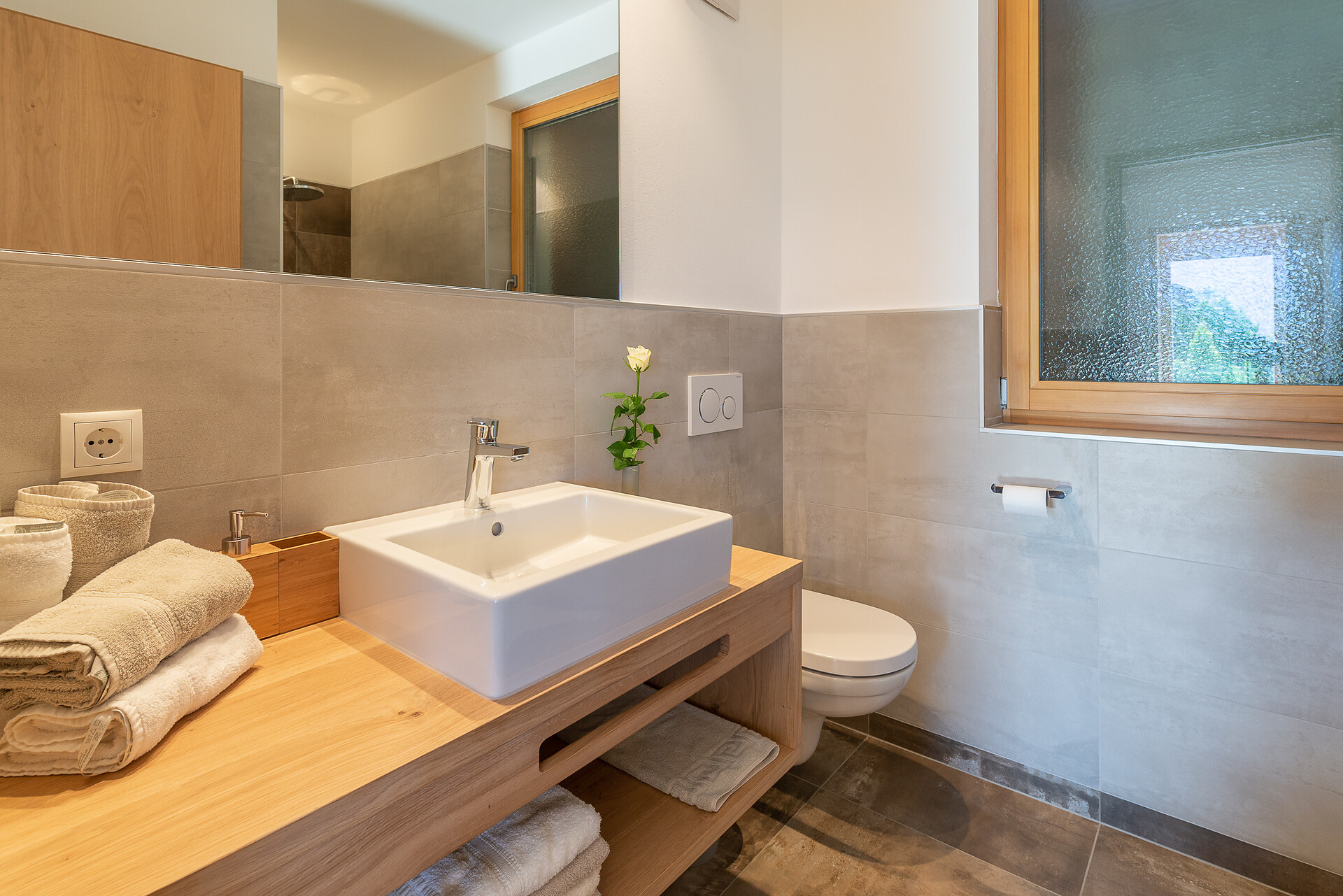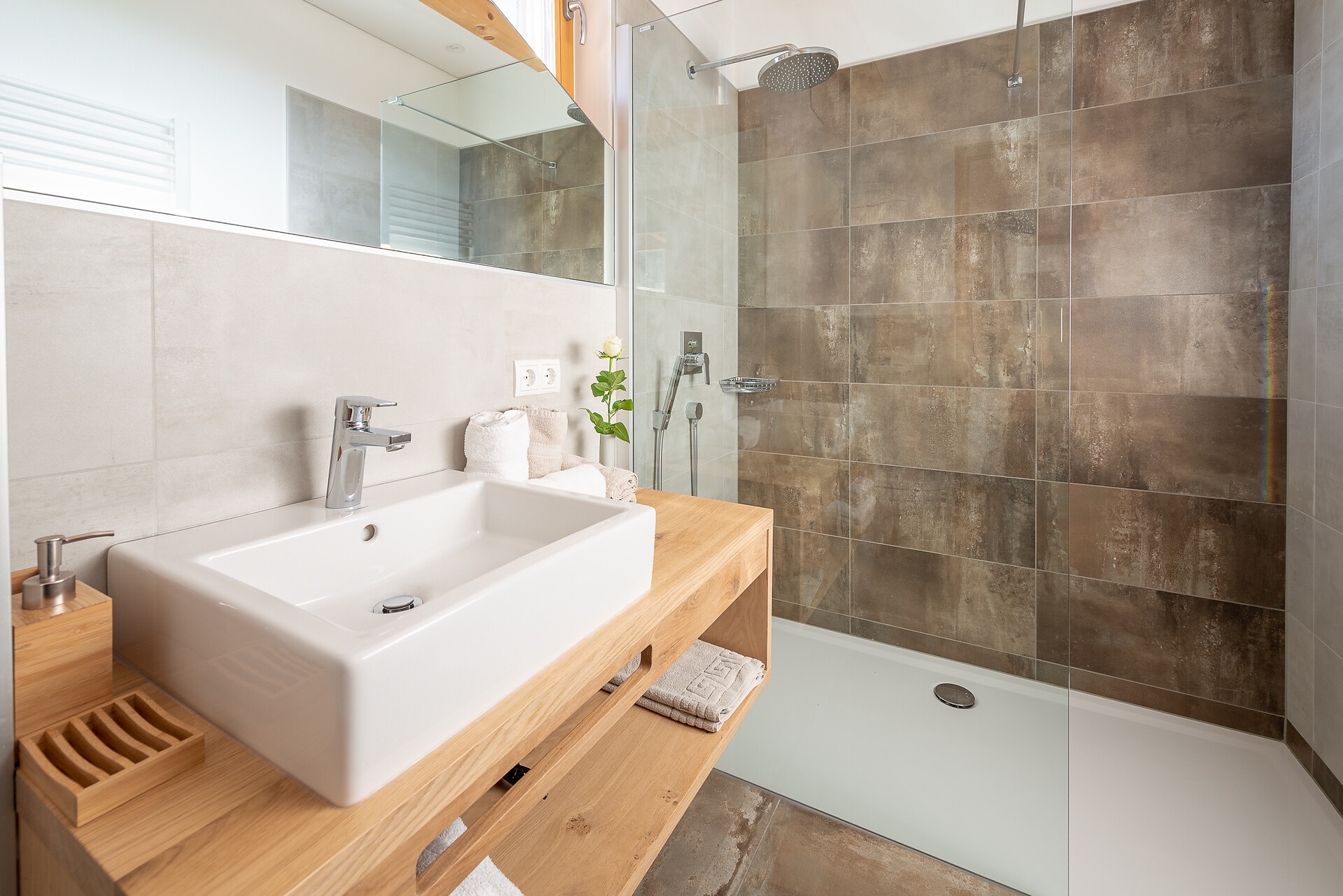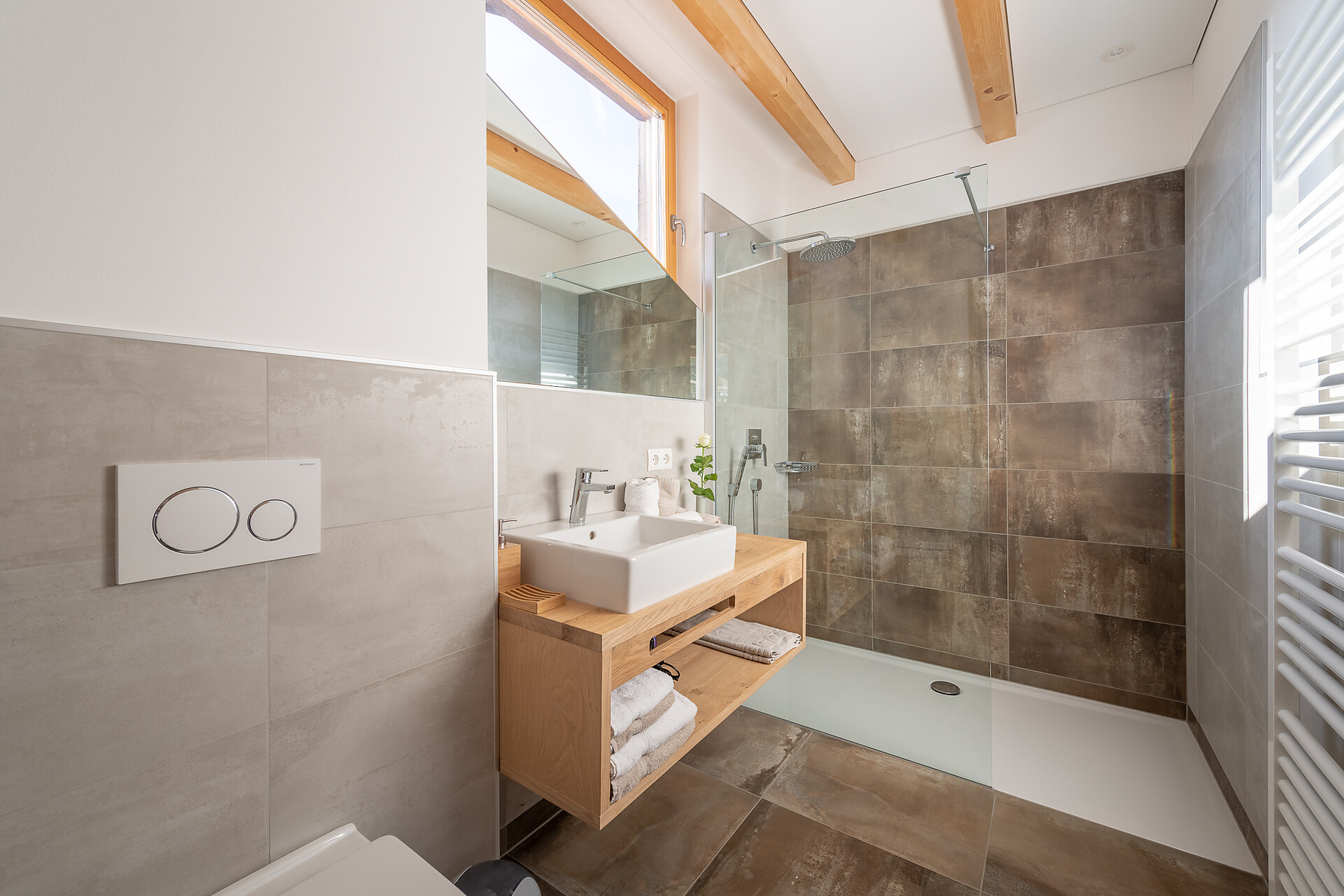 Schlafzimmer in Zirbenholz aus dem Schnalstal, Wohnzimmer im Eiche natur, Böden in Eiche natur. Die Küche ist funktionell eingerichtet, mit Ceran-.Kochfeld, Geschirrspüler, Kaffemaschine, Kühlschrank, Mikrowelle und Wasserkocher, die Badeoase mit großer flächenbündiger Dusche, Badetisch Wc und Föhn.