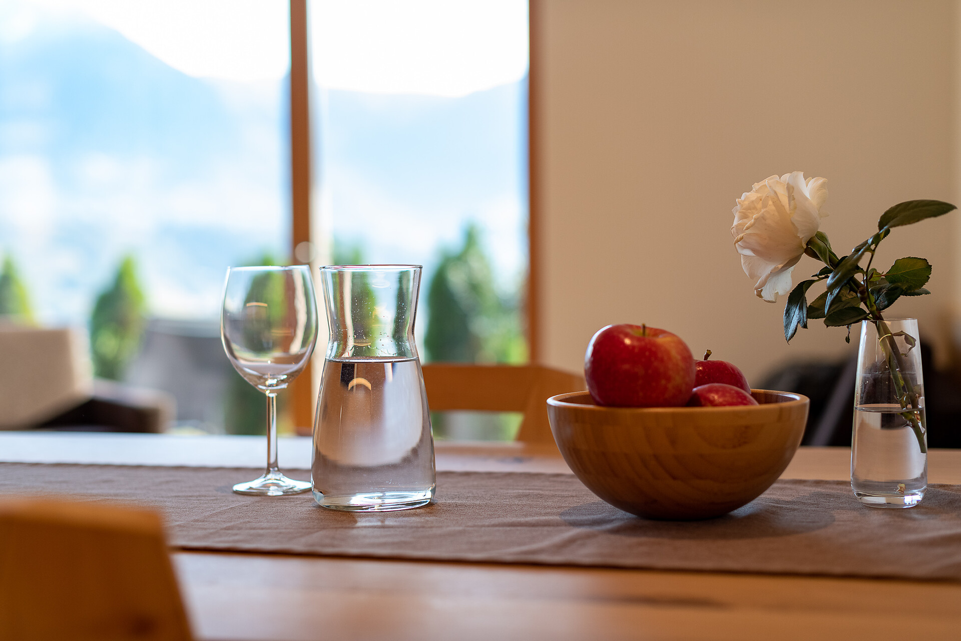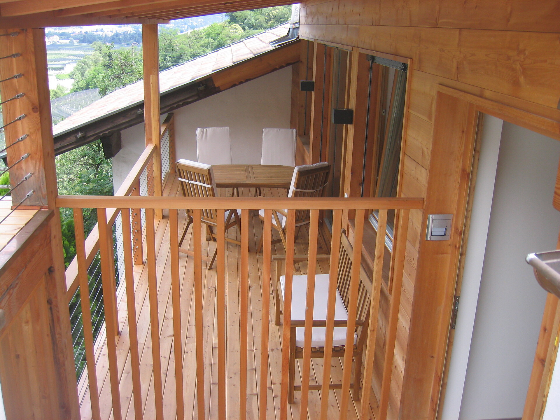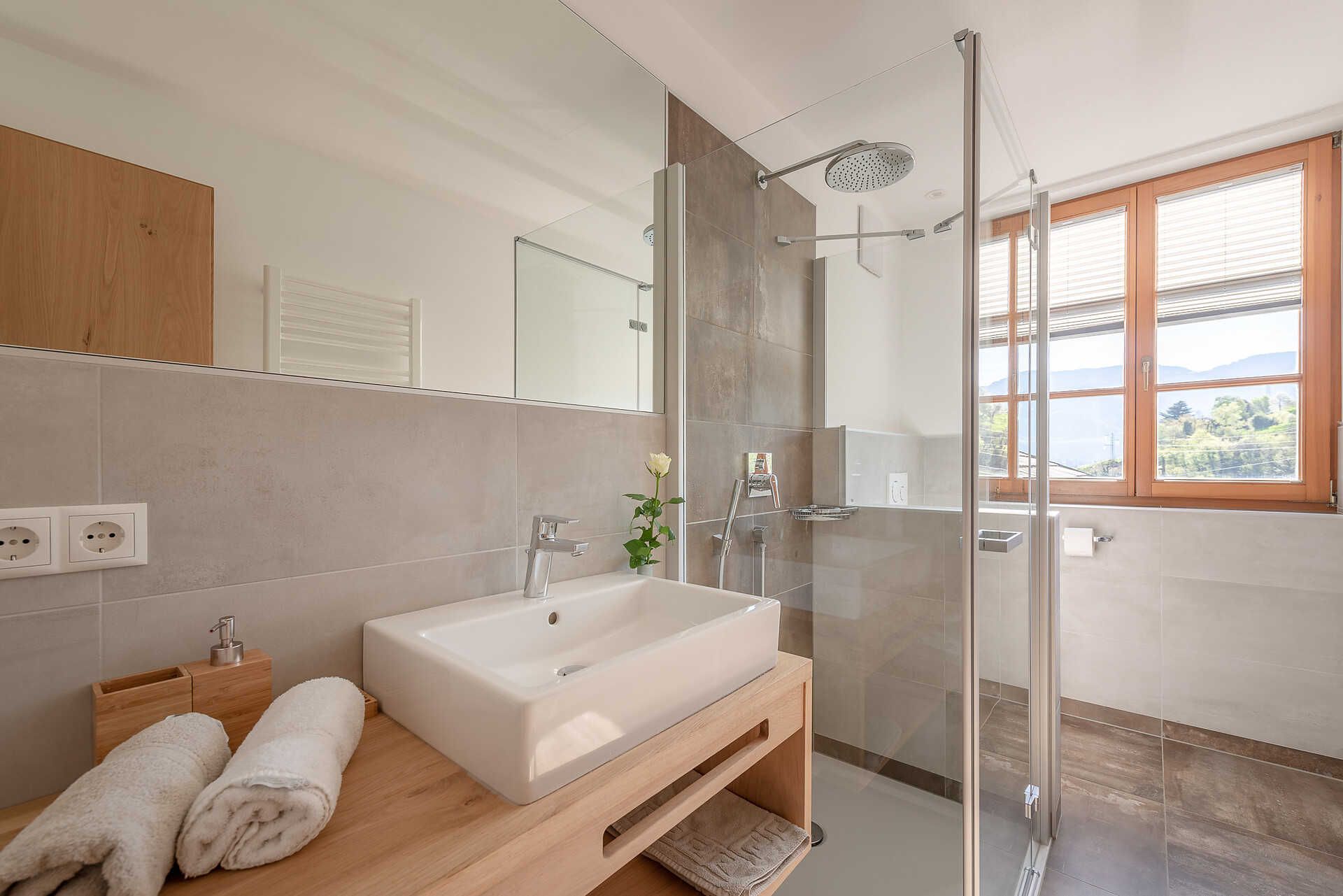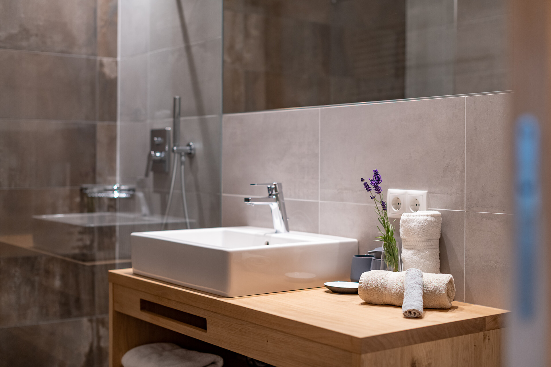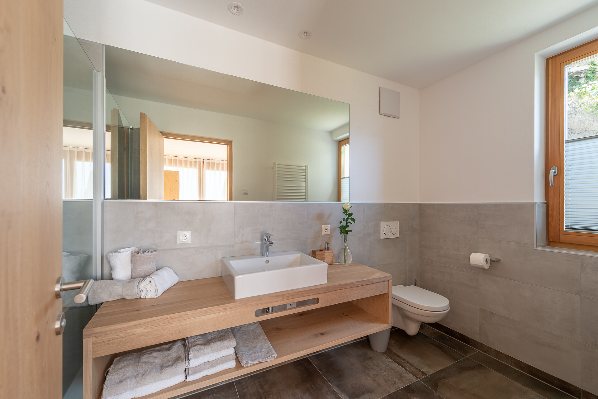 Schlafzimmer in Zirbenholz aus dem Schnalstal, Wohnzimmer im Eiche natur, Böden in Eiche natur. Die Küche ist funktionell eingerichtet, mit Ceran-.Kochfeld, Geschirrspüler, Kaffemaschine, Kühlschrank, Mikrowelle und Wasserkocher, die Badeoase mit großer flächenbündiger Dusche, Badetisch Wc und Föhn.