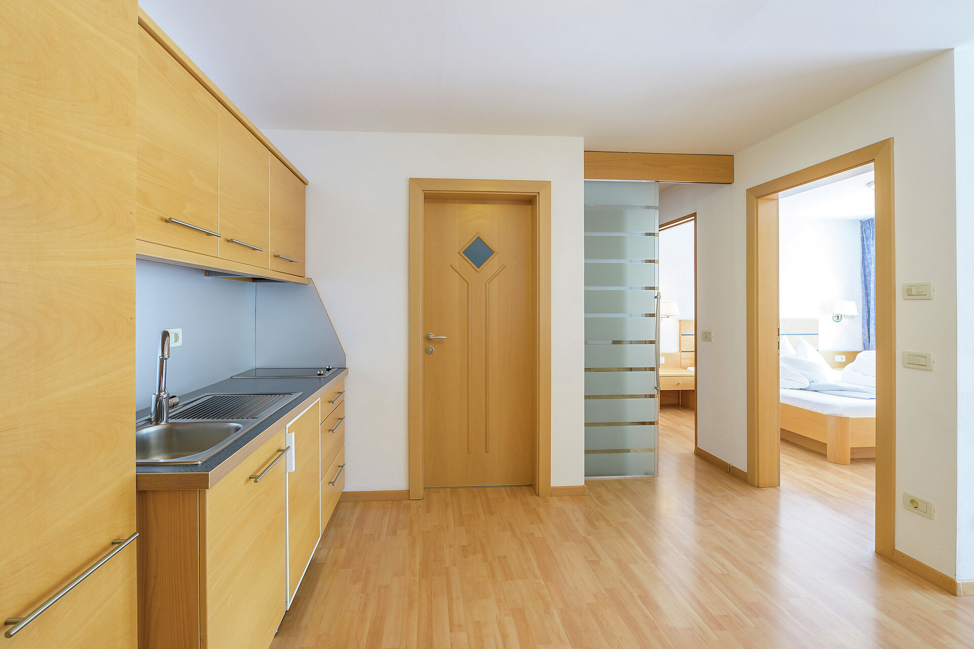 Apartment mit Klimaanlage für 2-4 Personen (ca. 45 m²) im 2. Stock der Residence Victoria, mit Wohn- und getrenntem Schlafraum, Vorraum mit bestens ausgestatteter Küchenzeile, Badezimmer mit WC, Dusche, teils Bidet, Föhn, Sat-TV, Telefon, WLAN und Internetanschluss, Safe, Garagenplatz, Bettwäsche, Hand- und Badetücher.