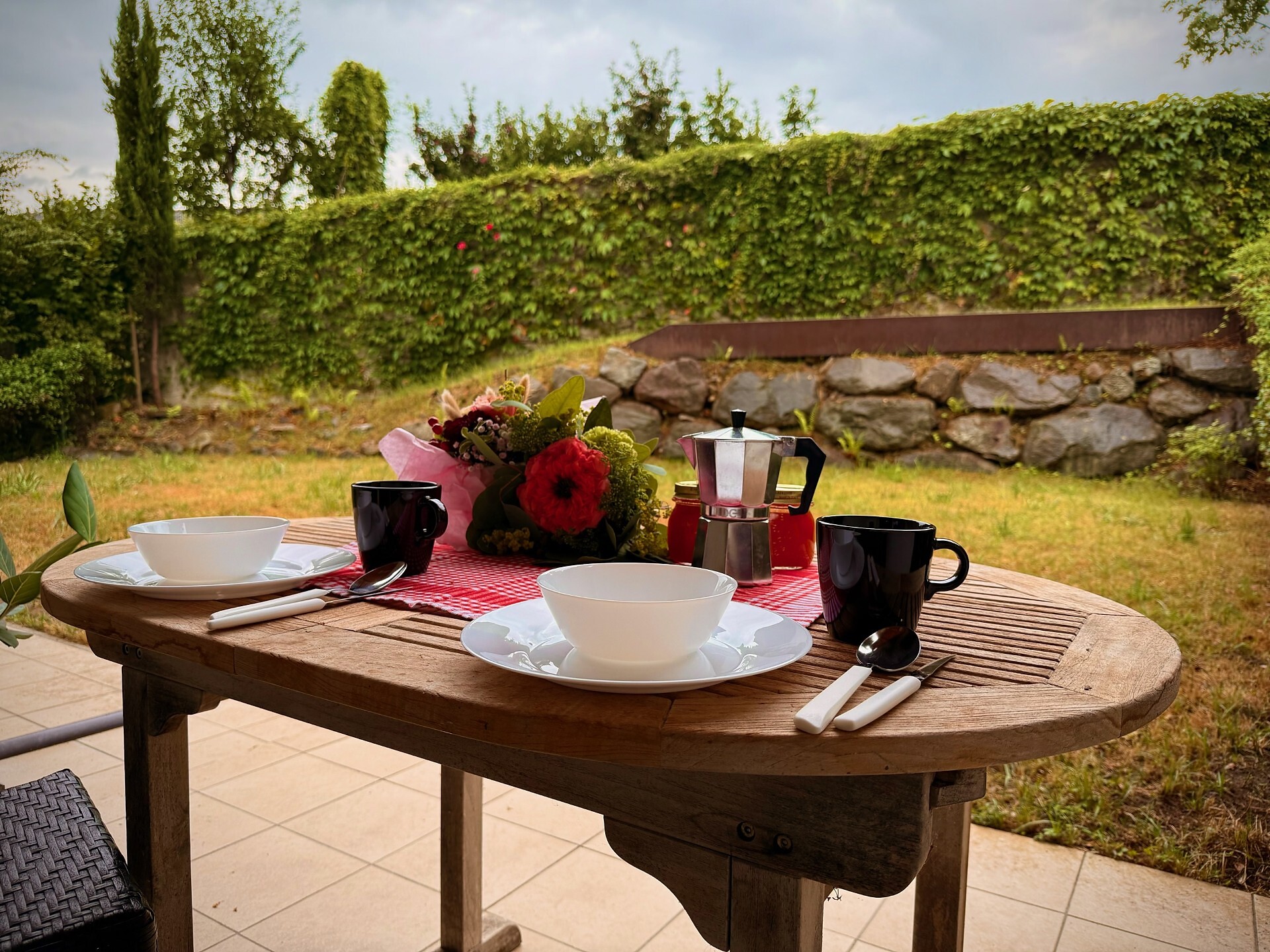 Nette Wohnung mit privatem Garten und privater Garage in der Nähe von Meran. 4 Betten, Bad, Küche.