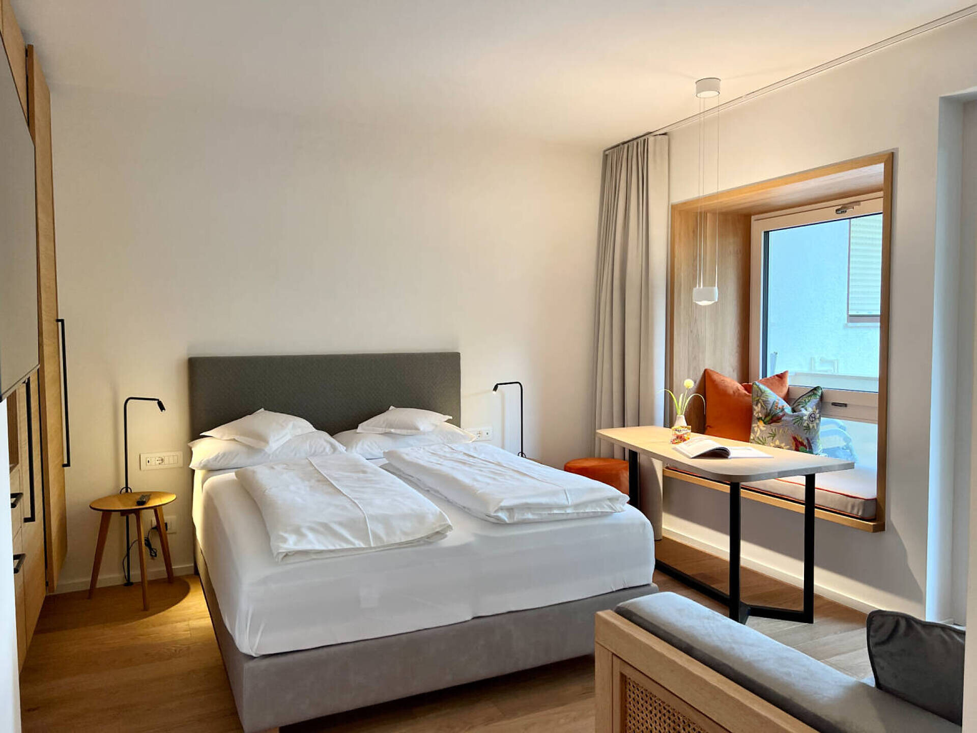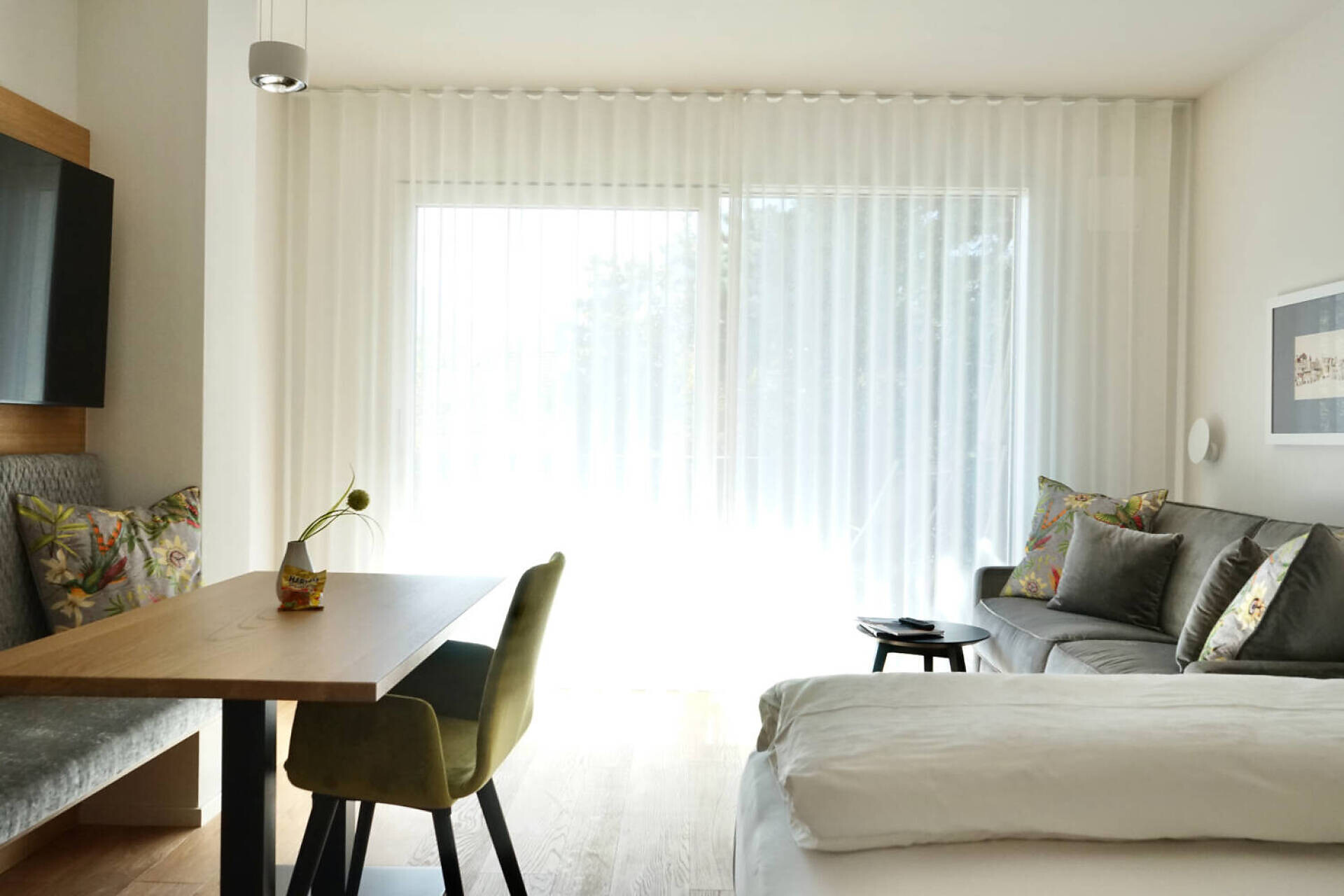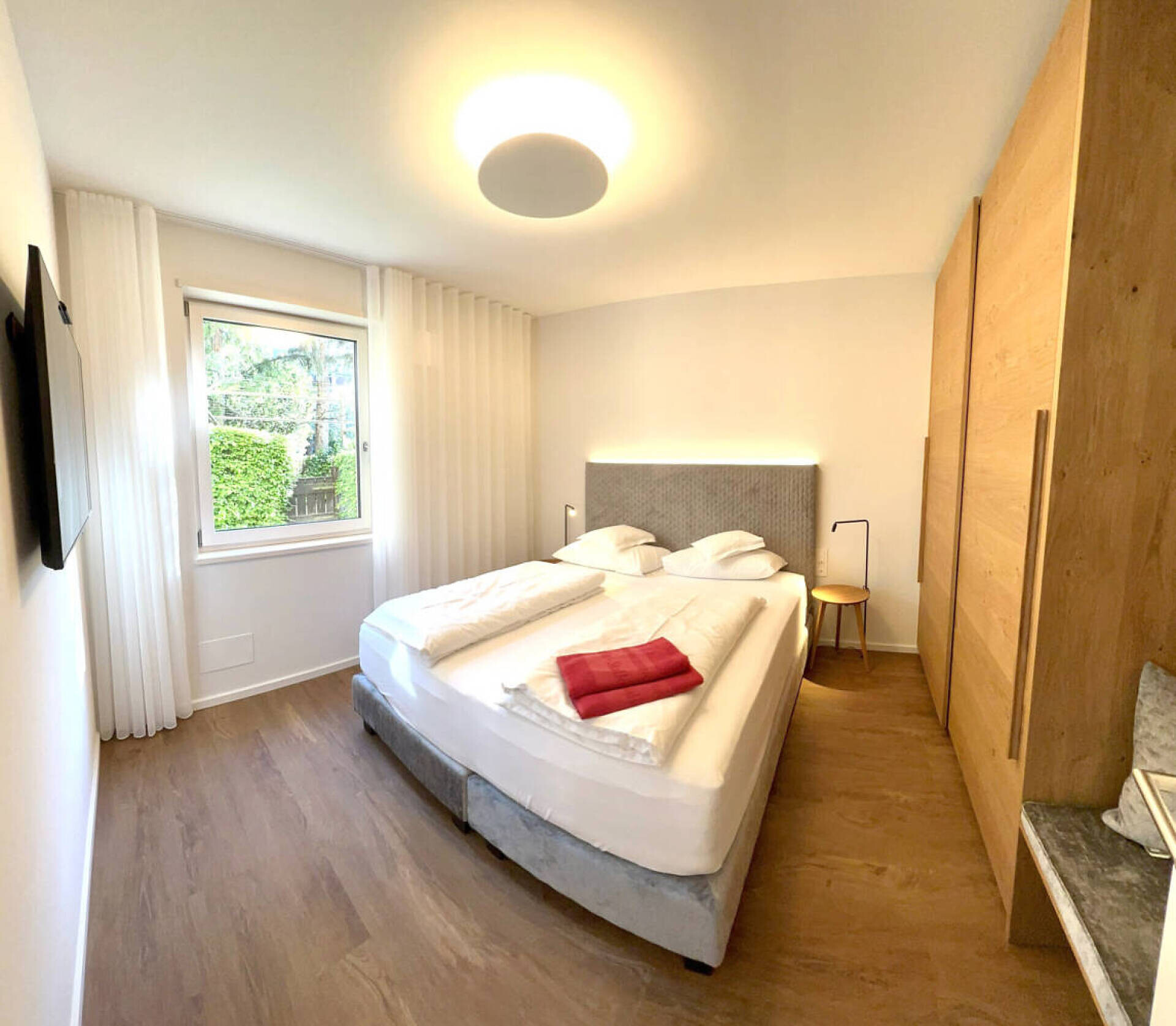 biogeölter Eichenboden, hochwertiges Boxspringbett 1,60 m Breite, Fenstersitzerker mit Tisch, Divan, Tv 43", DAB-Radio, Telefon, Safe, Küchenzeile, Badezimmer mit Fenster, Dusche, Wc, Föhn, Nordbalkon 10 qm mit seitlichem Gartenblick, Wäscheständer, wlan