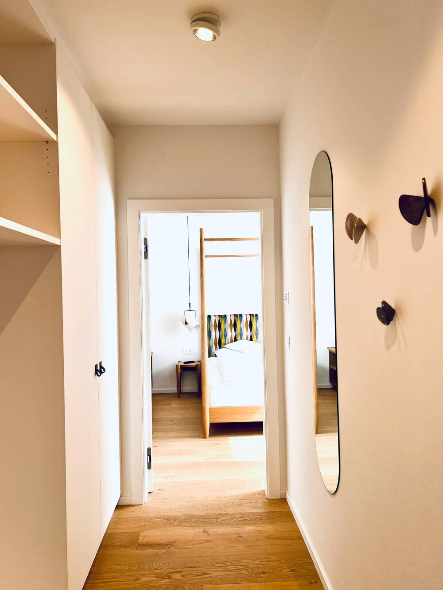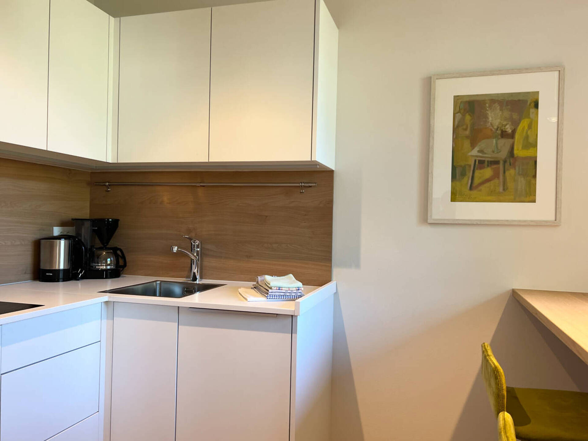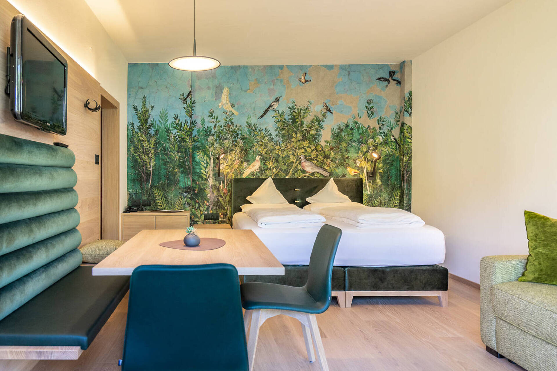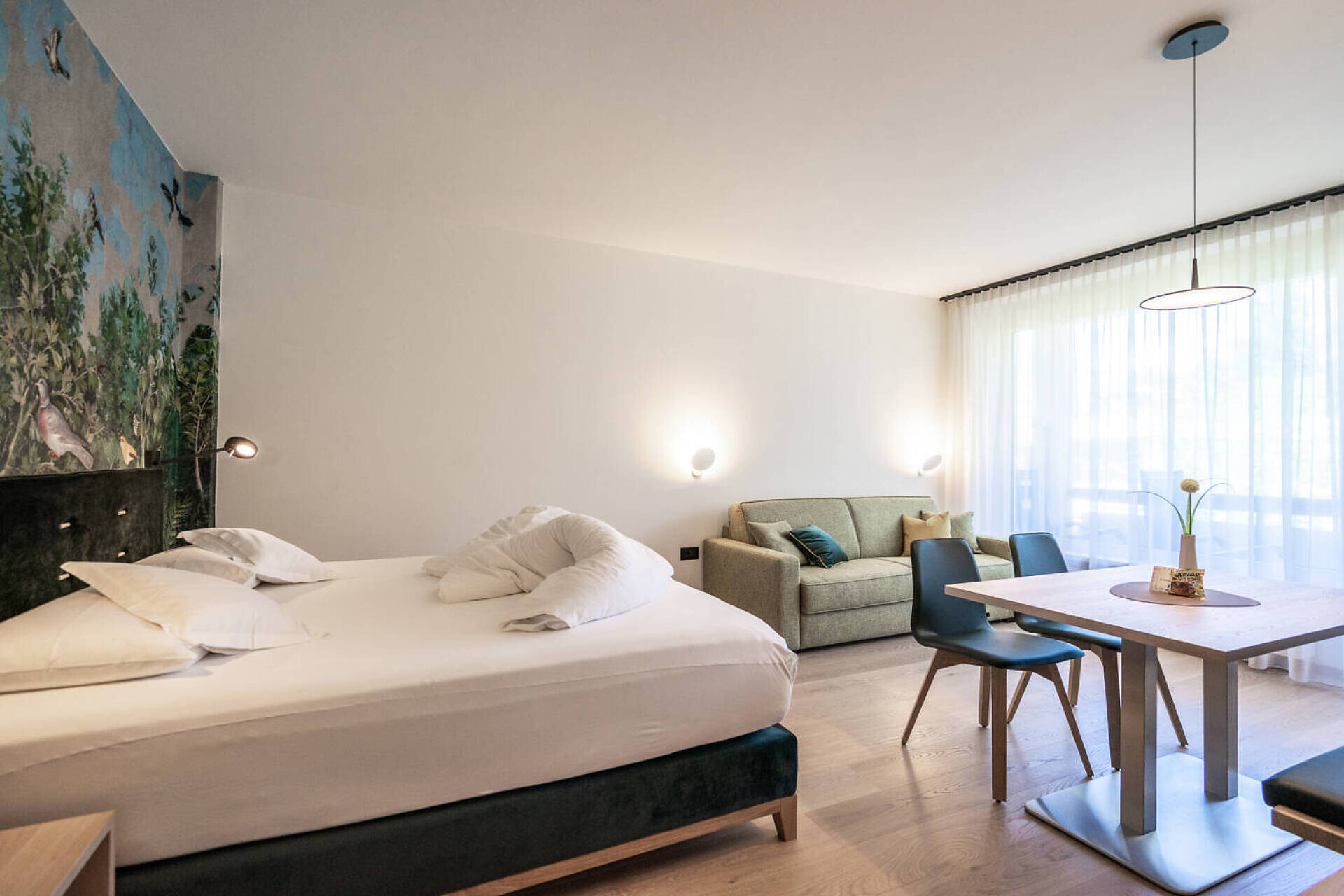 biogeölter Eichenboden, hochwertiges Boxspringbett 1,60 m Breite, Fenstersitzerker mit Tisch, Divan, Tv 43", DAB-Radio, Telefon, Safe, Küchenzeile, Badezimmer mit Fenster, Dusche, Wc, Föhn, Nordbalkon 10 qm mit seitlichem Gartenblick, Wäscheständer, wlan