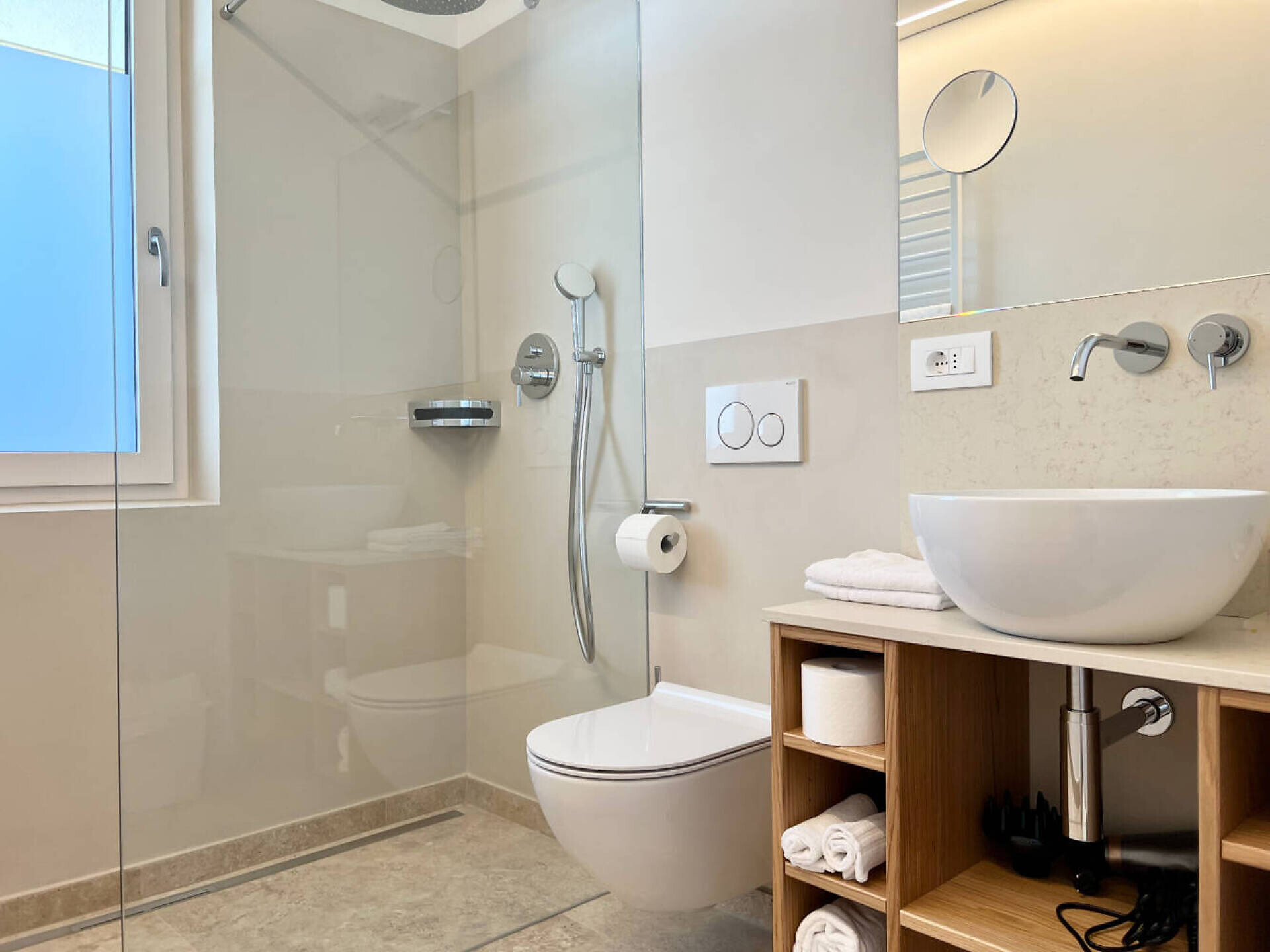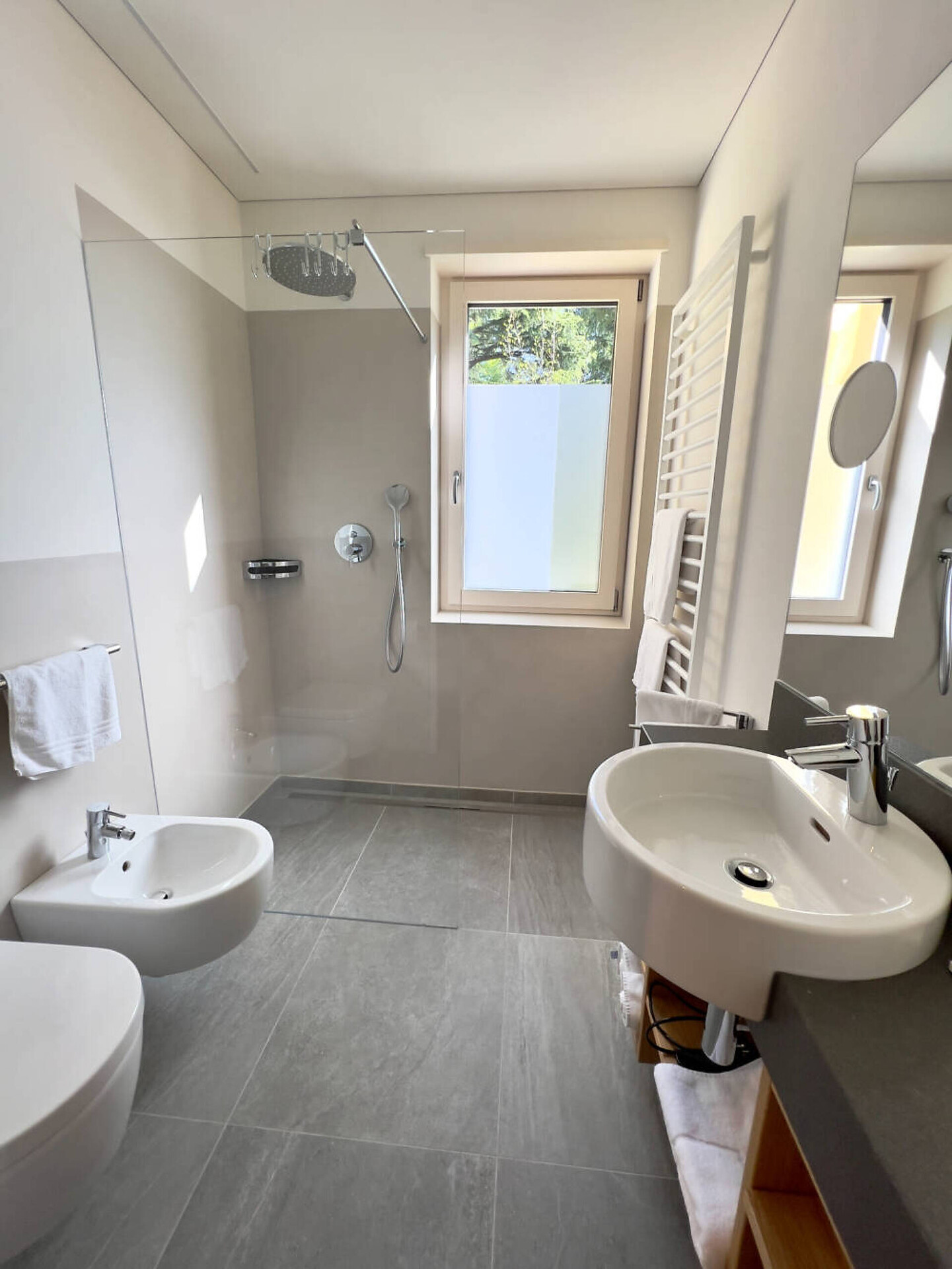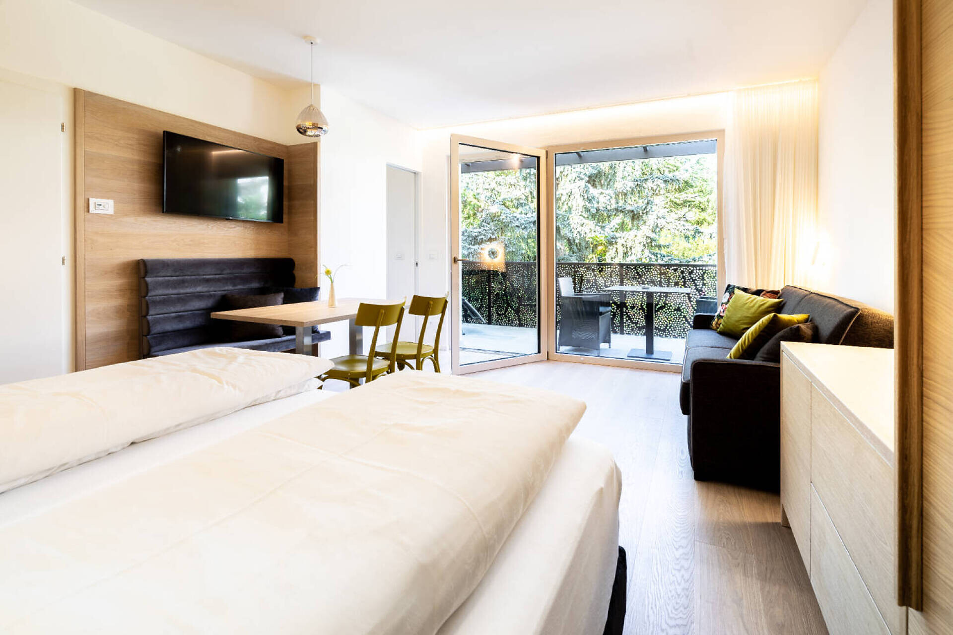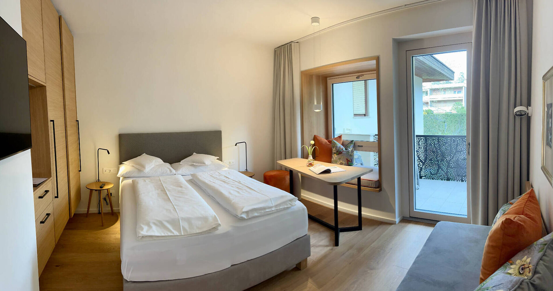 NUOVO: camera-salotto con letto matrimoniale boxspring di altissima qualitá, divano (= letto matrim. 160 cm), tv 50", panca, tavolo e sedie, bagno con doccia, water, fon, grande balcone 10 m² tranquillo o piccolo giardinetto 18 m² con sole la mattina, con tavolino, sedie e sdrai; tv, DAB-radio, telefono e cassaforte, stendipanni, wifi