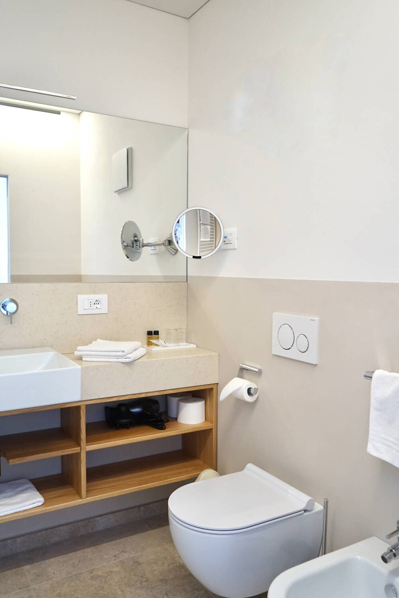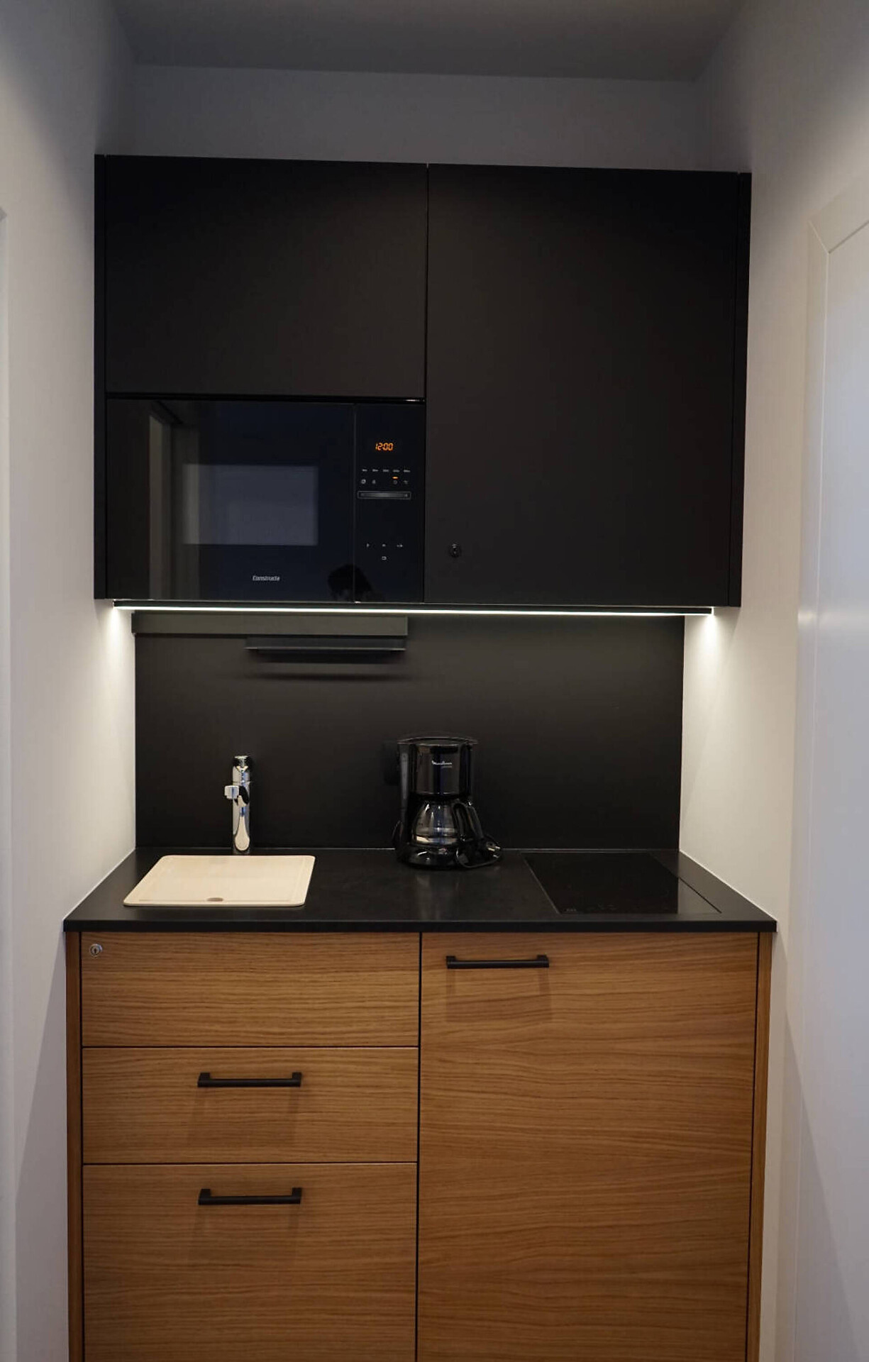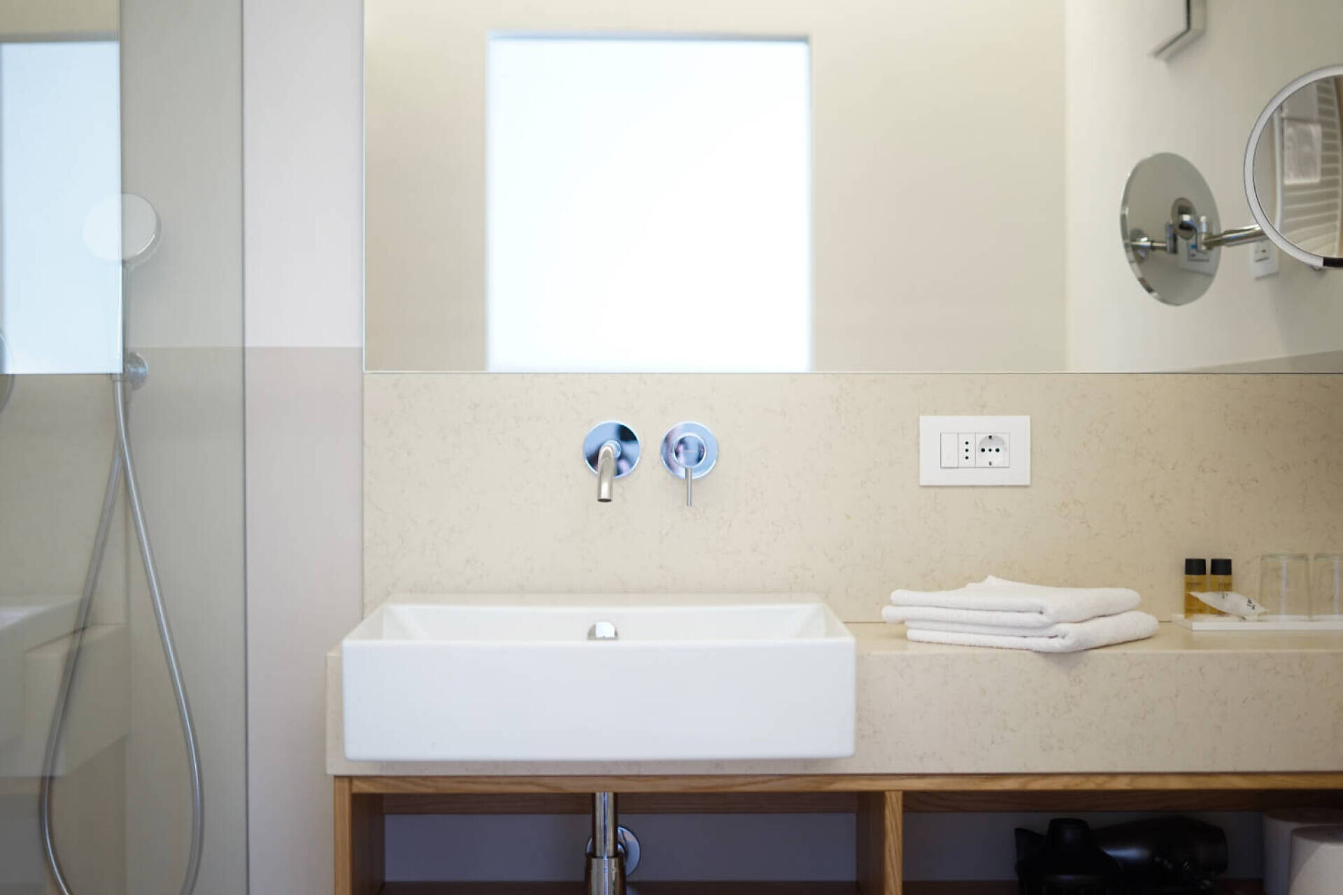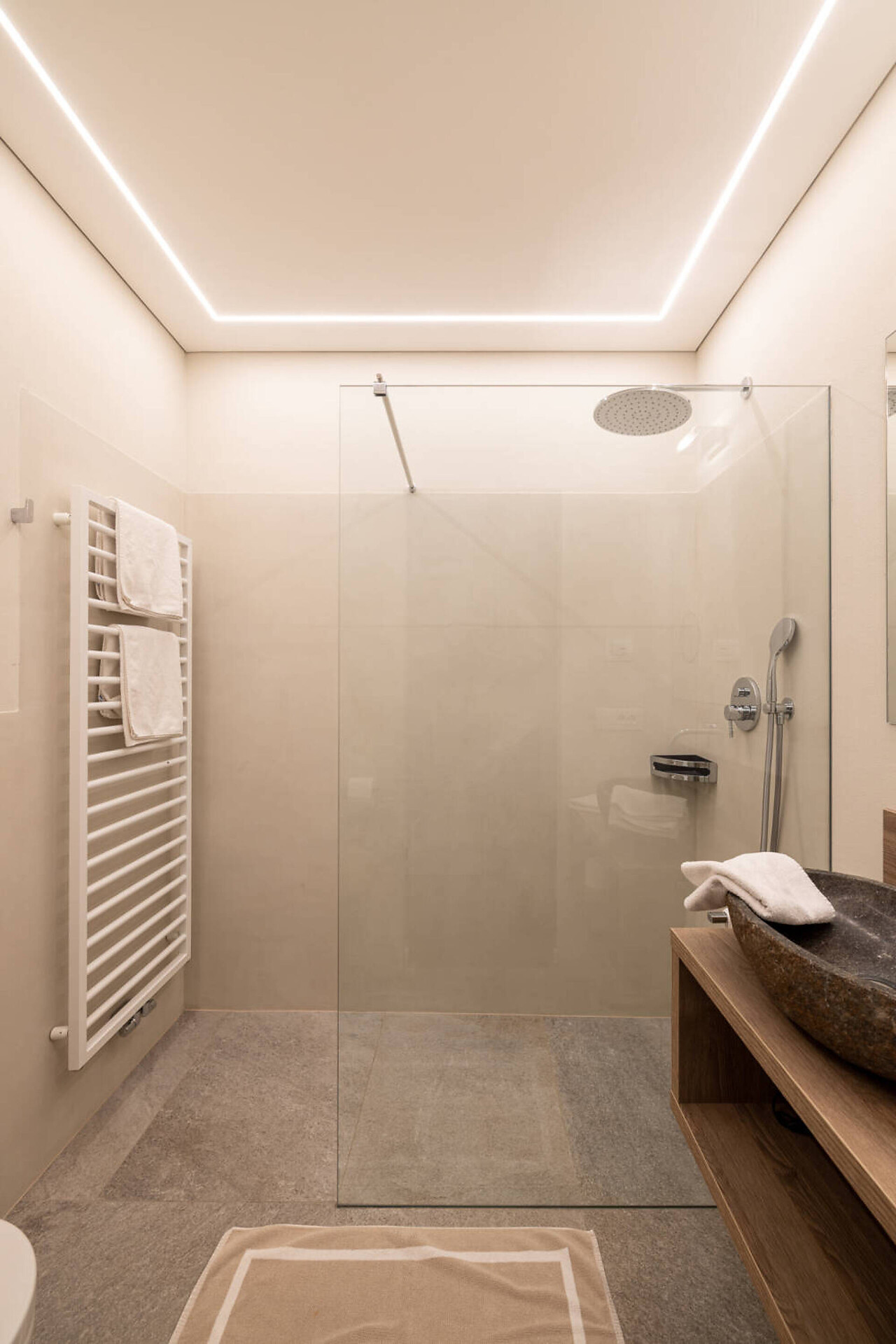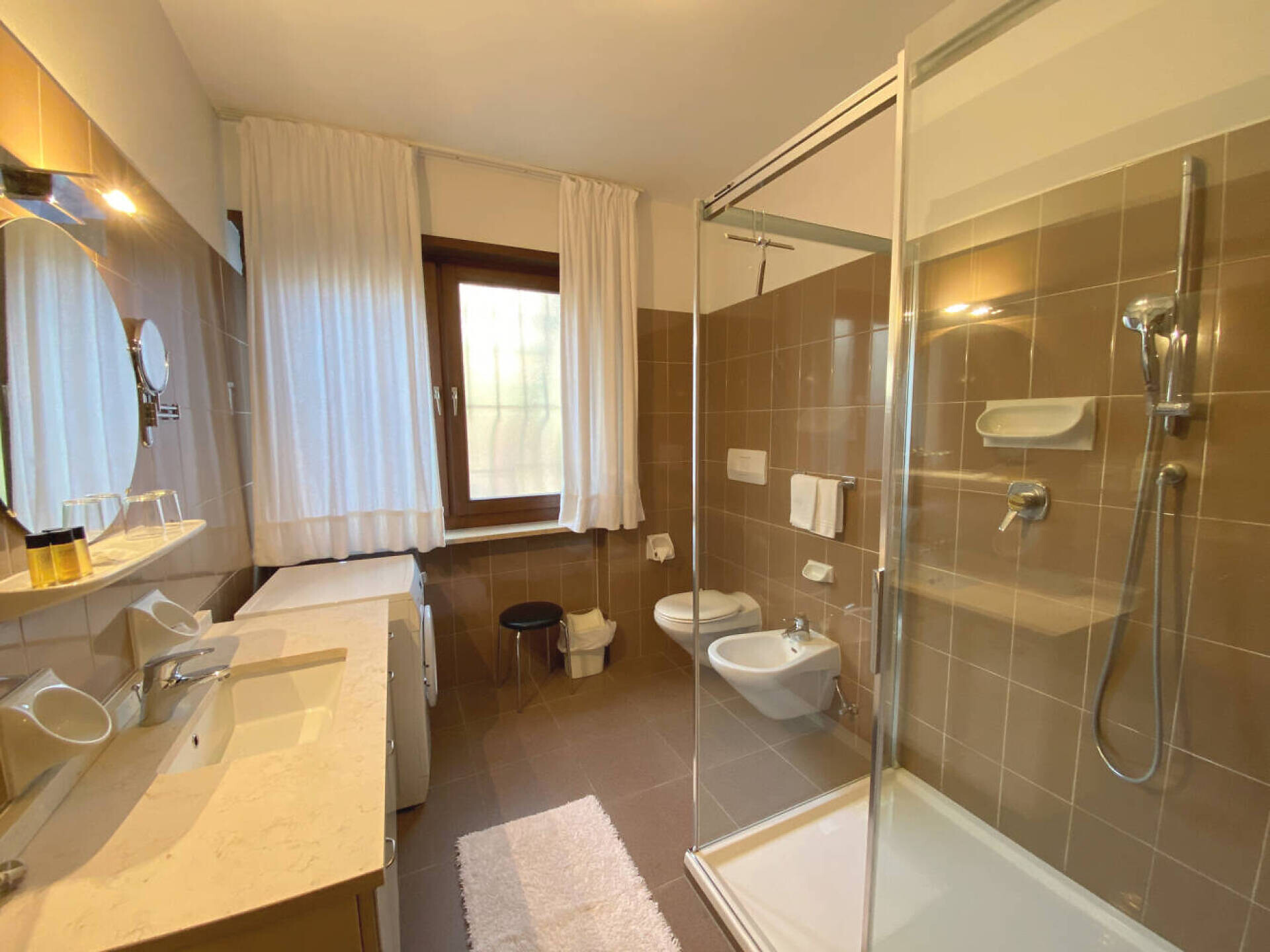 NUOVO: camera-salotto con letto matrimoniale boxspring di altissima qualitá, divano (= letto matrim. 160 cm), tv 50", panca, tavolo e sedie, bagno con doccia, water, fon, grande balcone 10 m² tranquillo o piccolo giardinetto 18 m² con sole la mattina, con tavolino, sedie e sdrai; tv, DAB-radio, telefono e cassaforte, stendipanni, wifi