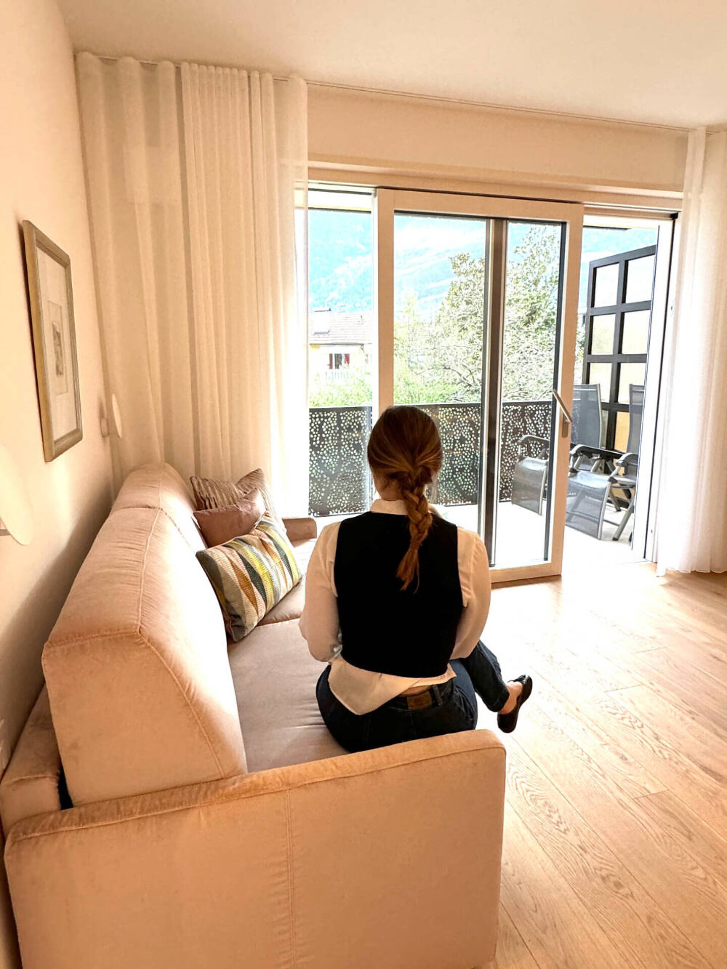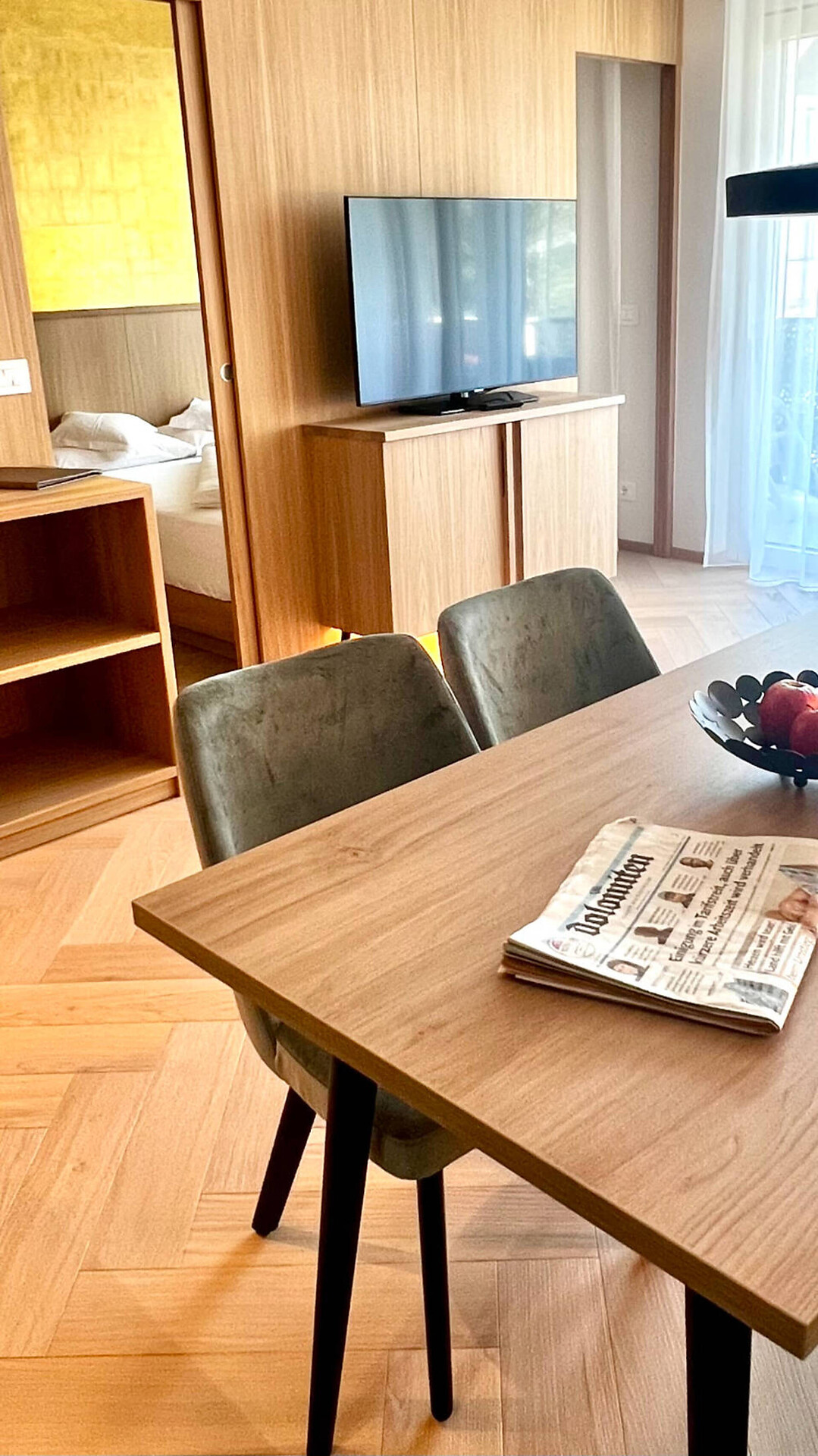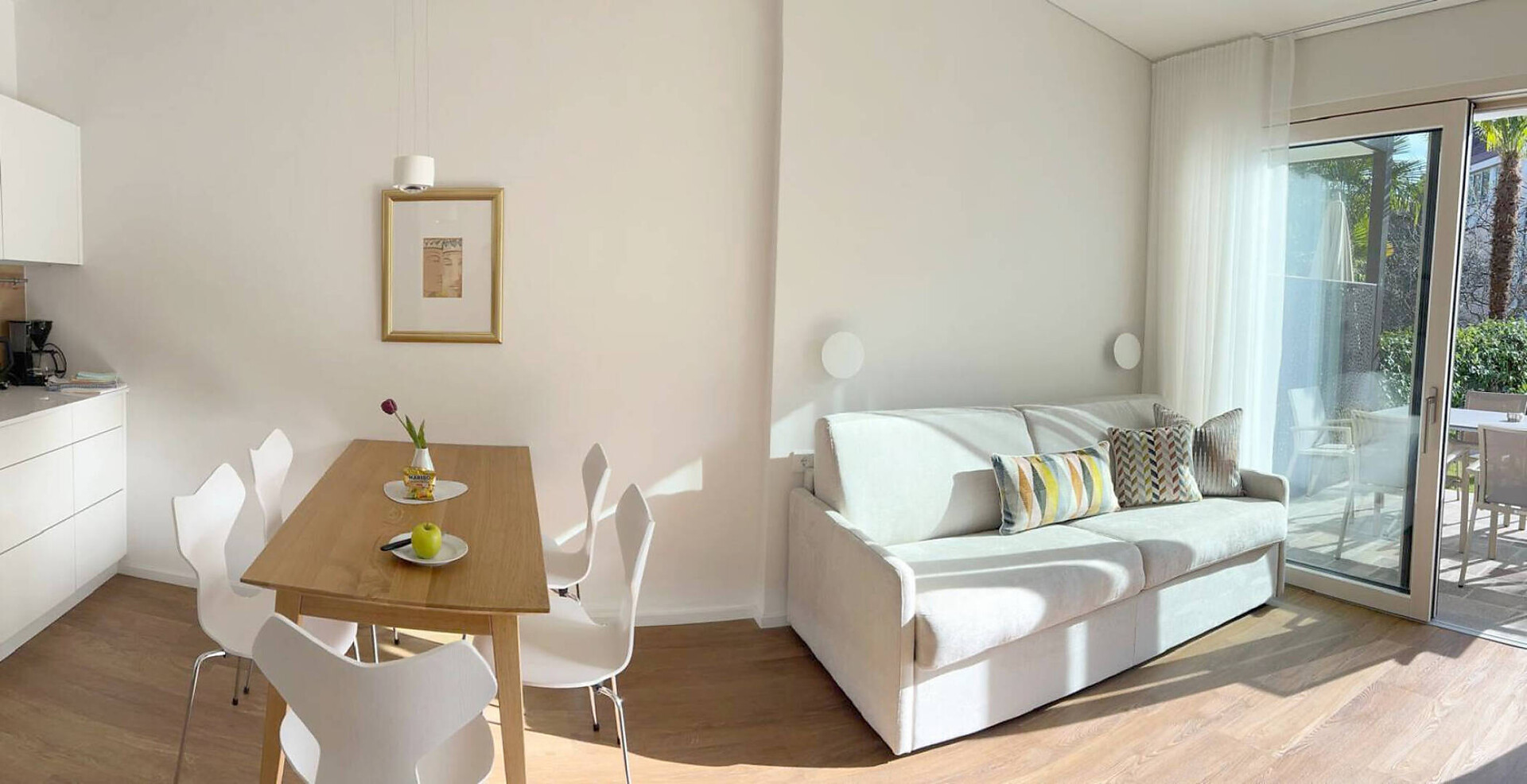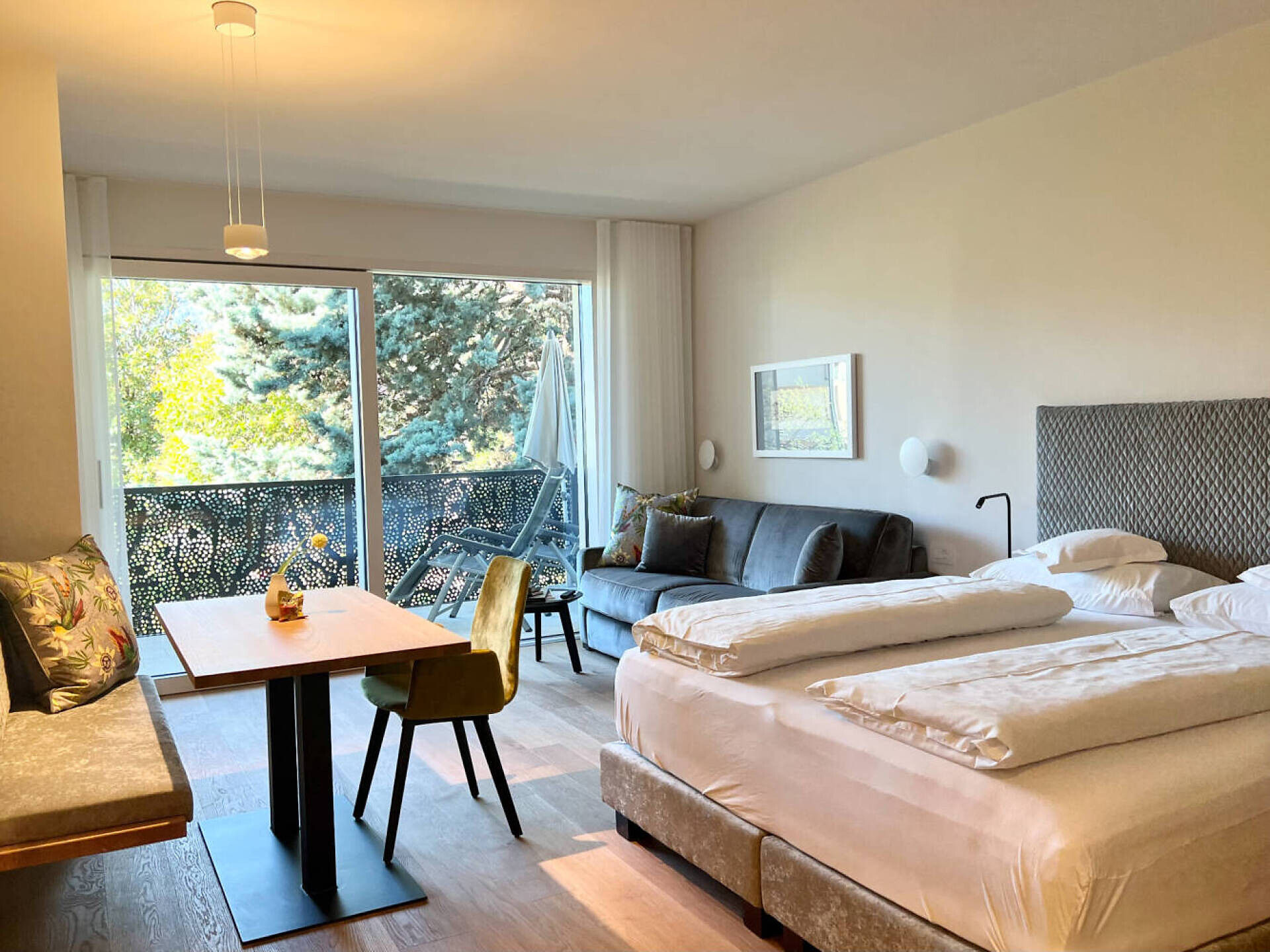 biogeölter Eichenboden, hochwertiges Boxspringbett, Esstisch und Stühlen, TV 50", Dab-Radio, Telefon, Safe, Badezimmer mit Dusche, Bidet, Wc Fön, großer Südbalkon mit Bank, Tisch, Stühlen und 2 ergonomischen Liegestühlen, Wifi, Wäscheständer, (Kleinküche gegen Gebühr dazu buchbar)