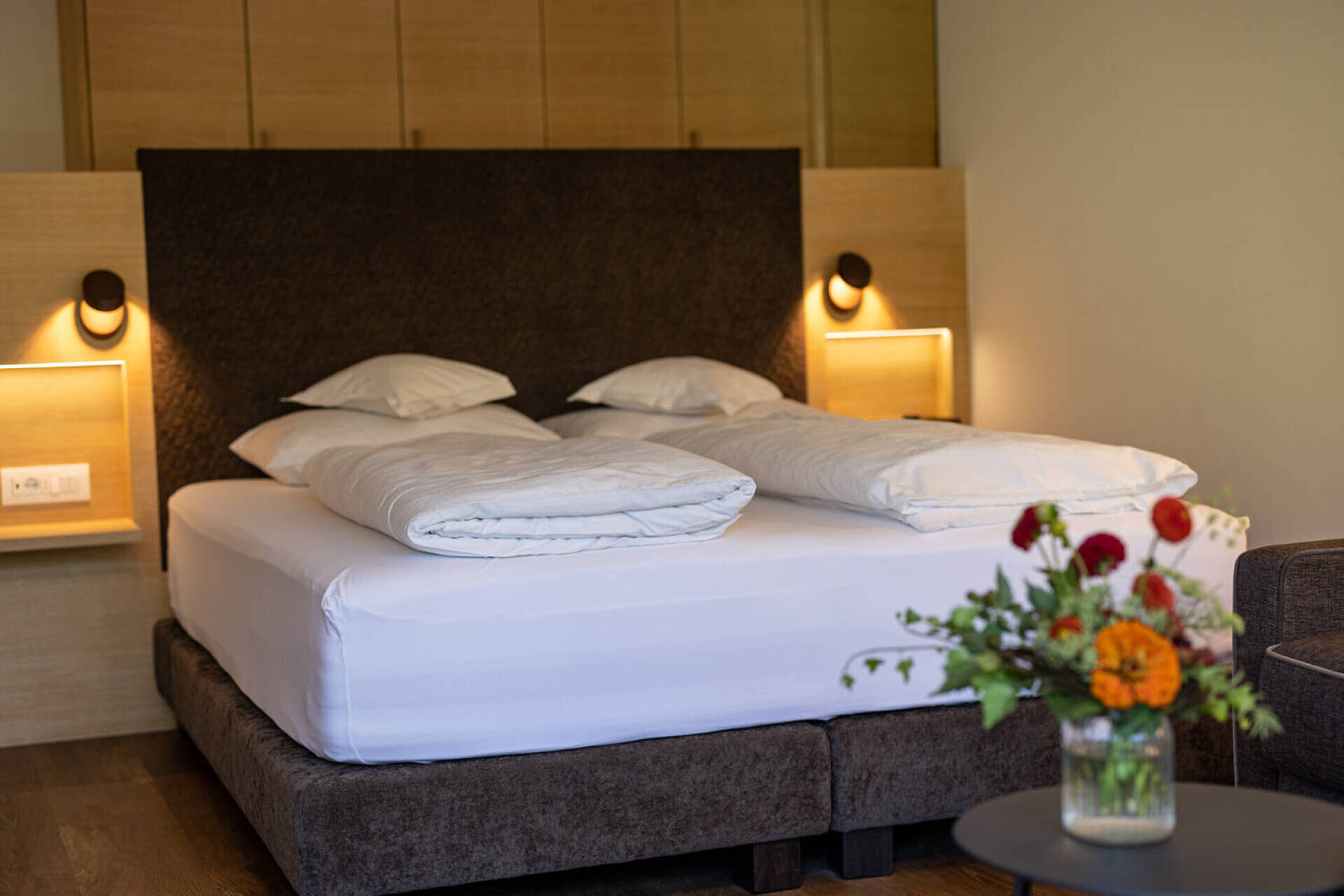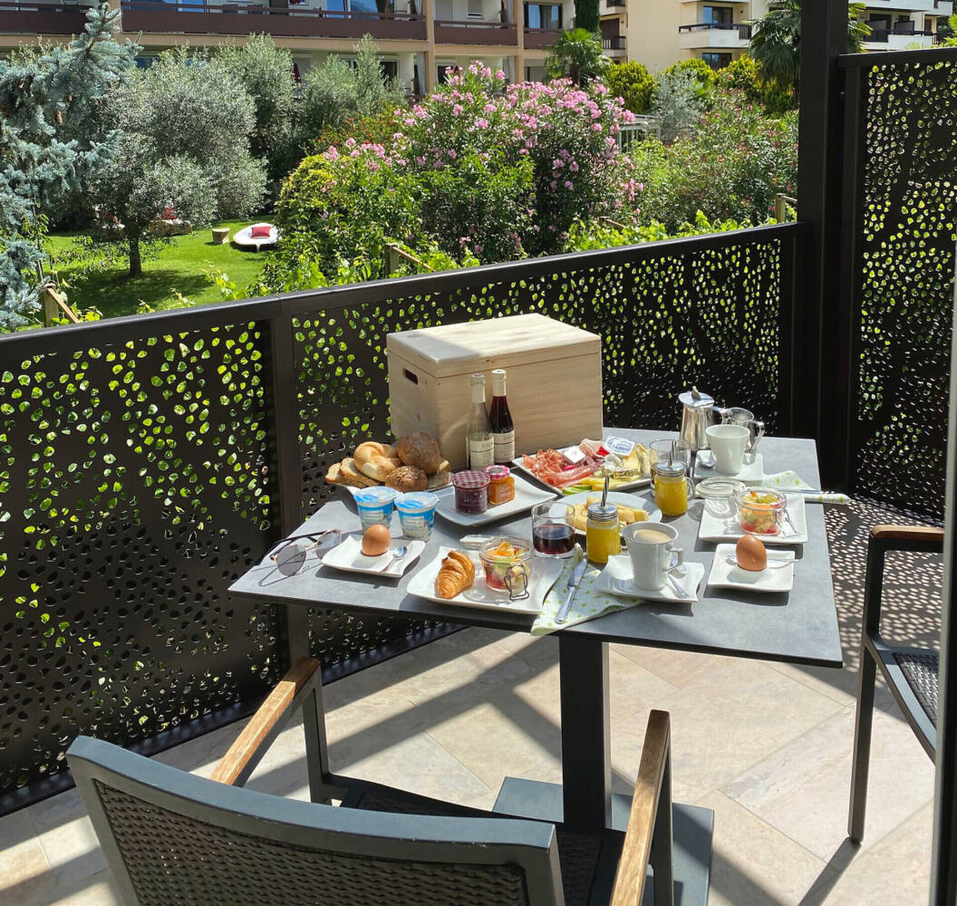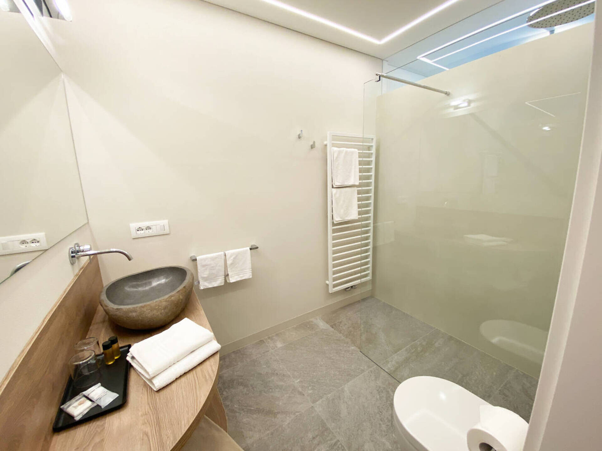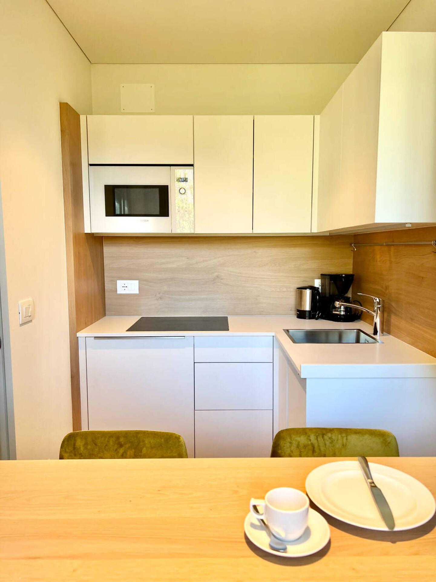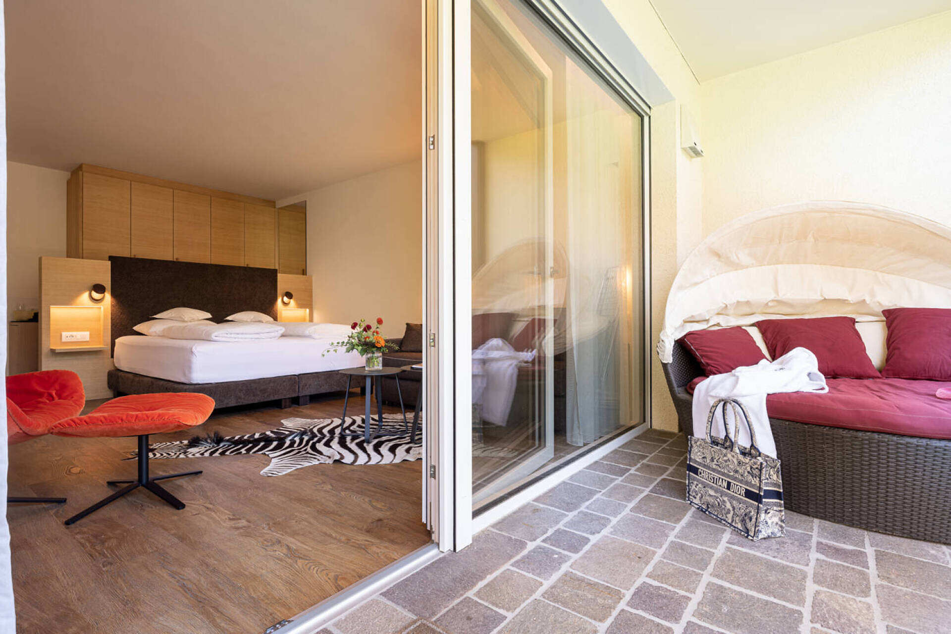 biogeölter Eichenboden, hochwertiges Boxspringbett, Esstisch und Stühlen, TV 50", Dab-Radio, Telefon, Safe, Badezimmer mit Dusche, Bidet, Wc Fön, großer Südbalkon mit Bank, Tisch, Stühlen und 2 ergonomischen Liegestühlen, Wifi, Wäscheständer, (Kleinküche gegen Gebühr dazu buchbar)