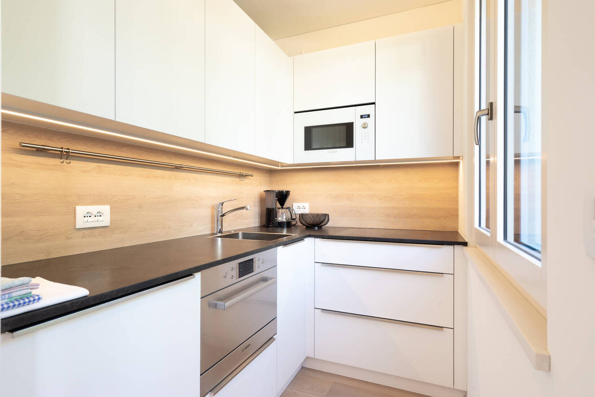 NEU: biogeölter Eichenboden, hochwertiges Boxspringbett, Bank, Esstisch und Stühle, TV 50", Dab-Radio, Telefon, Safe, Küche mit Spülmaschine, Ceranfeld, Mikrowelle, Theke mit Barhocker, Badezimmer mit Dusche, Bidet, Wc; Fön, großer Südbalkon 10 m² mit Tisch, Bank, Stühlen und 2 ergonomischen Liegestühlen, Sonnenschirm, Wäscheständer, Wifi