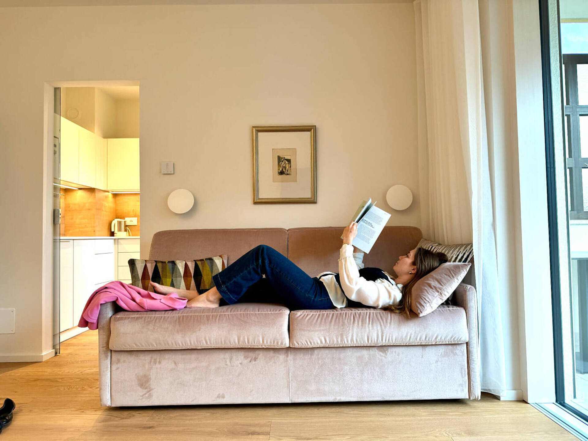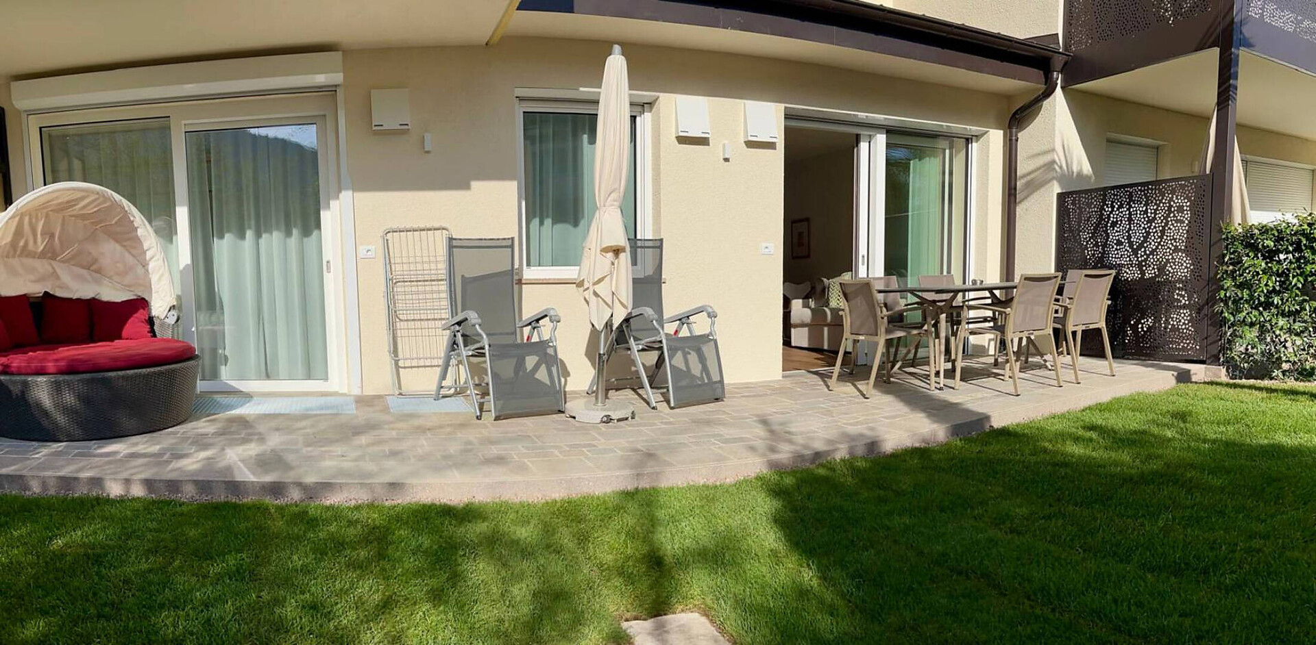 NEU: großes, hochwertiges Boxspringbett 180 x 200 cm, Schlafcouch (= 160 cm Doppelbett), Tv 50", DAB-Radio, Safe, Telefon, gemütliche Sitzbank mit Tisch und Stühlen, Küche mit Spülmaschine, Mikrowelle, Wasserkocher, Fenster ecc., Badezimmer mit Dusche, Wc, Fön, großer, ruhiger Balkon 12 m² oder kleines Gärtchen 18 m² mit Morgensonne mit Tischchen, Stühlen und Liegestühlen, Wäscheständer, wlan