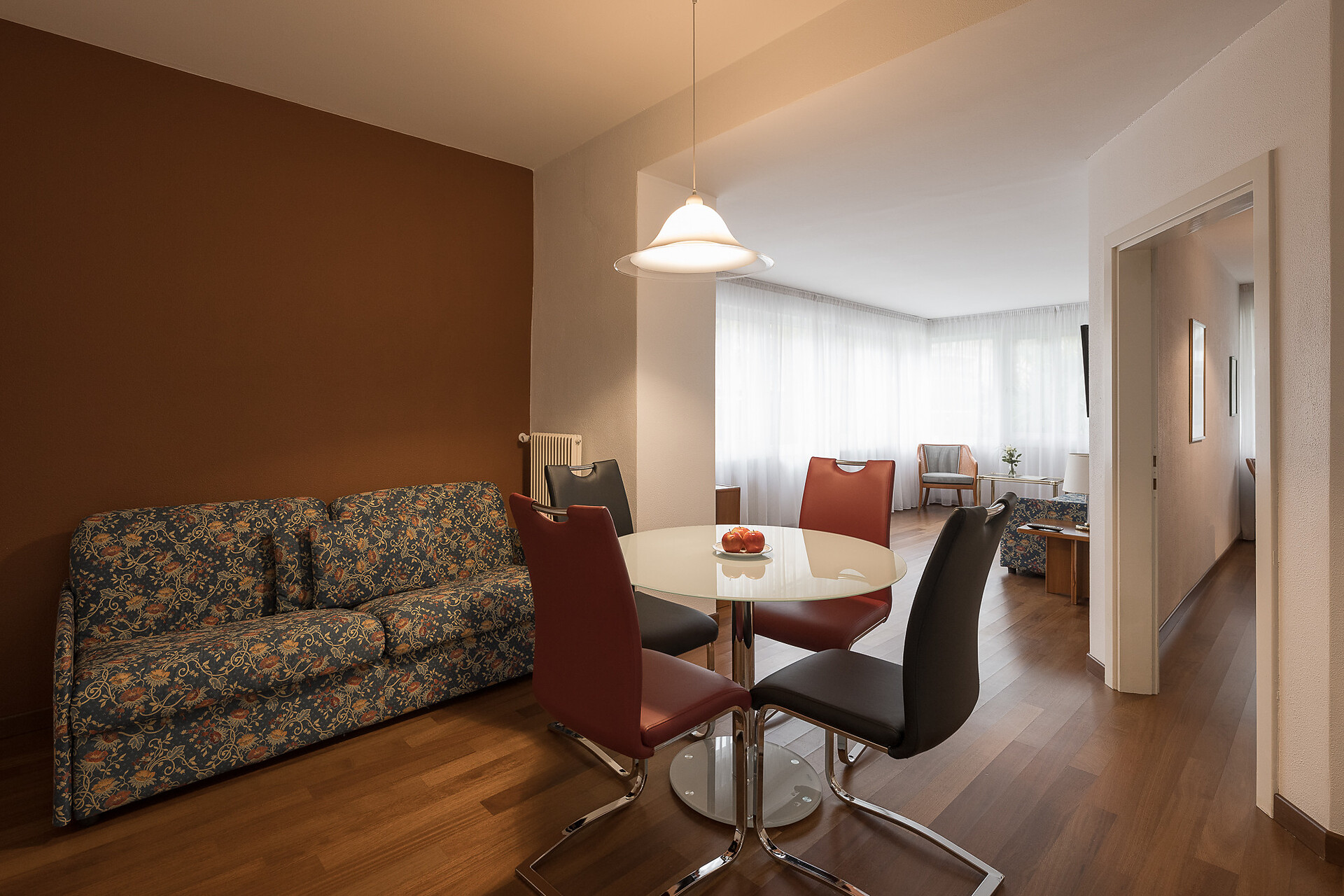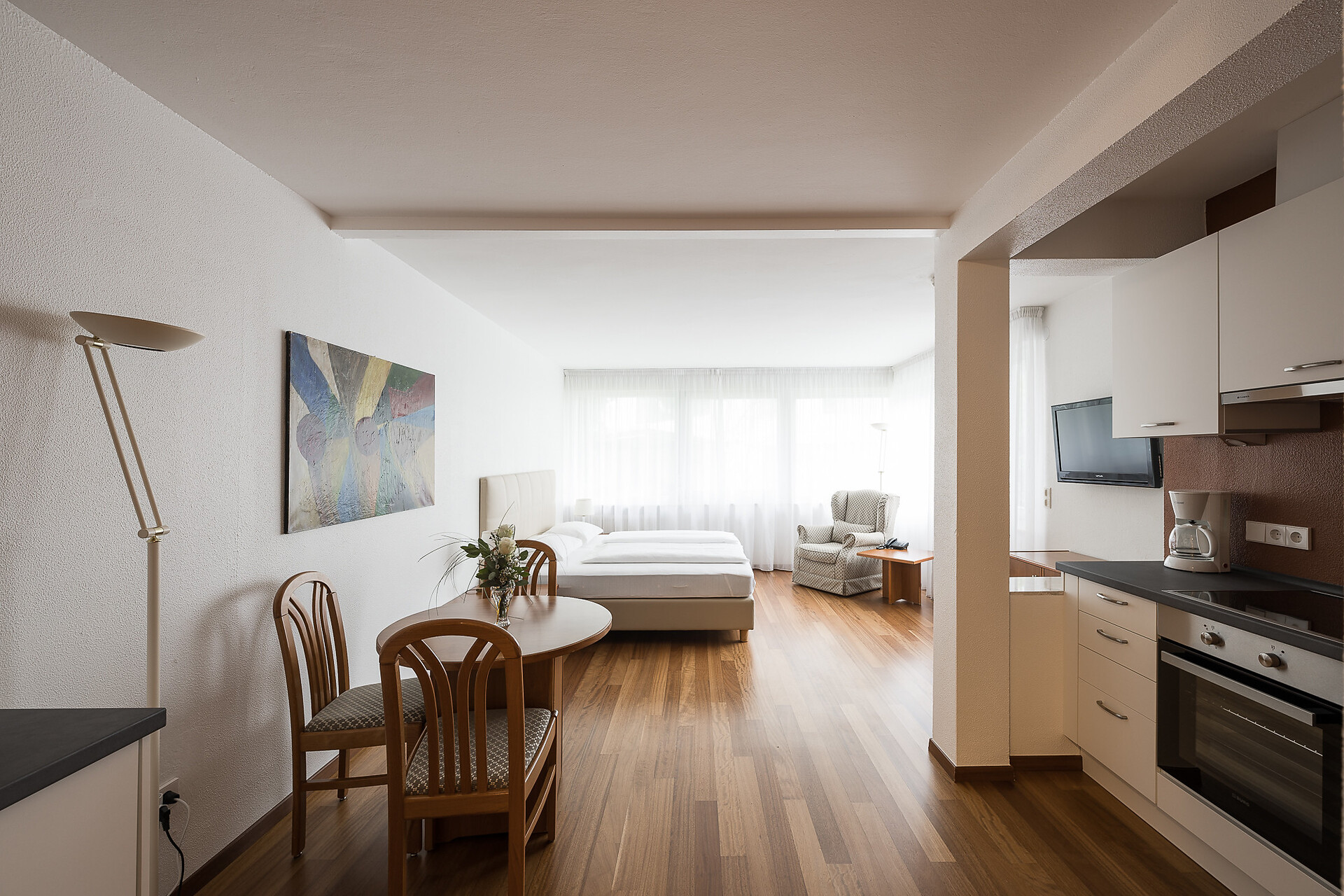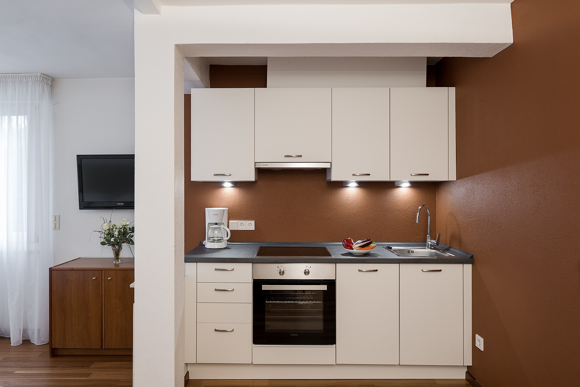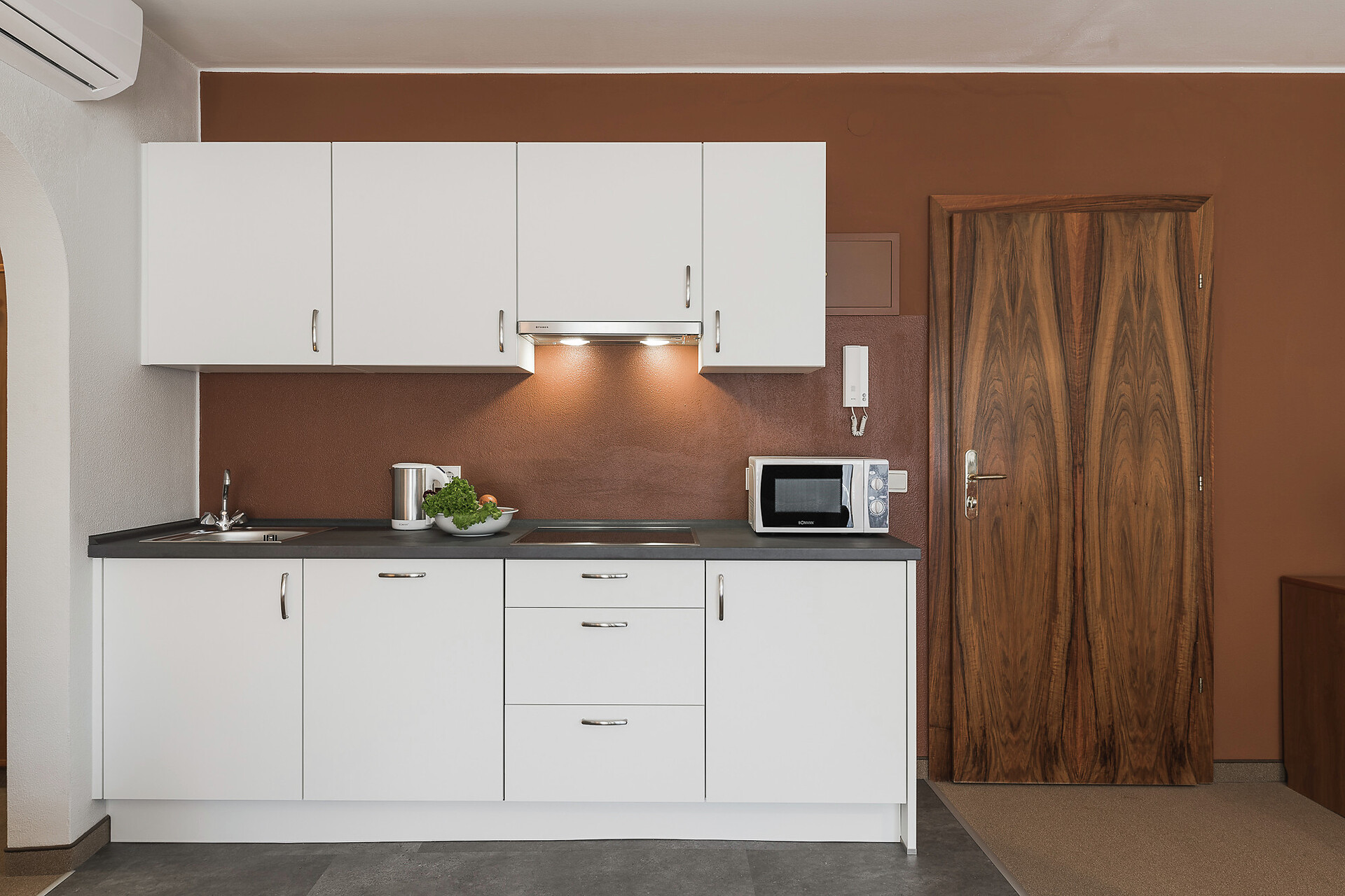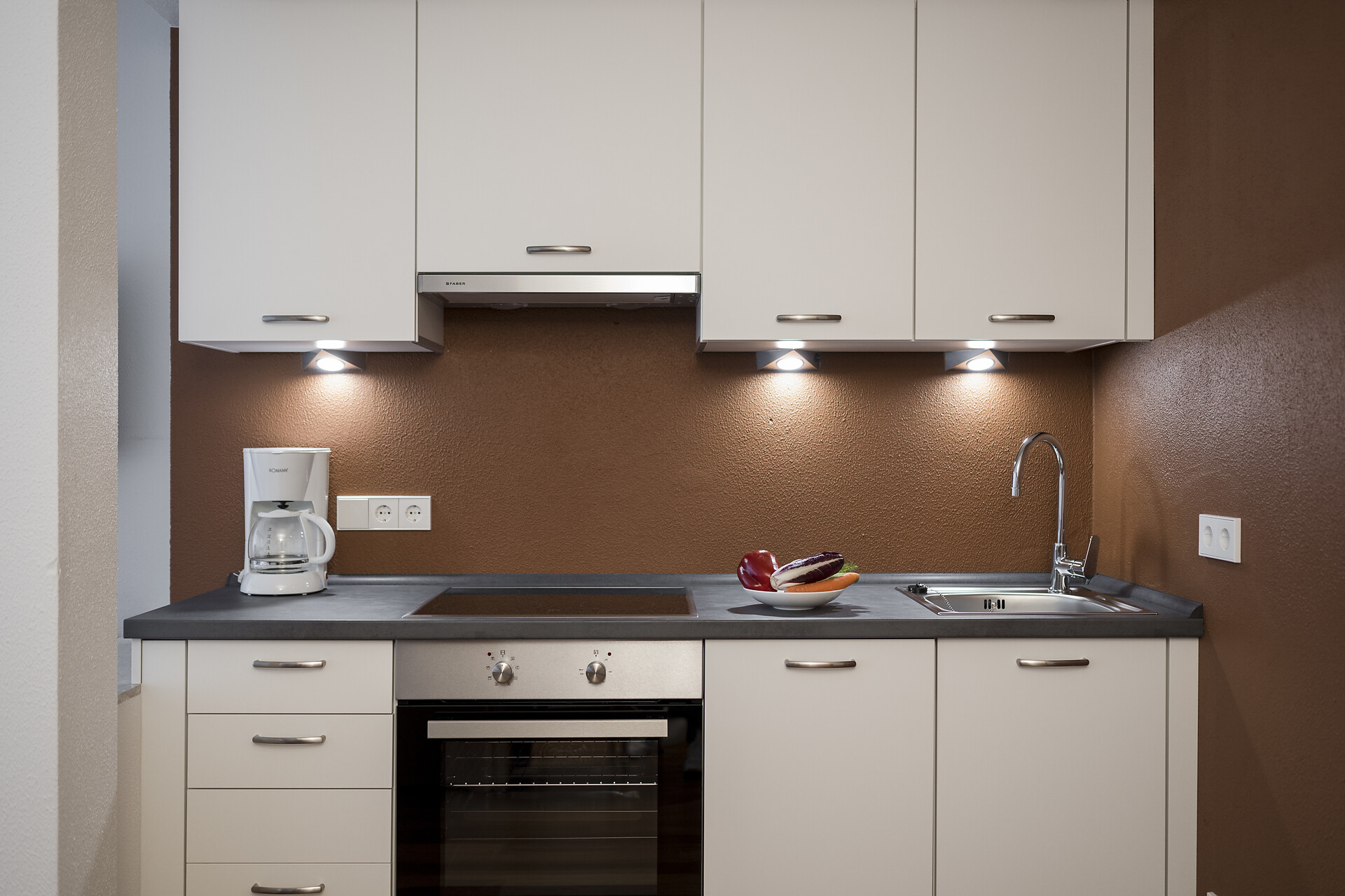 Zweizimmerwohnung mit Schlafzimmer mit Doppelbett, Wohnzimmer mit Schlafcouch und voll ausgestatteter Küchenzeile mit 4-Cerankochfeld, Geschirrspüler, Kühlschrank, Mikrowelle, Wasserkocher und Kaffeemaschine (mit Filter), Essecke, Dusche, WC, Sat-TV, Safe, Klimaanlage, Telefon und Balkon. Teilweise mit Backofen.