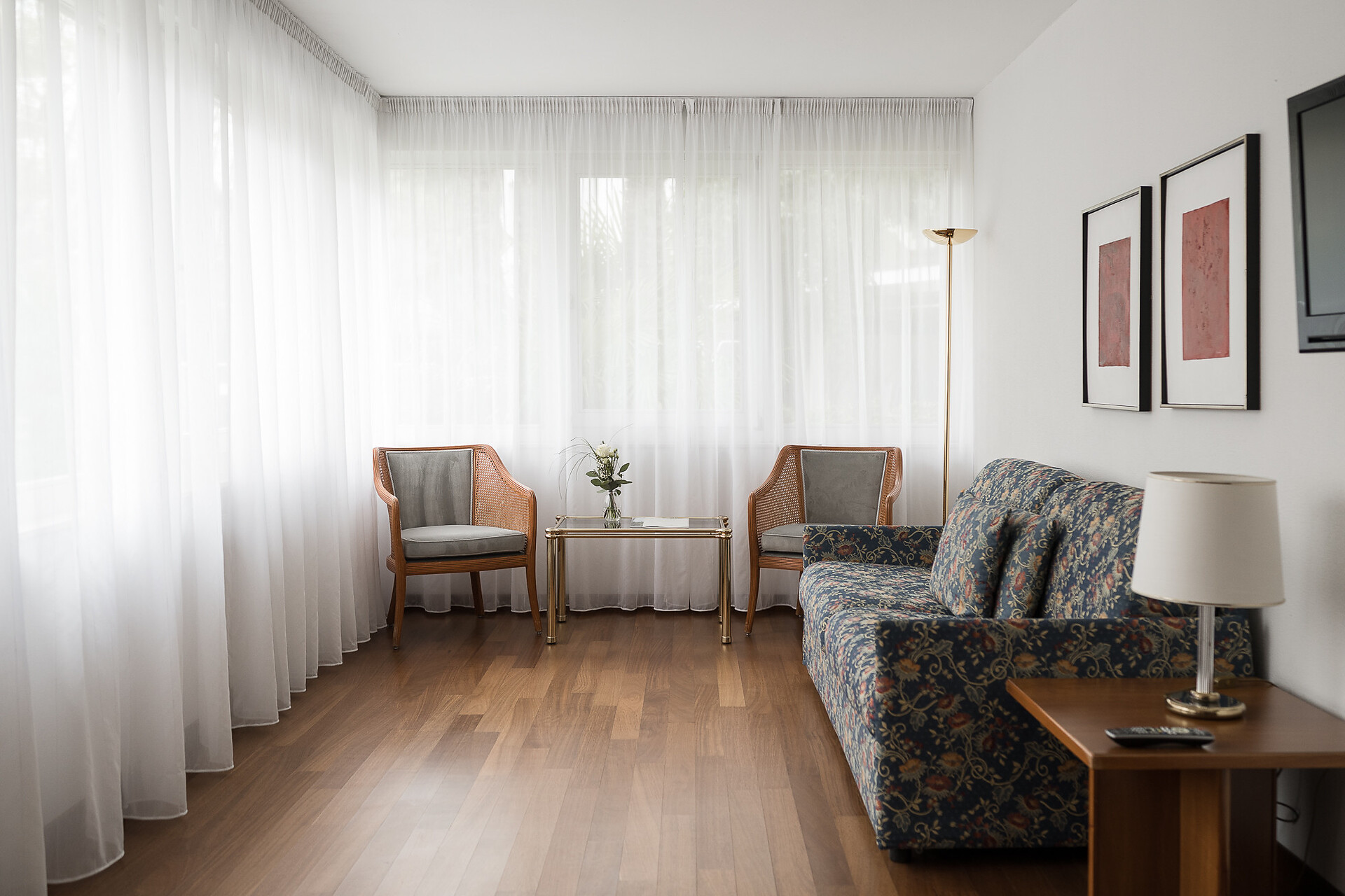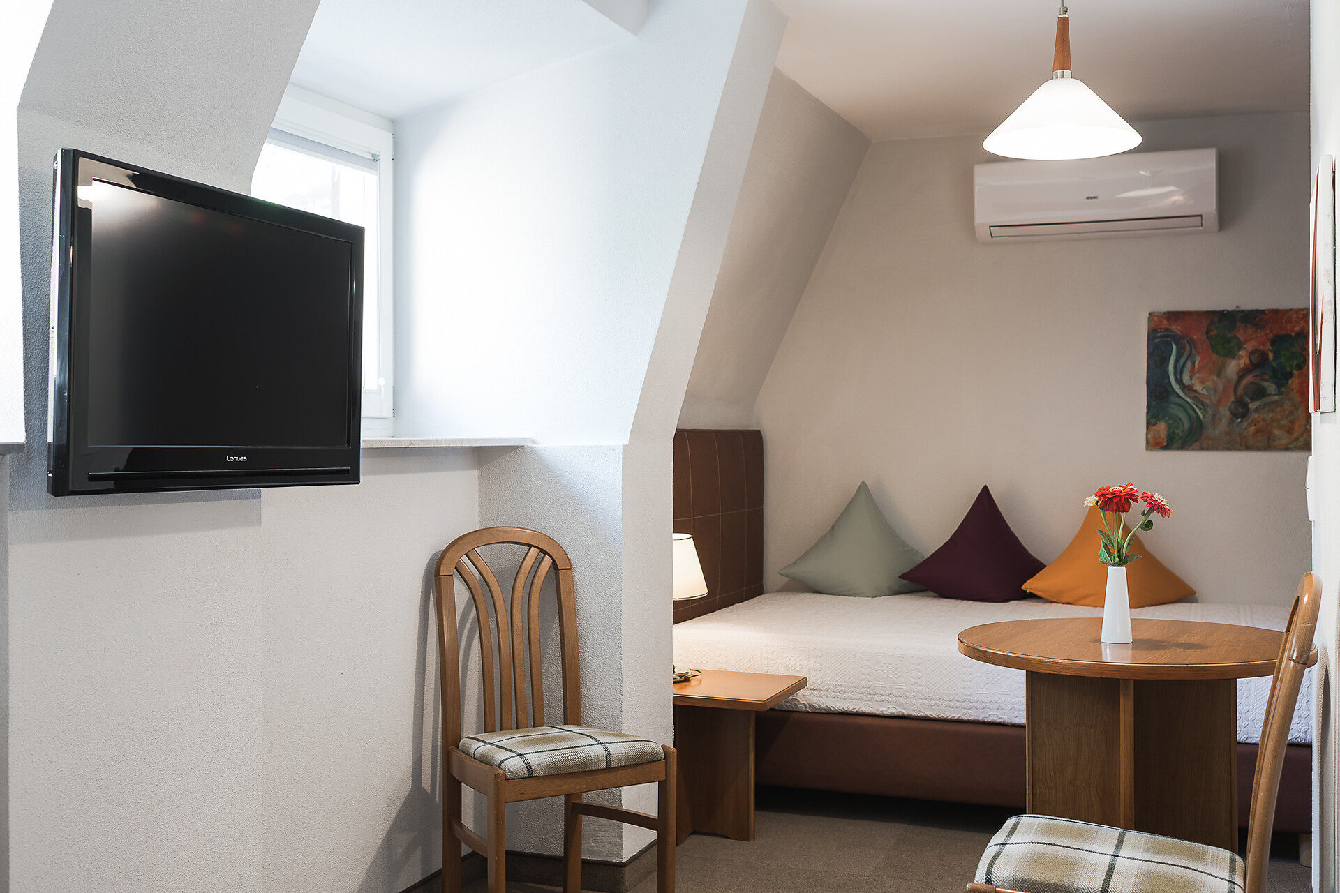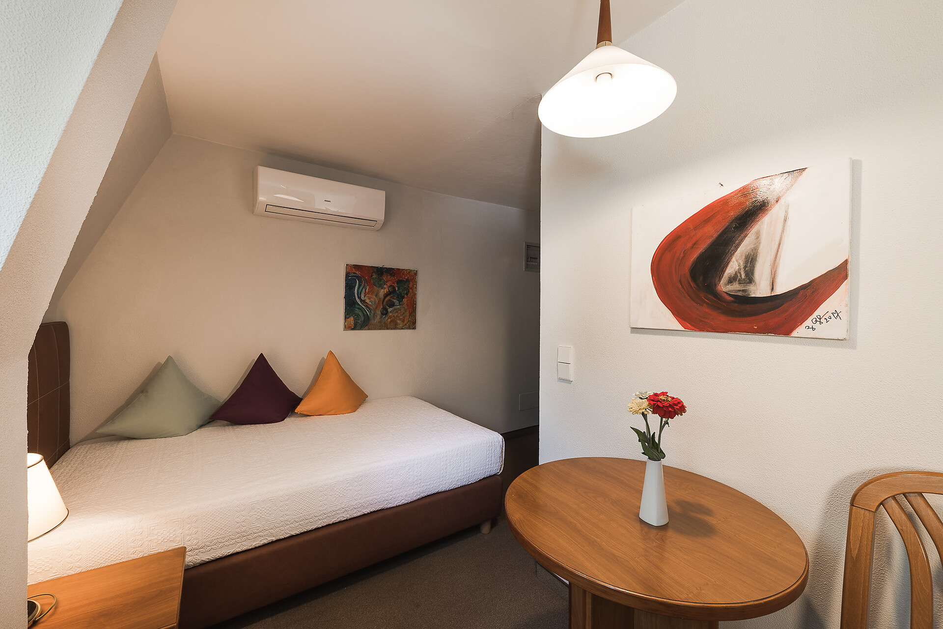 Doppelbett, Bettsofa, Doppelschlafcouch, Balkon, Garten, Klimaanlage, Bettwäsche vorhanden, Safe, Wohnküche, Kaffeemaschine, Elektroherd, Mikrowelle, Geschirrausstattung, Wasserkocher, Dusche/Bad, Haarfön, TV, Satellit/Kabel, WLAN, Haupthaus, Südseite