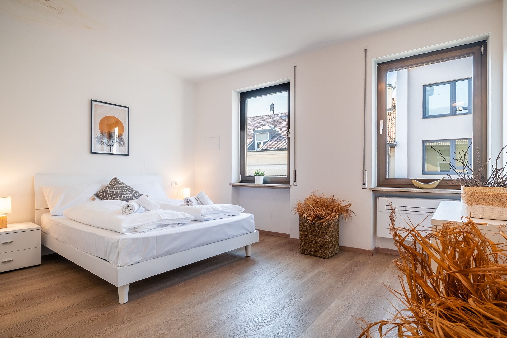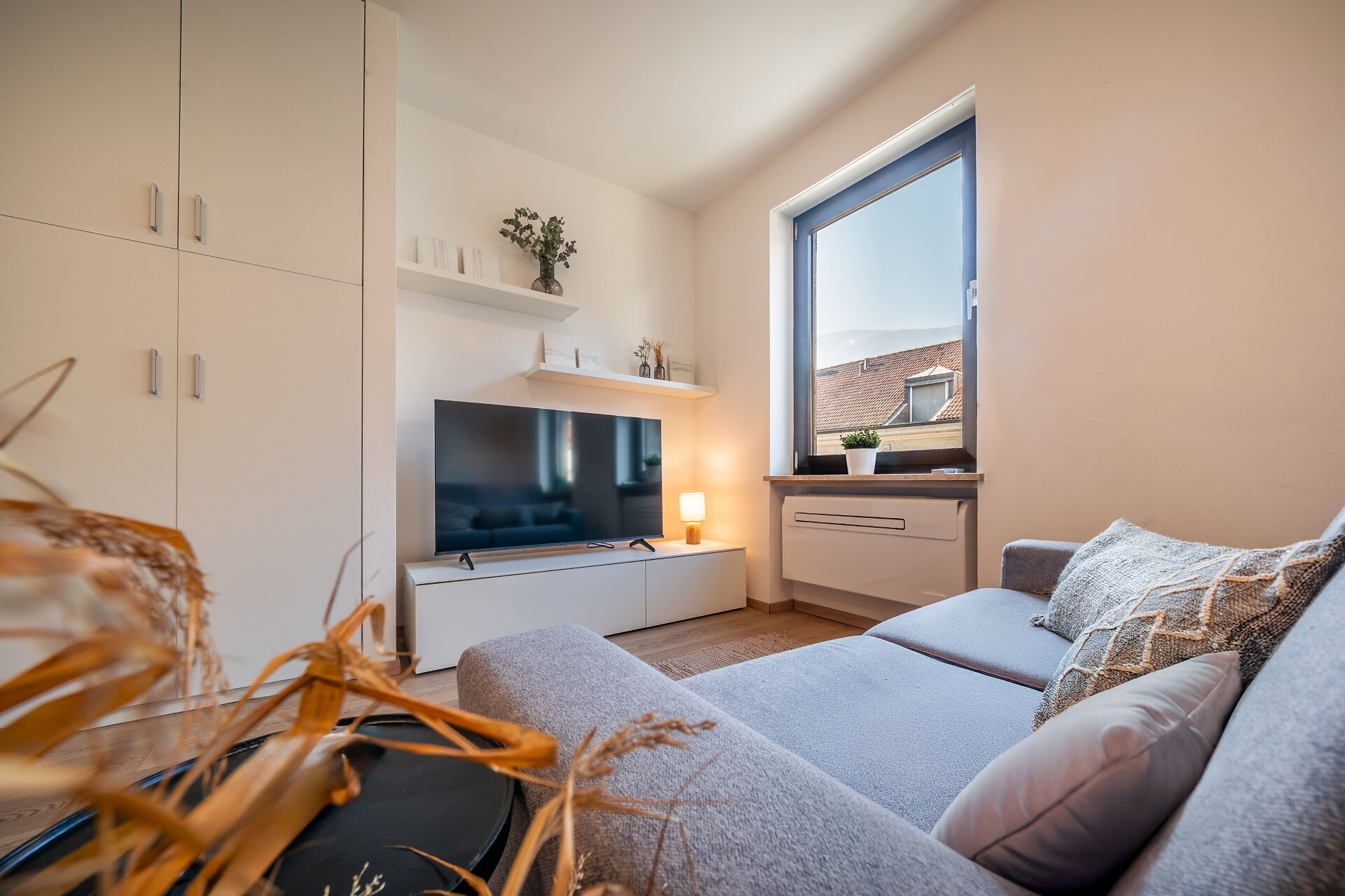 Die Stadtwohnung befindet sich im Zentrum von Meran, direkt am Rennweg, und verfügt über ein Schlafzimmer für zwei erwachsene Personen sowie eine Schlafcouch für maximal zwei Kinder.
