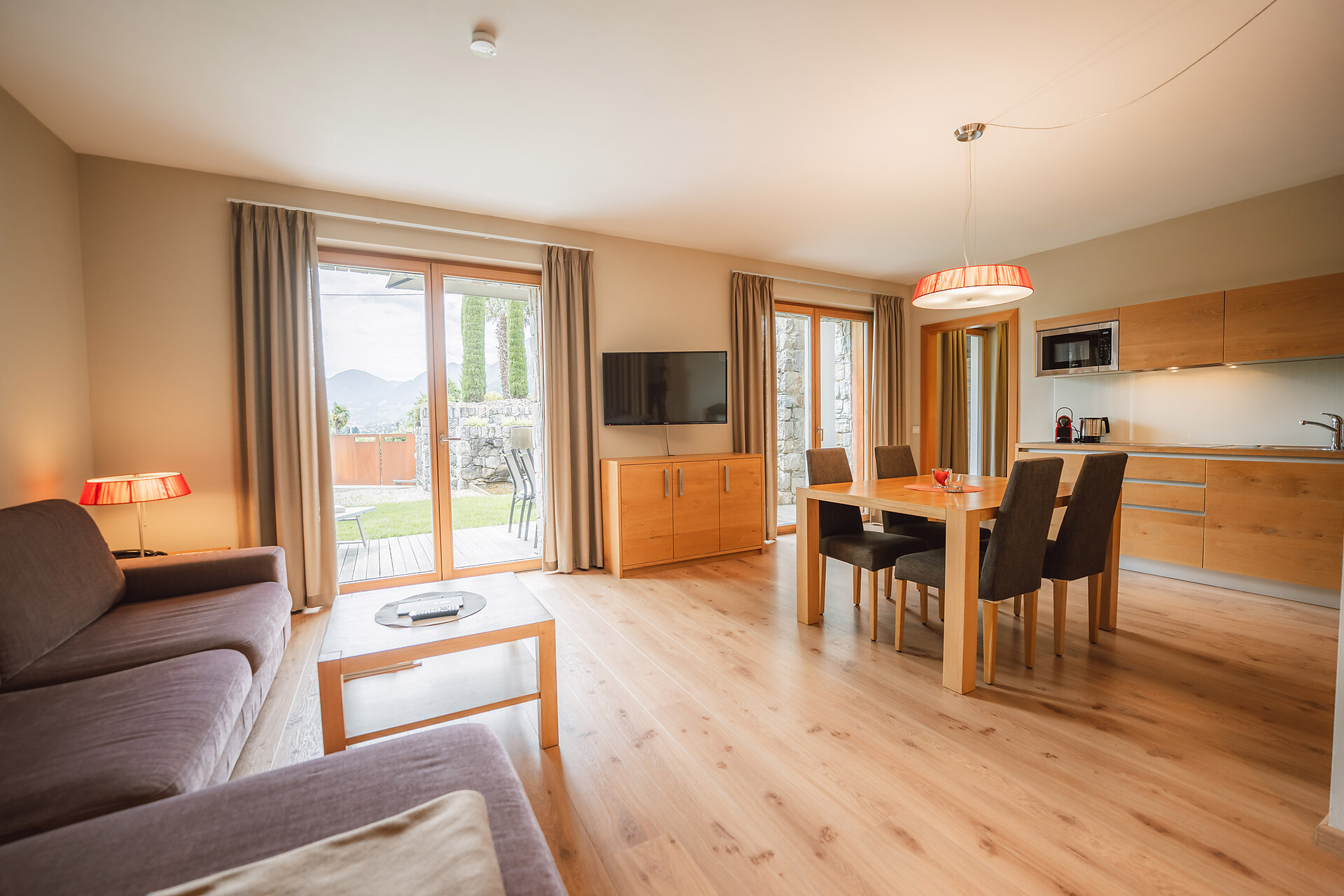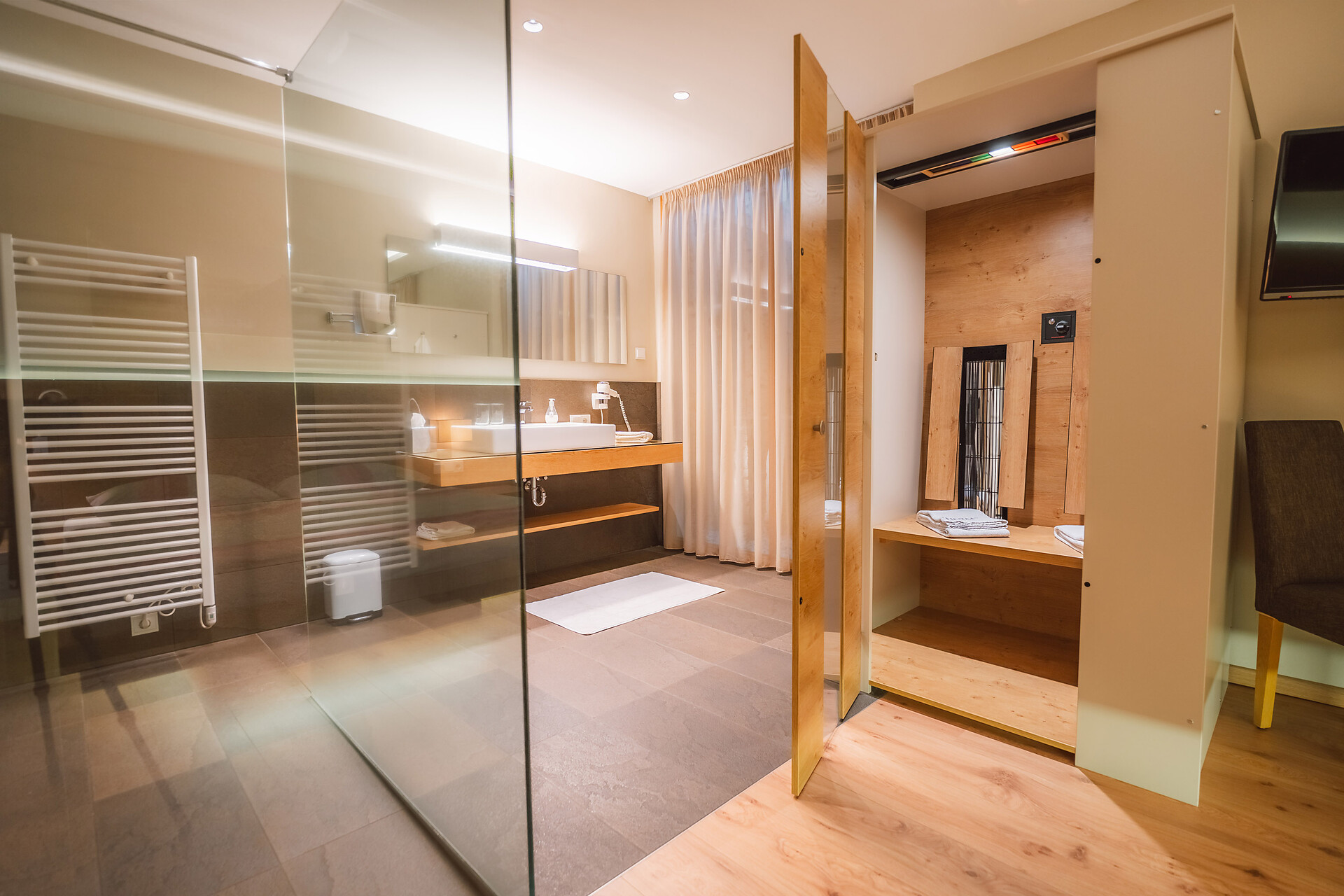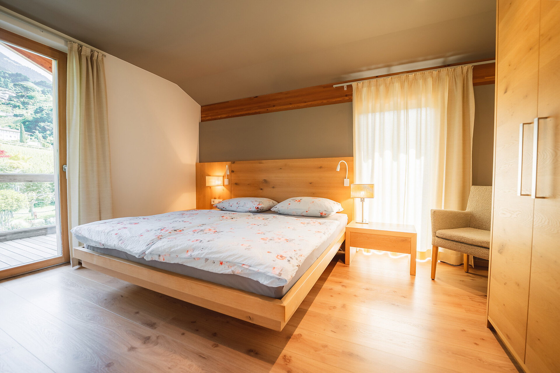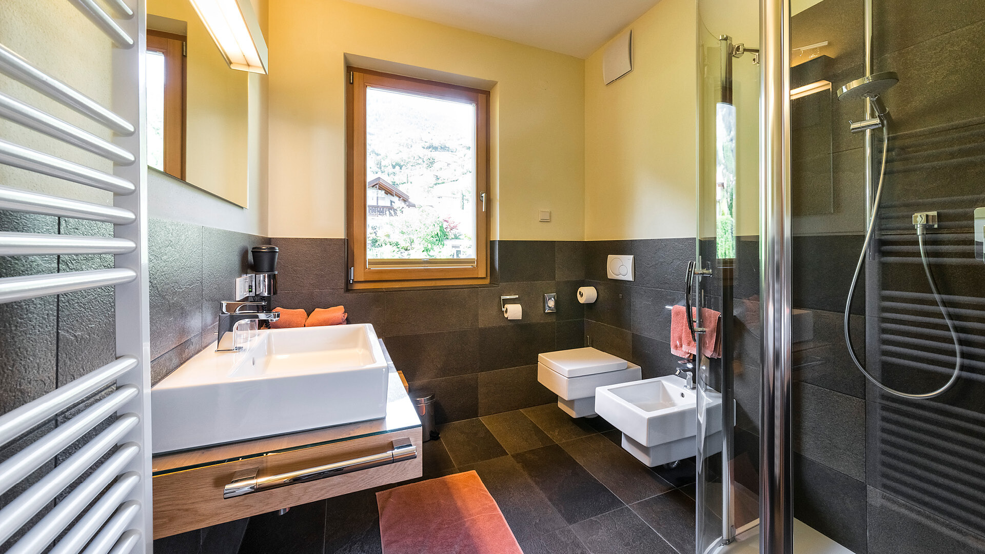 Im Erdgeschoss für 4-5 Personen. Mit zwei getrennten Doppelbett-Schlafzimmern, geräumigen Wohnzimmer mit Küchenzeile Richtung Süden, 2x SAT-TV, Telefon und Safe. Highlight: Wellness-Badezimmer mit Wasserfalldusche und Infrarotkabine im Elternschlafzimmer, getrenntes Badezimmer mit Dusche, WC, Bidet und Fön. Panoramaterrasse Süd mit eigener Liegewiese direkt am Wasserfall.