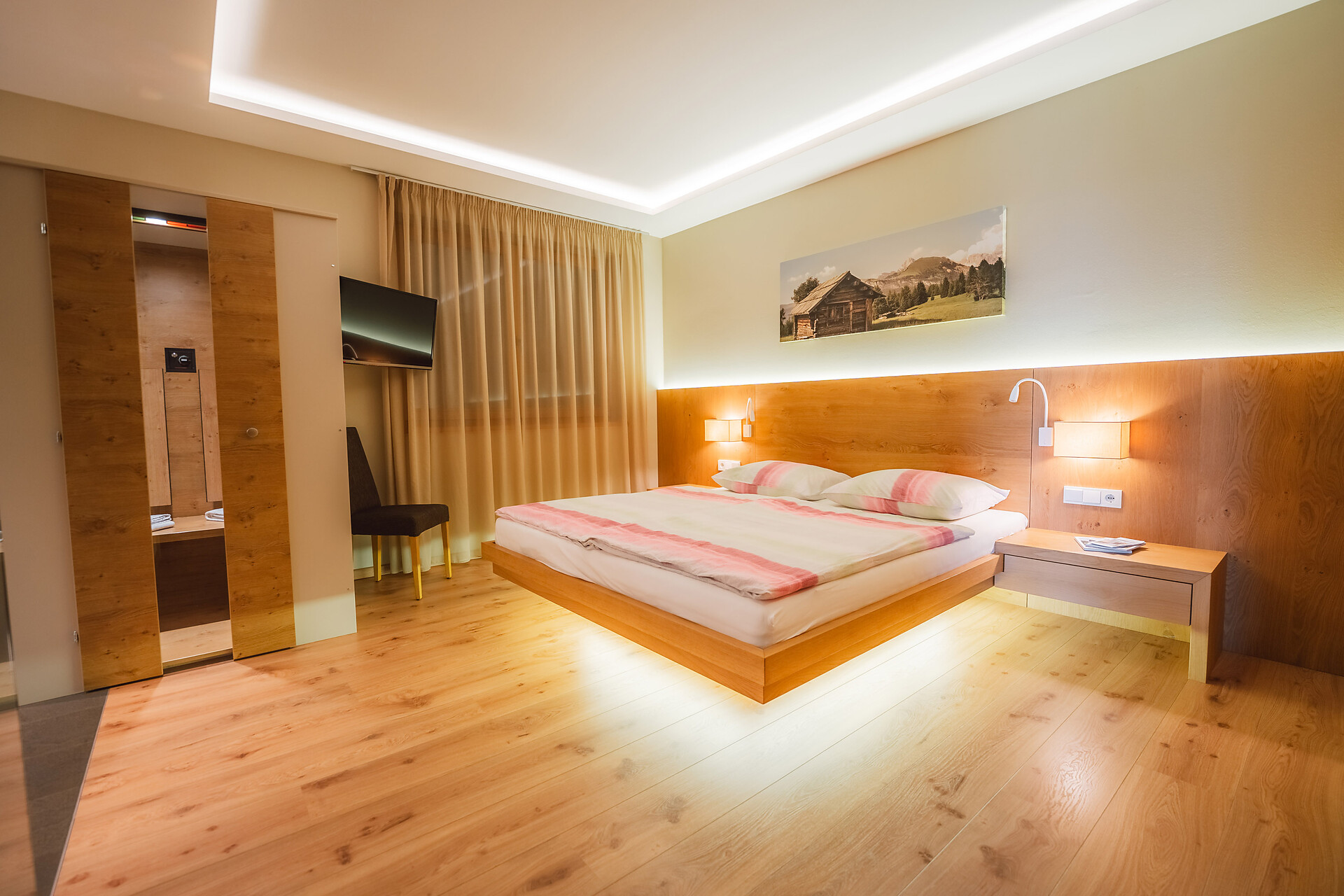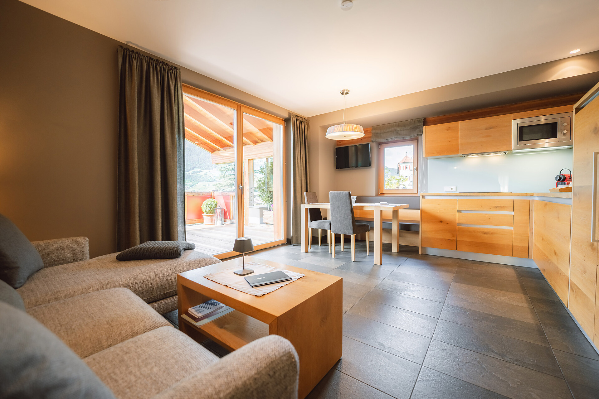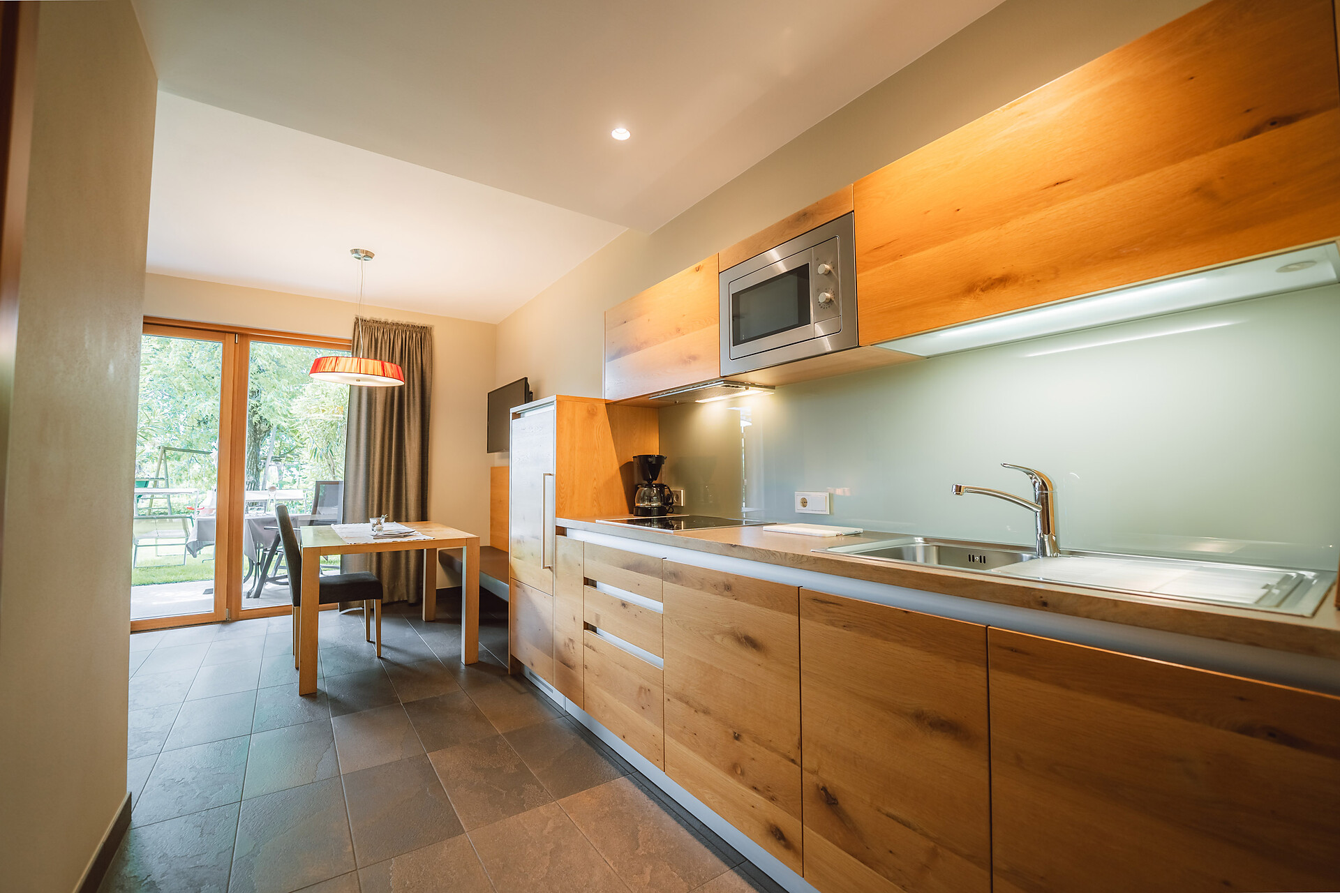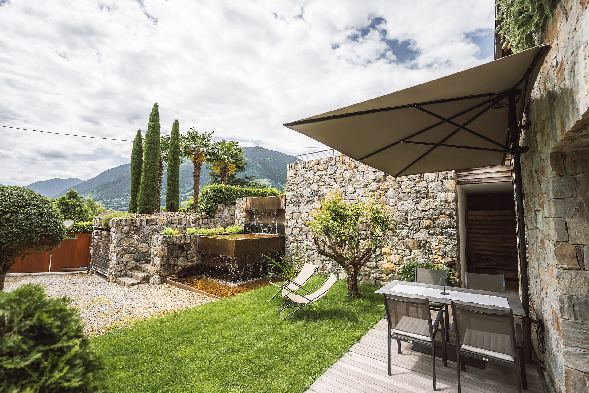 Im Erdgeschoss für 4-5 Personen. Mit zwei getrennten Doppelbett-Schlafzimmern, geräumigen Wohnzimmer mit Küchenzeile Richtung Süden, 2x SAT-TV, Telefon und Safe. Highlight: Wellness-Badezimmer mit Wasserfalldusche und Infrarotkabine im Elternschlafzimmer, getrenntes Badezimmer mit Dusche, WC, Bidet und Fön. Panoramaterrasse Süd mit eigener Liegewiese direkt am Wasserfall.