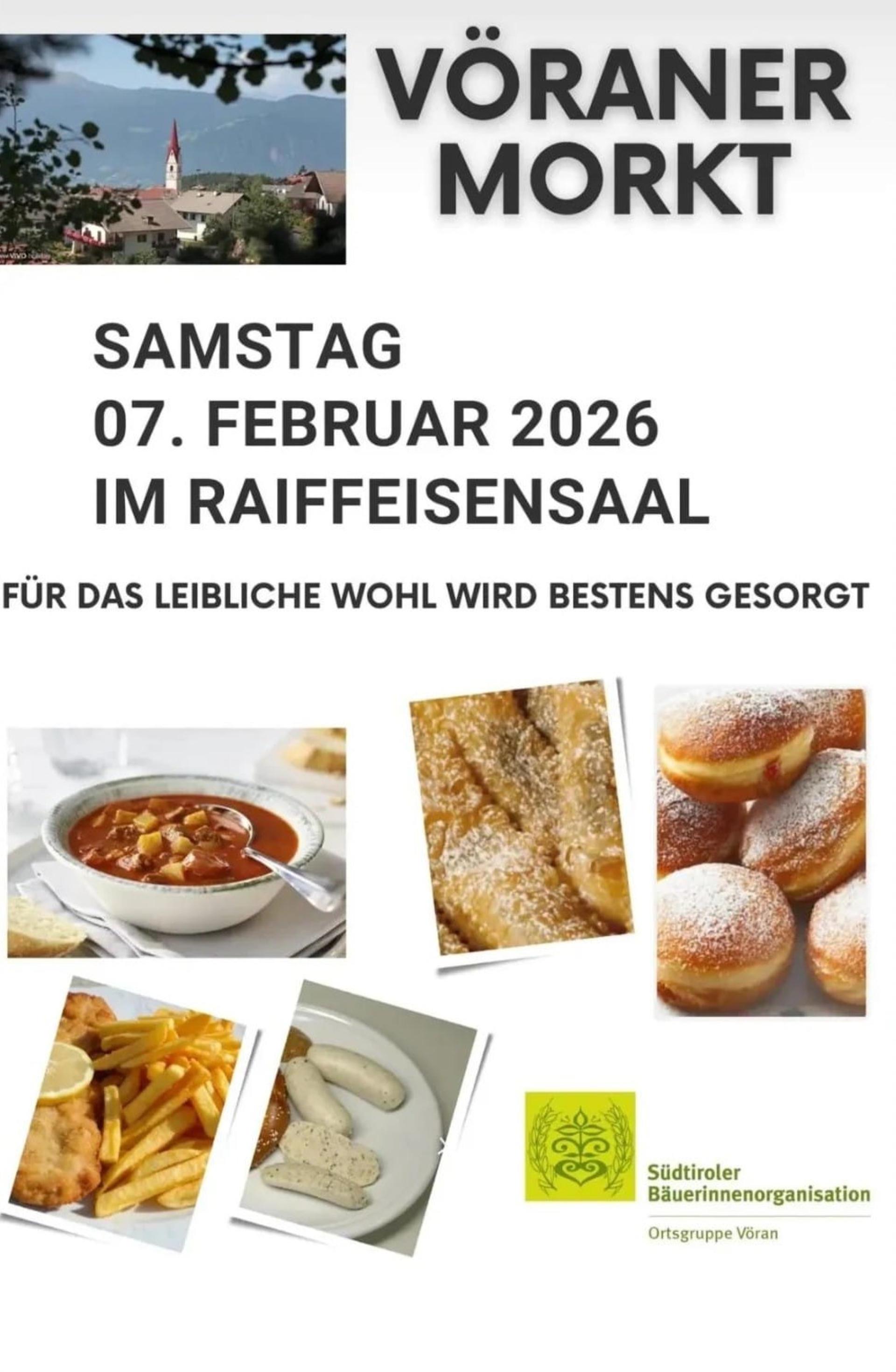 Jährlich Anfang Februar findet der Vöraner Markt statt. Organisiert von der Bäuerinnen Ortsgruppe Vöran bieten über 15 Verkaufsstände im Raiffeisensaal von Vöran ihre Produkte an. Schmuck, Kinder- und Baby Bekleidung, Produkte aus Holz, Dekorationsartikel, Traktoren und vieles mehr.