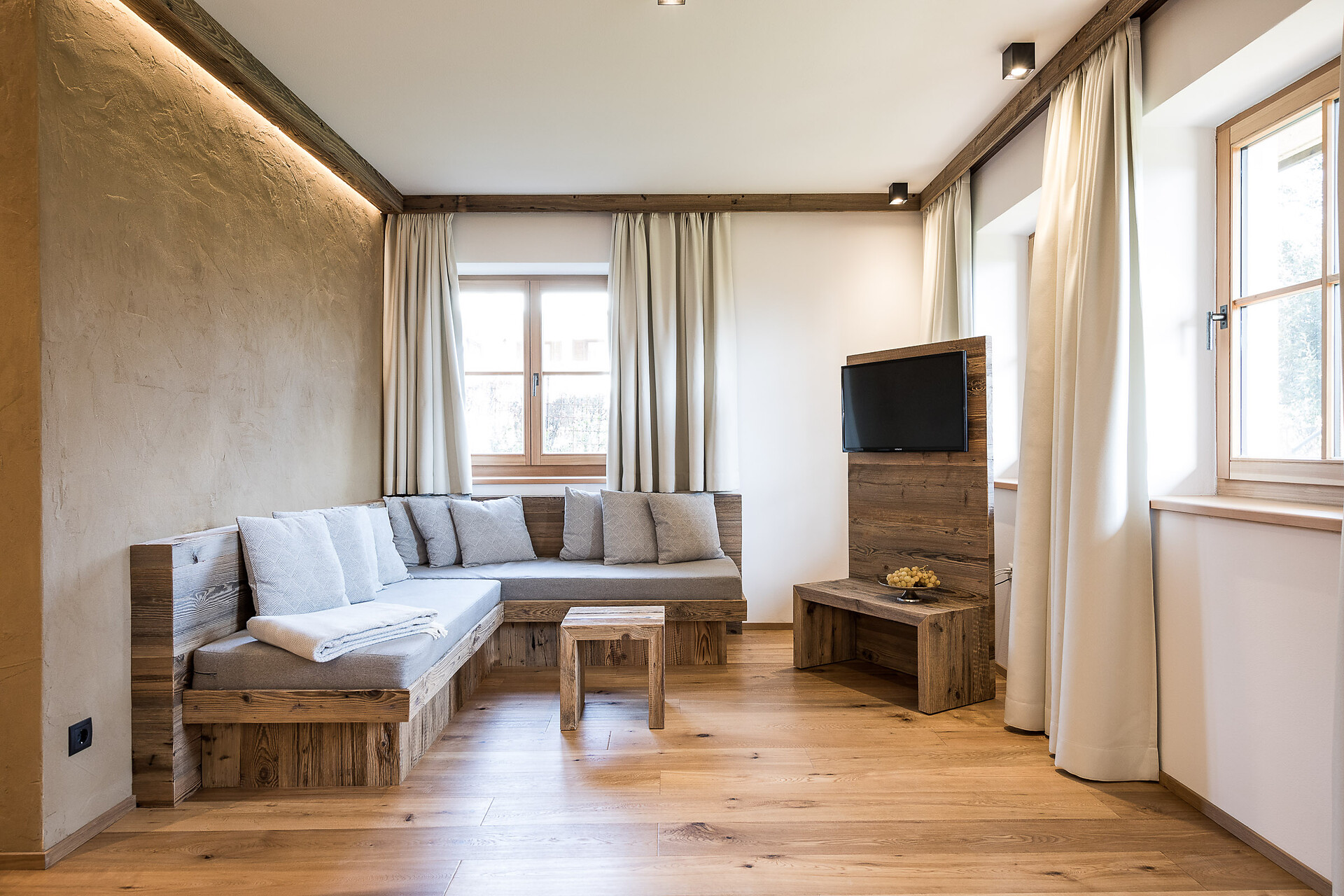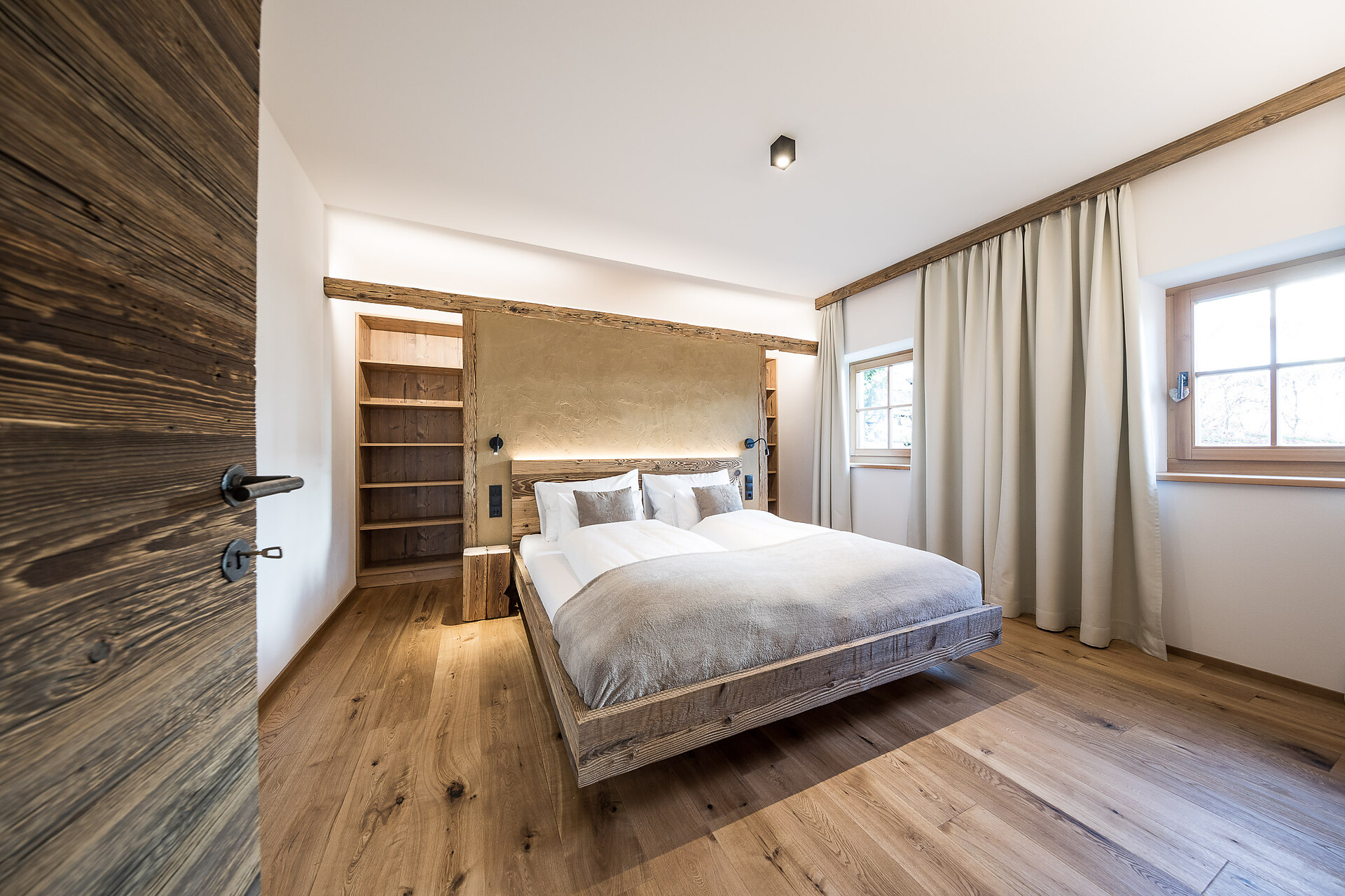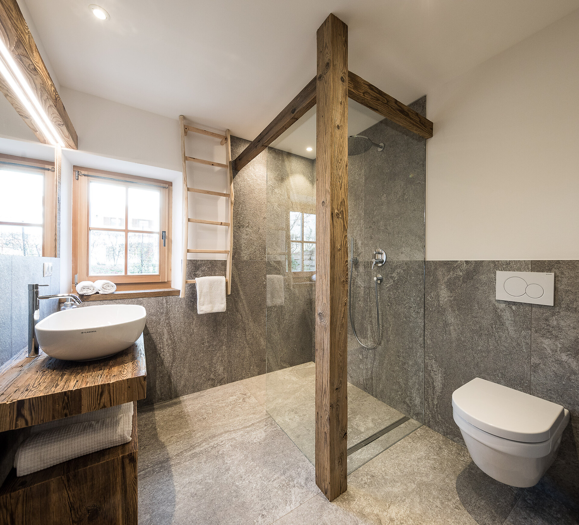 Unsere Ferienwohnungen in Naturmaterialien (Holz, Lehm, Kalk) für je 2 Personen liegen ebenerdig mit direktem Zugang zum Garten mit Blick auf den Badeteich, den Kräuterhügel und die umliegende Bergwelt.