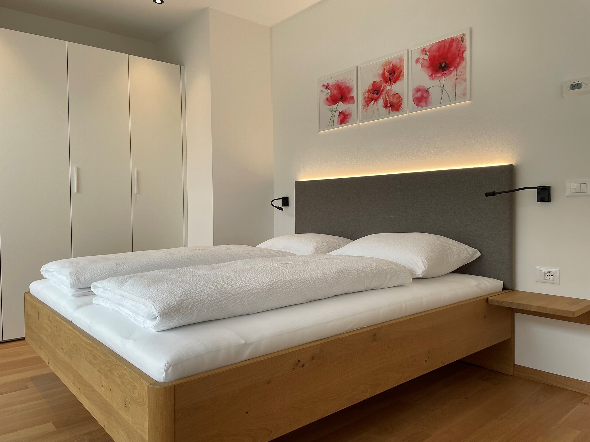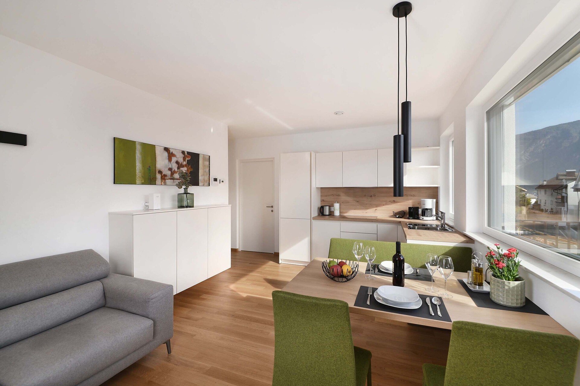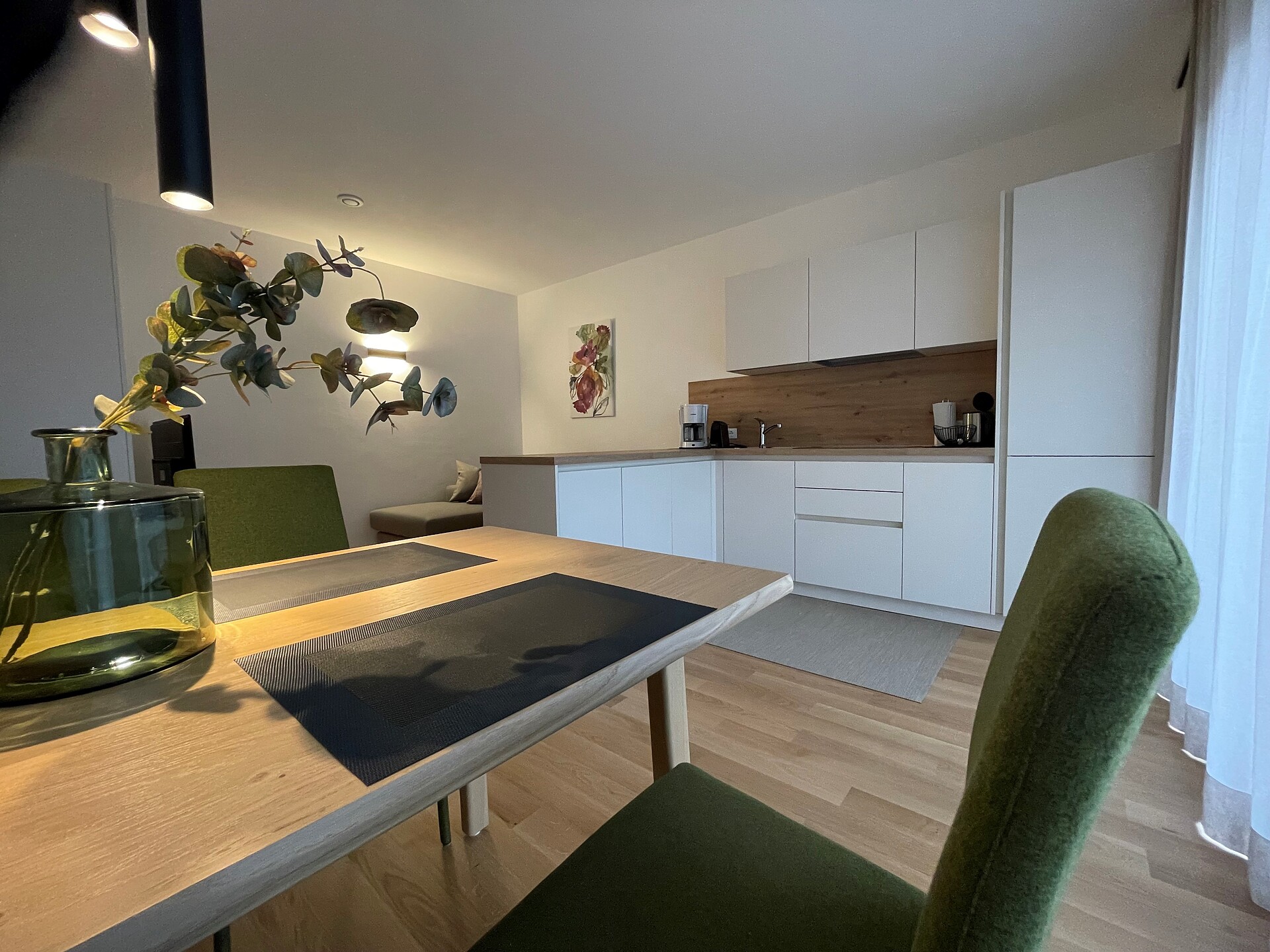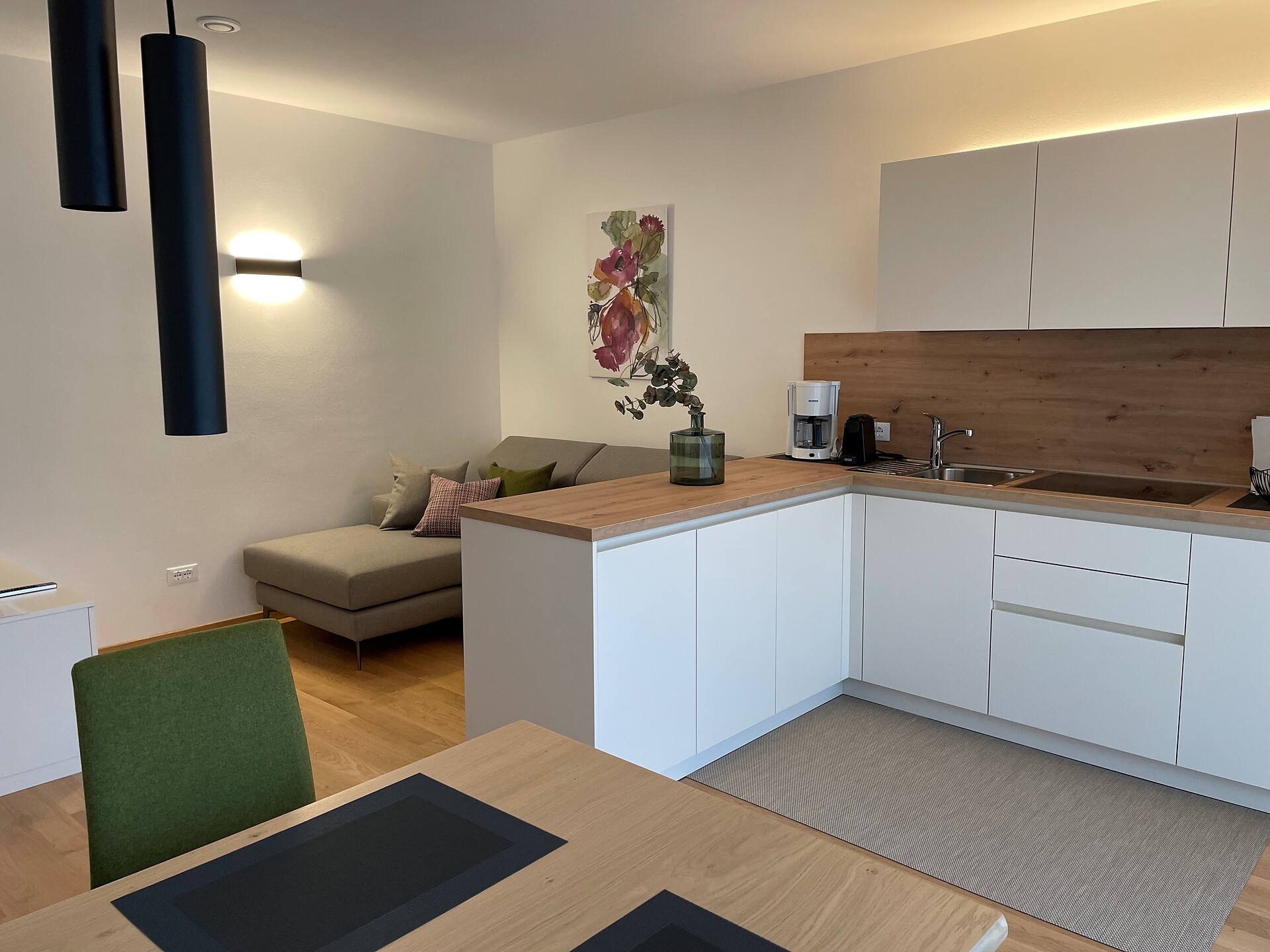 Neuerrichtetes, modernes Nichtraucher-Apartment im 1. Stock, Klimahaus A. Hochwertige Ausstattung mit Holzböden, kontrollierte Wohnraumlüftung, Fußbodenheizung und Klimaanlage, geräumiges Badezimmer mit Dusche (Regenbrause) WC, Bidet, Haarfön, vollausgestattete Küche mit Induktionskochfeld, Spülmaschine, Kühl-und Gefrierschrank, Wasserkocher, Filterkaffeemaschine, Nespresso-Kapselmaschine, gemütliche Couch, Esstisch, Flachbildfernseher, kostenfreies WLAN, lichtdurchflutet mit großer sonniger Terrasse mit Sonnenliegen und Sonnenschirm. Bettwäsche, Hand- und Duschtücher werden zur Verfügung gestellt. Ein Tiefgaragenparkplatz und ein überdachter Autoabstellplatz in der Tiefgarage sind kostenfrei vorhanden. Aufzug vorhanden.