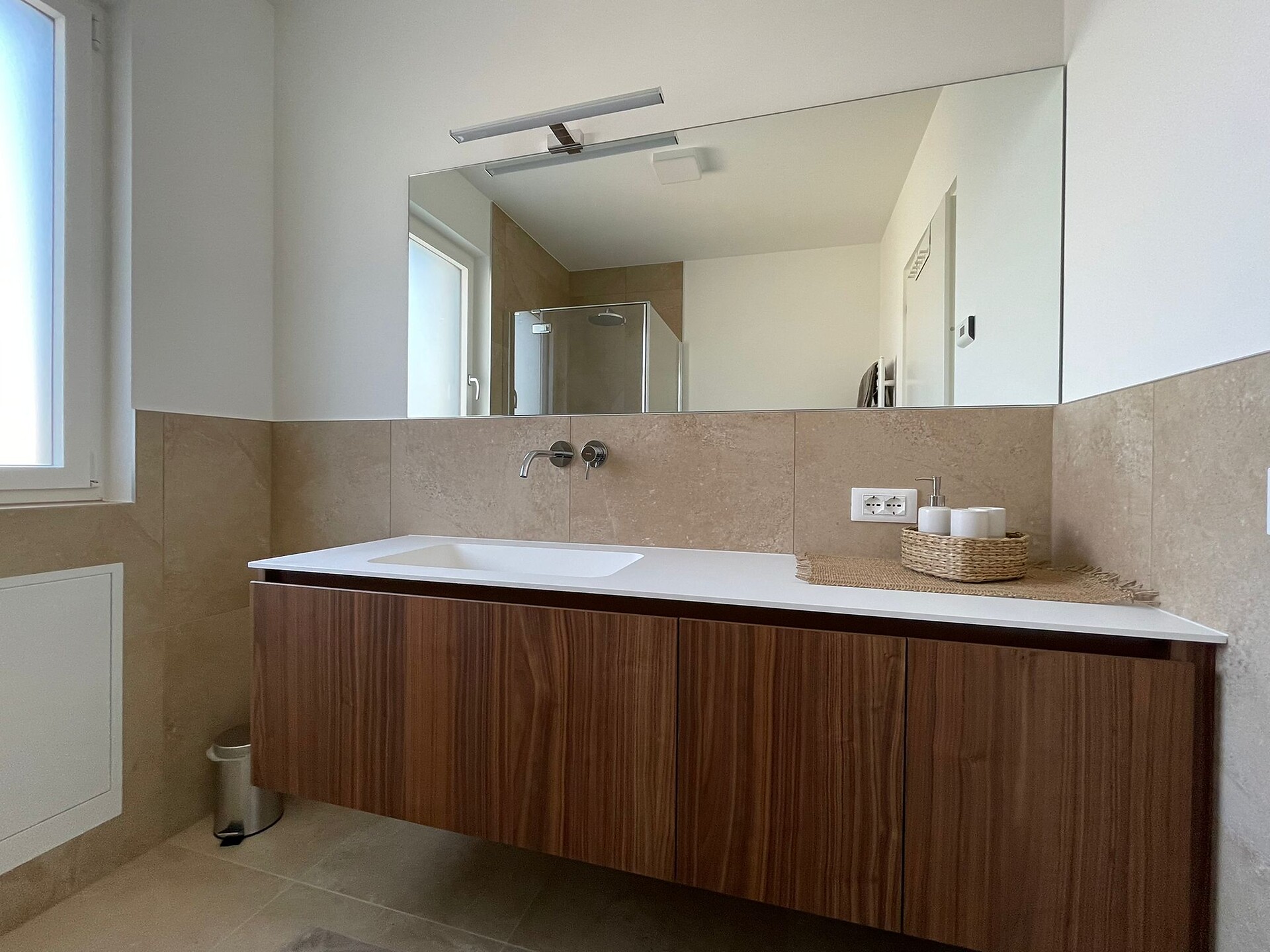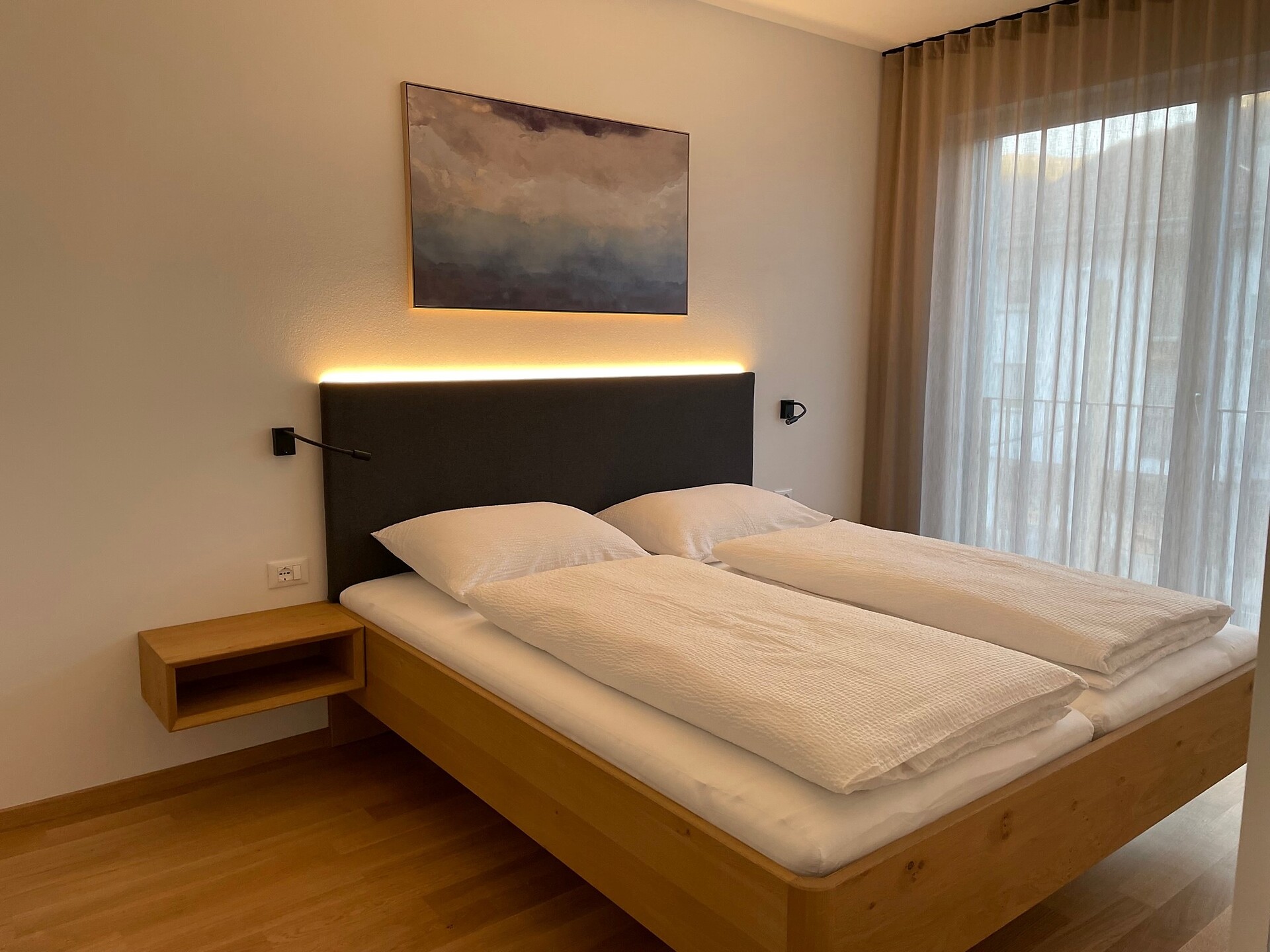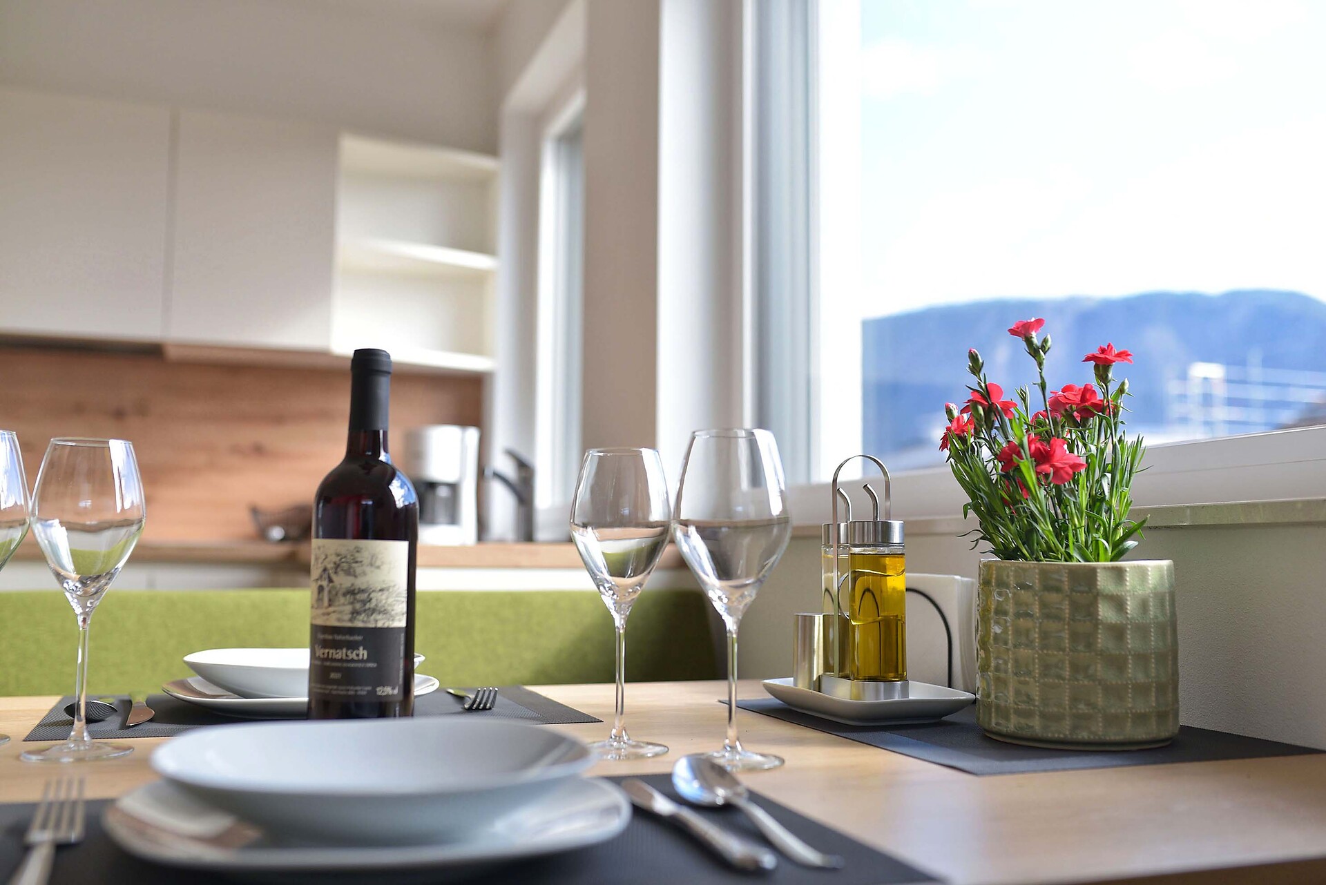 Neuerrichtetes, modernes Nichtraucher-Apartment im 1. Stock, Klimahaus A. Hochwertige Ausstattung mit Holzböden, kontrollierte Wohnraumlüftung, Fußbodenheizung und Klimaanlage, geräumiges Badezimmer mit Dusche (Regenbrause) WC, Bidet, Haarfön, vollausgestattete Küche mit Induktionskochfeld, Spülmaschine, Kühl-und Gefrierschrank, Wasserkocher, Filterkaffeemaschine, Nespresso-Kapselmaschine, gemütliche Couch, Esstisch, Flachbildfernseher, kostenfreies WLAN, lichtdurchflutet mit großer sonniger Terrasse mit Sonnenliegen und Sonnenschirm. Bettwäsche, Hand- und Duschtücher werden zur Verfügung gestellt. Ein Tiefgaragenparkplatz und ein überdachter Autoabstellplatz in der Tiefgarage sind kostenfrei vorhanden. Aufzug vorhanden.