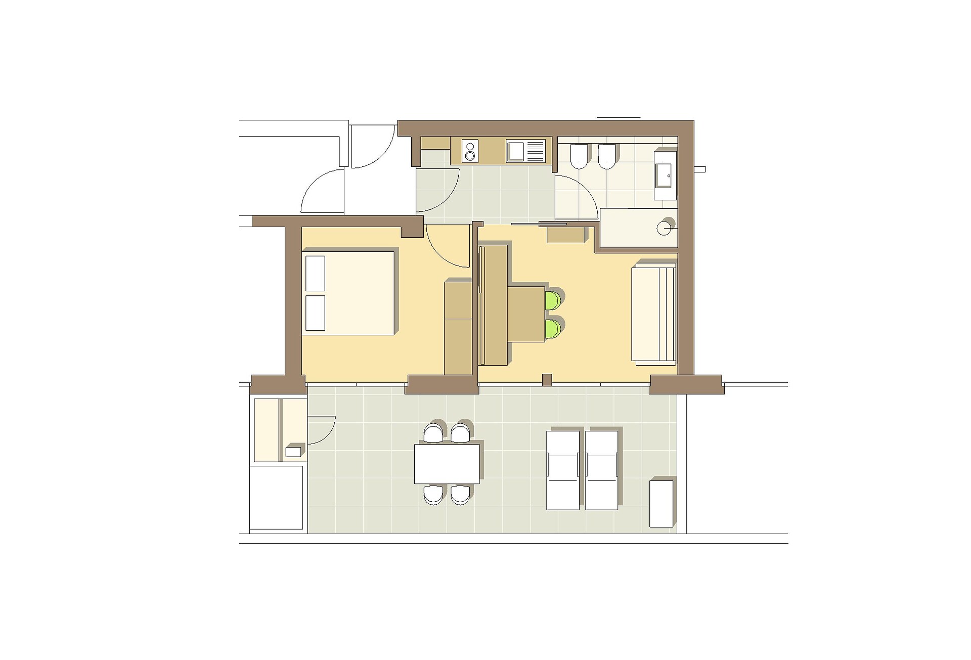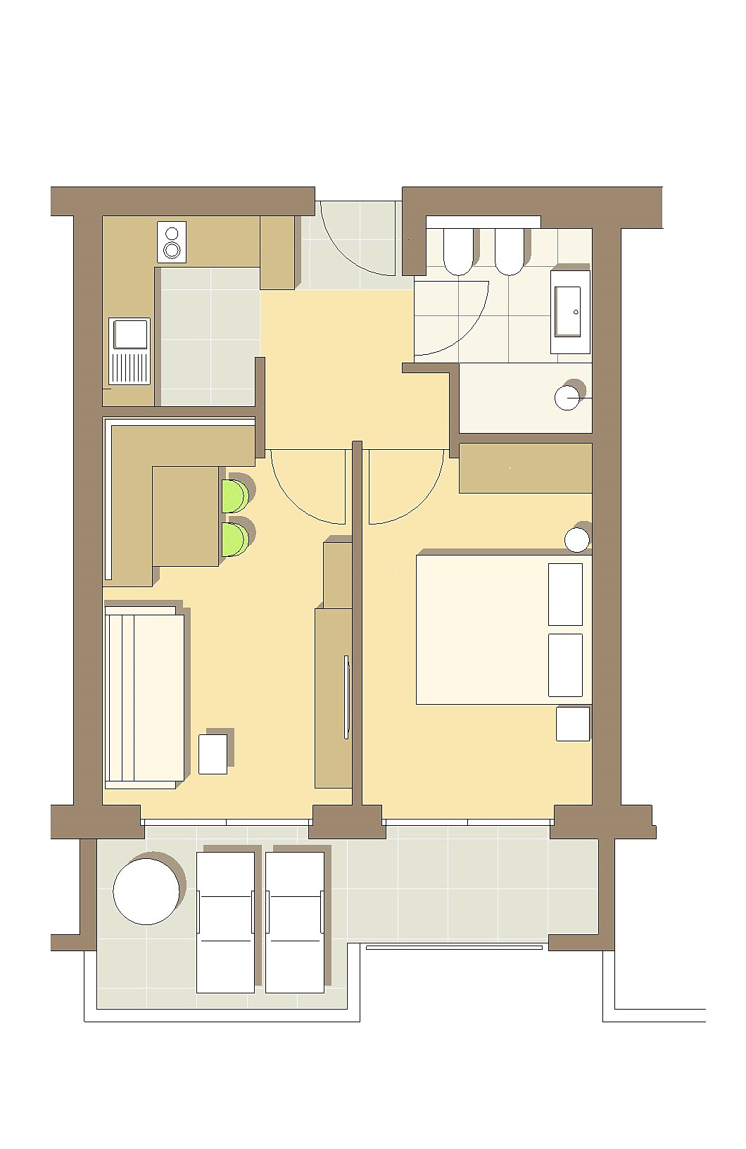 Ausstattung: Doppelbett, Doppelschlafcouch, Balkon, Separater Wohnraum, Bettwäsche vorhanden, Safe, Nichtraucher-Apartment, Separate Küche, Kaffeemaschine, Geschirrspülmaschine, Elektroherd, Mikrowelle, Geschirrausstattung, Wasserkocher, Dusche/Bad, Bidet, Haarfön, Badetücher, TV, Satellit/Kabel, WLAN, Panoramablick, Südseite
