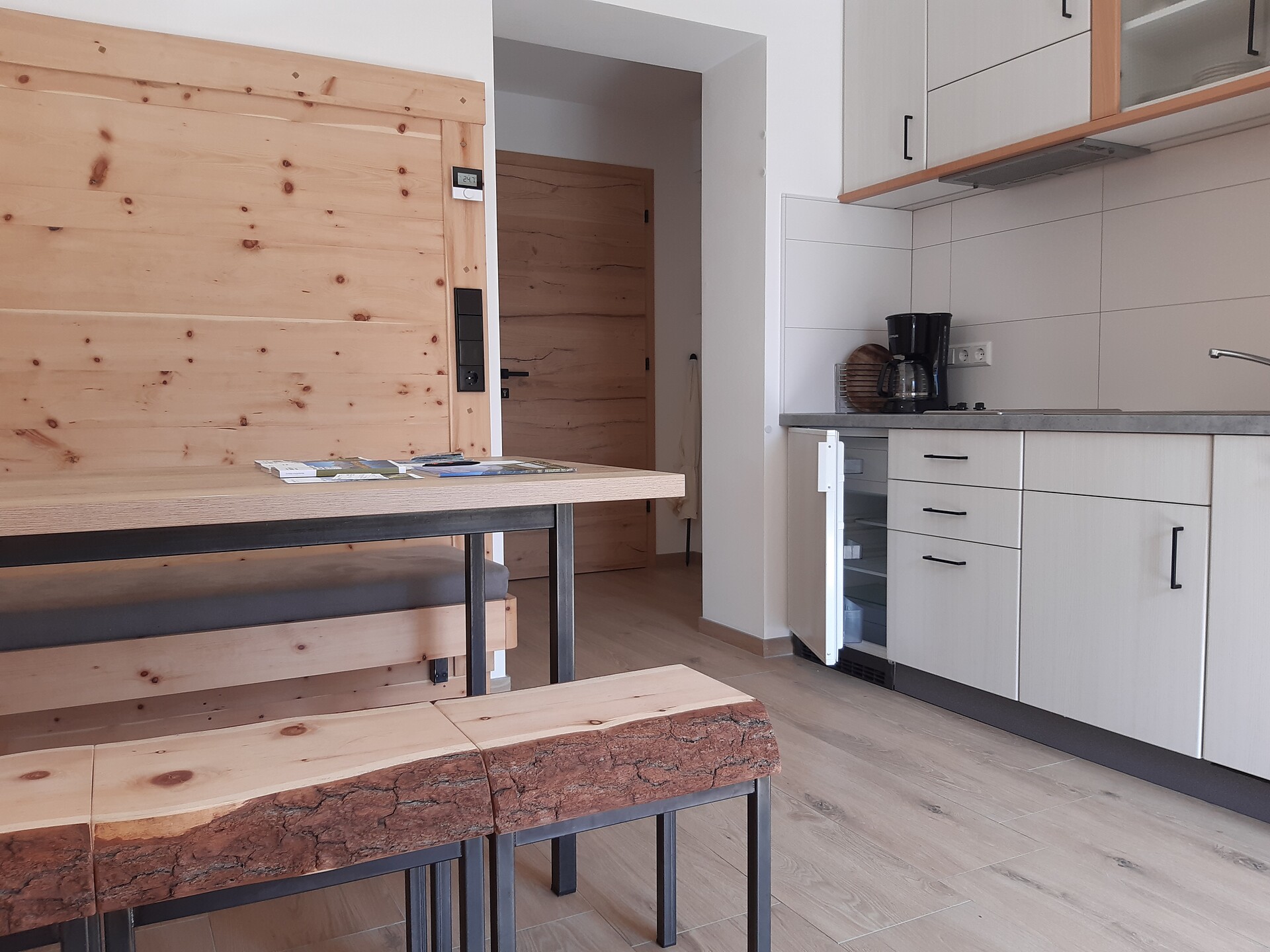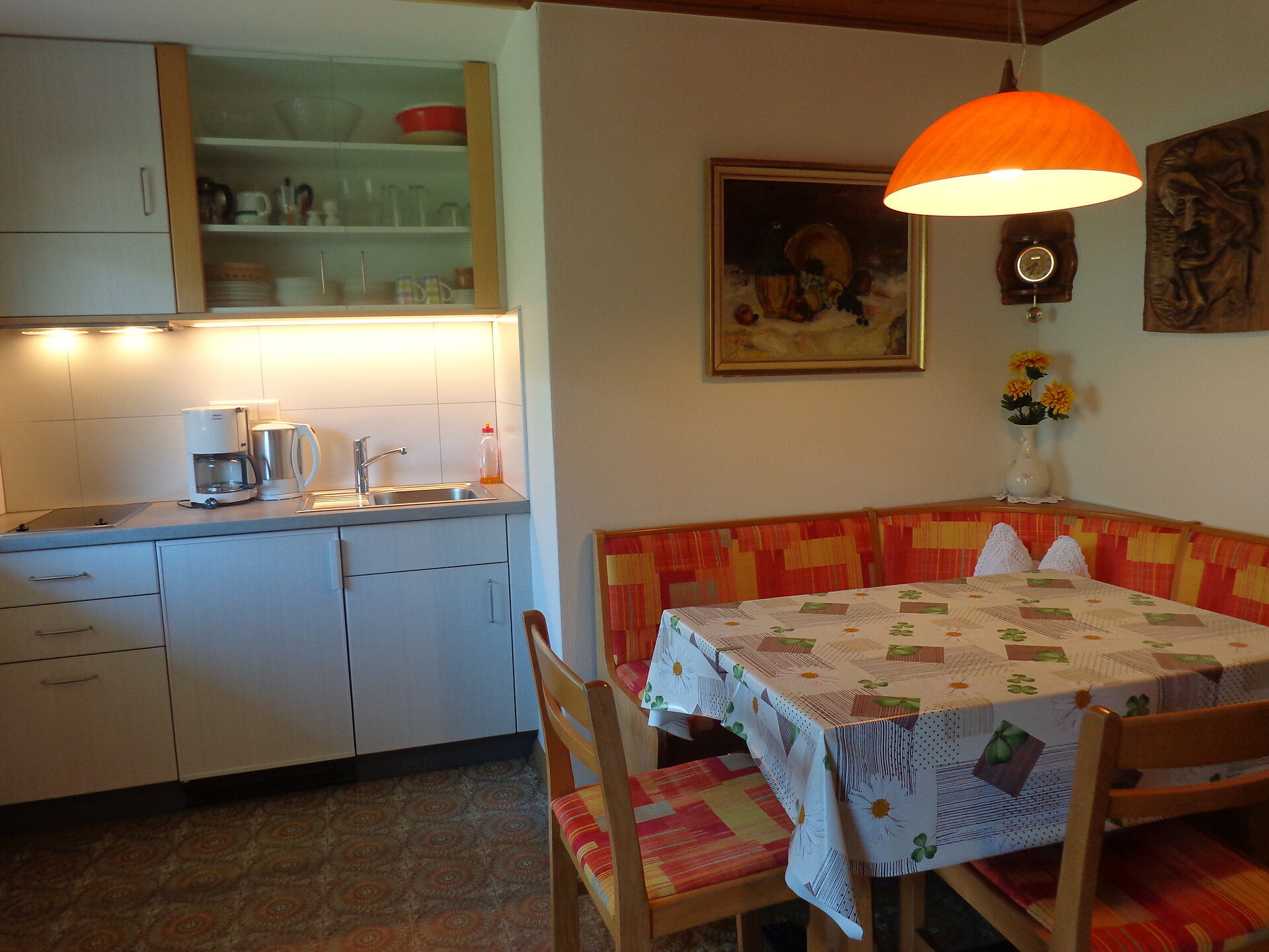 Kühlschrank, Kochgelegenheit, Kaffeemaschine; Eckbank mit Tisch und Stühlen, Schlafcouch (ausziehbar), ebenso ein Fernseher mit Sat, W-Lan,