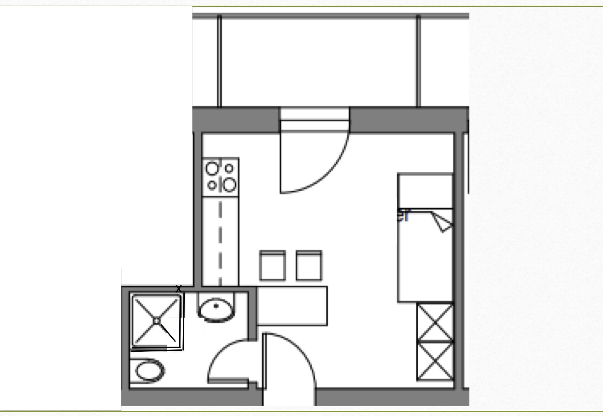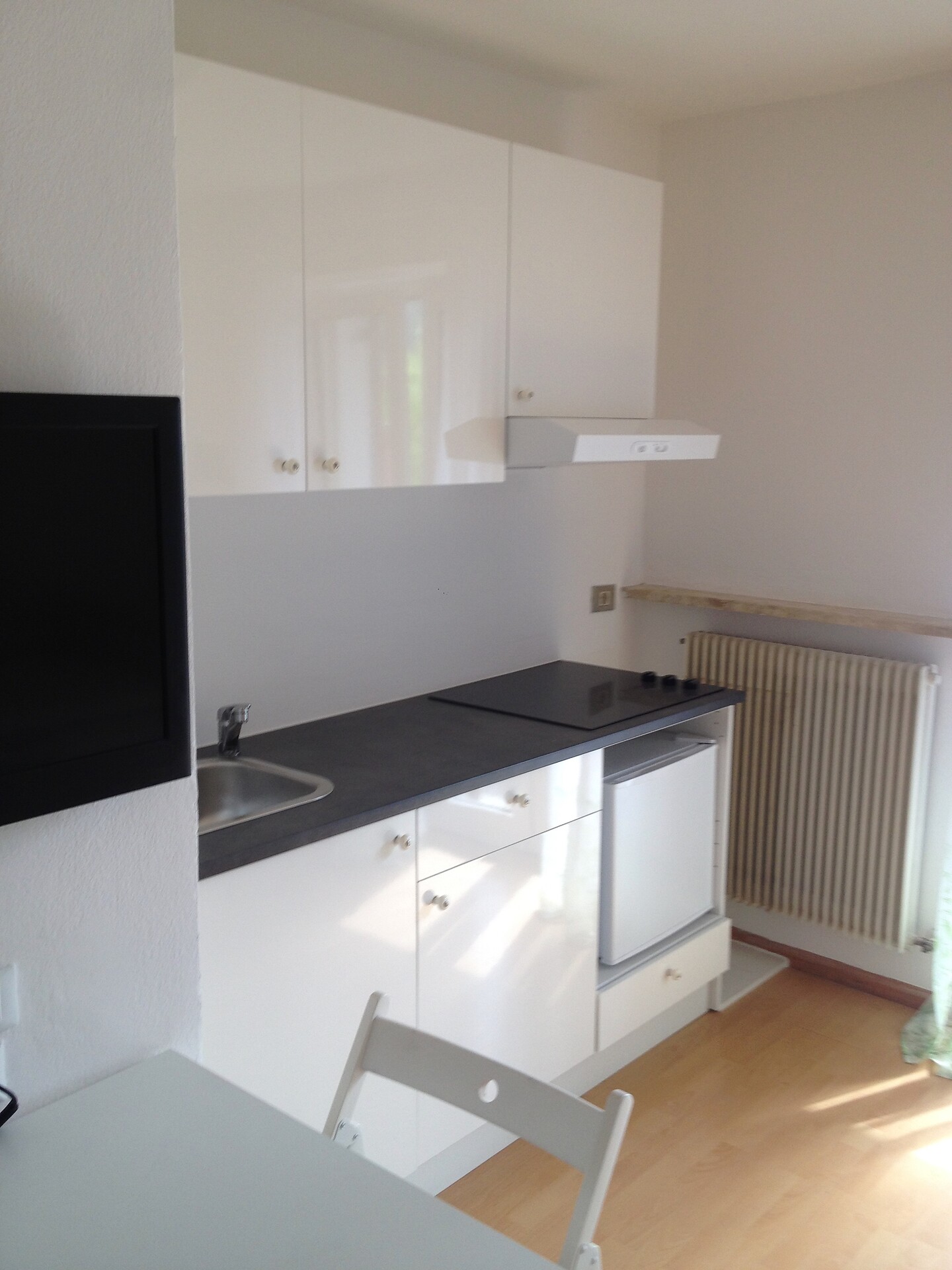 Kleines Einraum - Appartement mit Balkon, ausgestattet mit Einbauküche, ausziehbarem Bett und Bad mit Dusche; ideal für Singles;