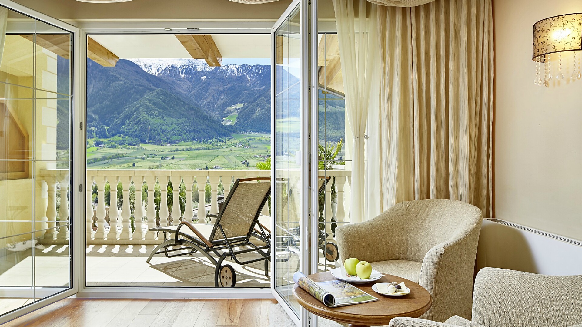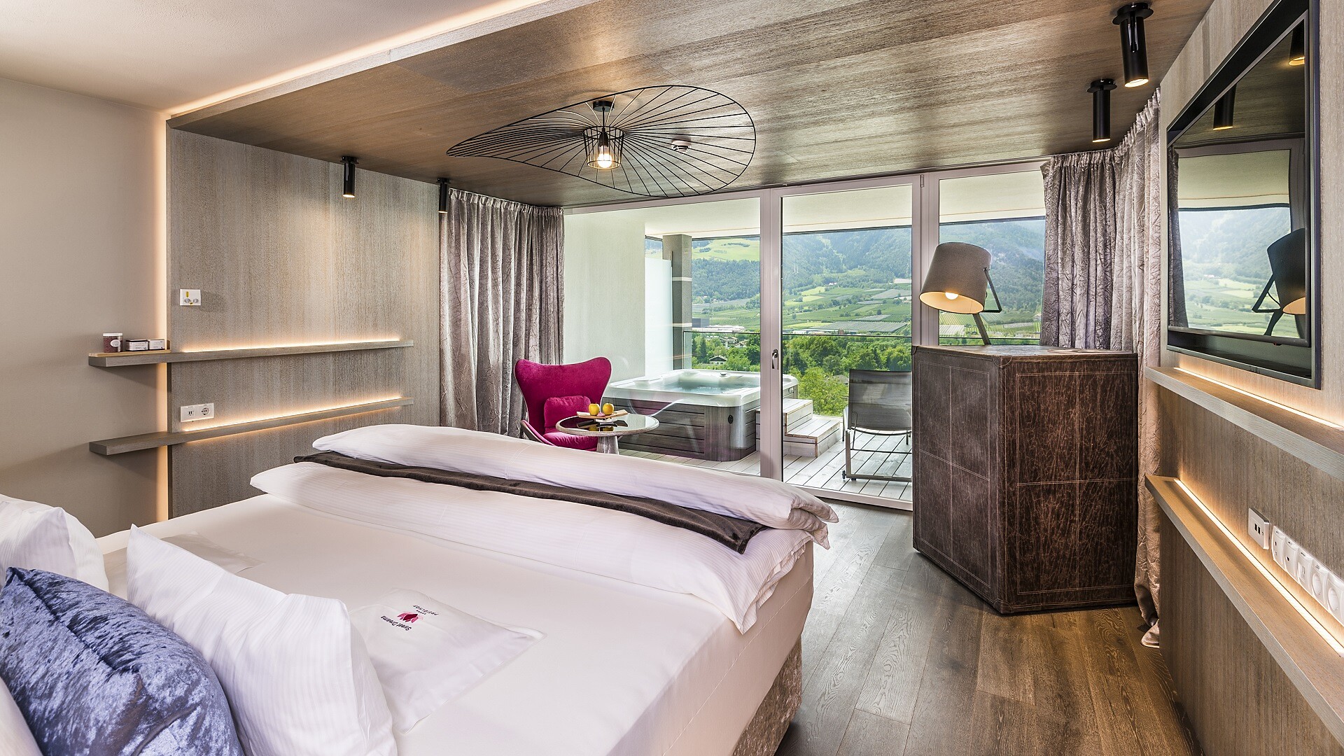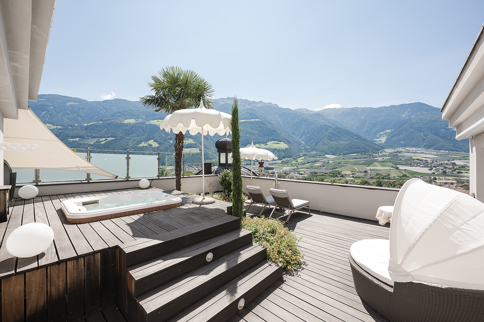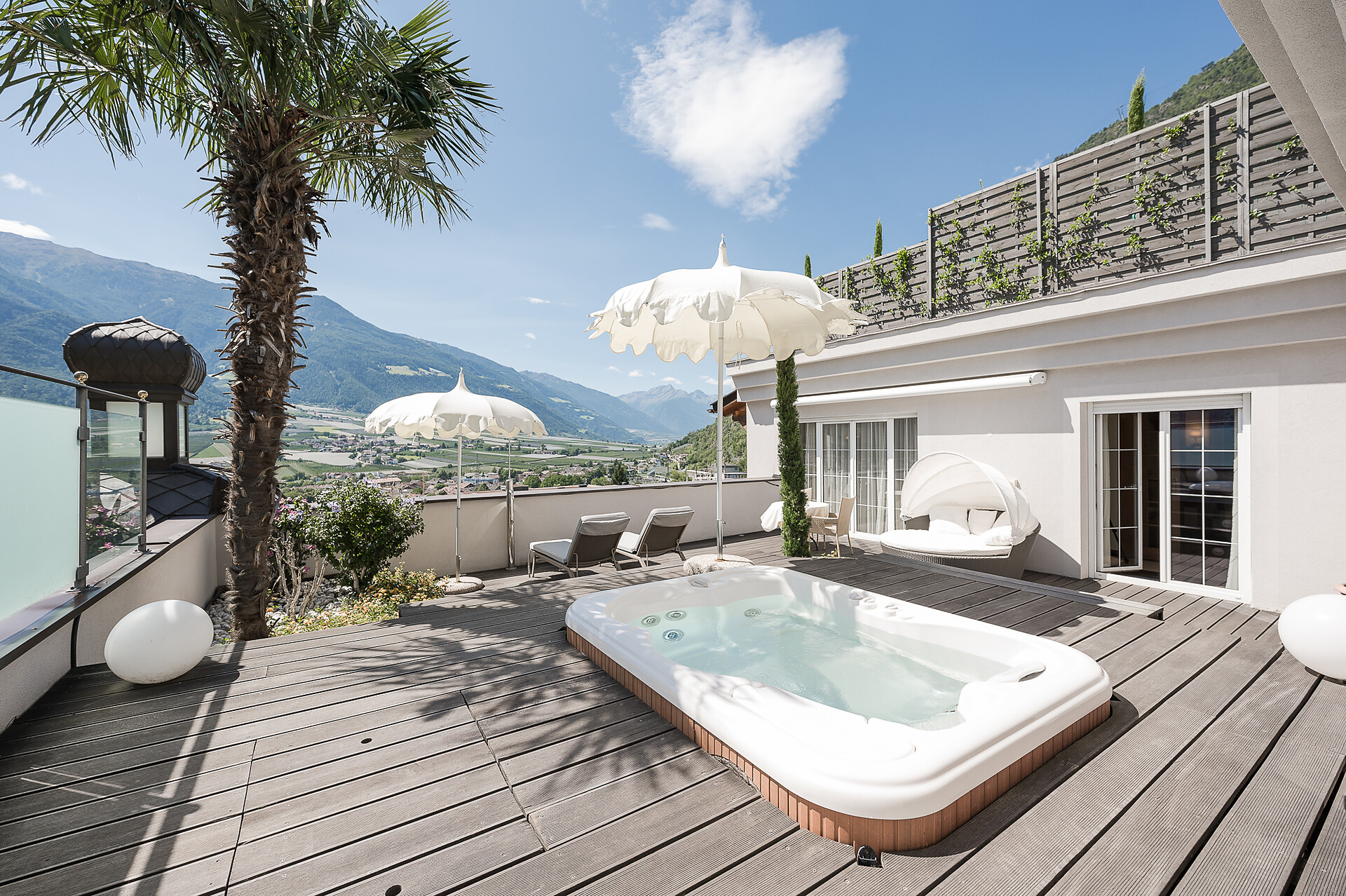 Suite, Doppelbett, Terrasse, Klimaanlage, Wohnecke, Minibar, Safe, Kaffee-/Tee-Maschine, Dusche / Bad, Separates WC, Bidet, Haarfön, Bademantel, HiFi, TV, Satellit/Kabel, WLAN, Internetanschluss, Haupthaus, Panoramablick, Südseite