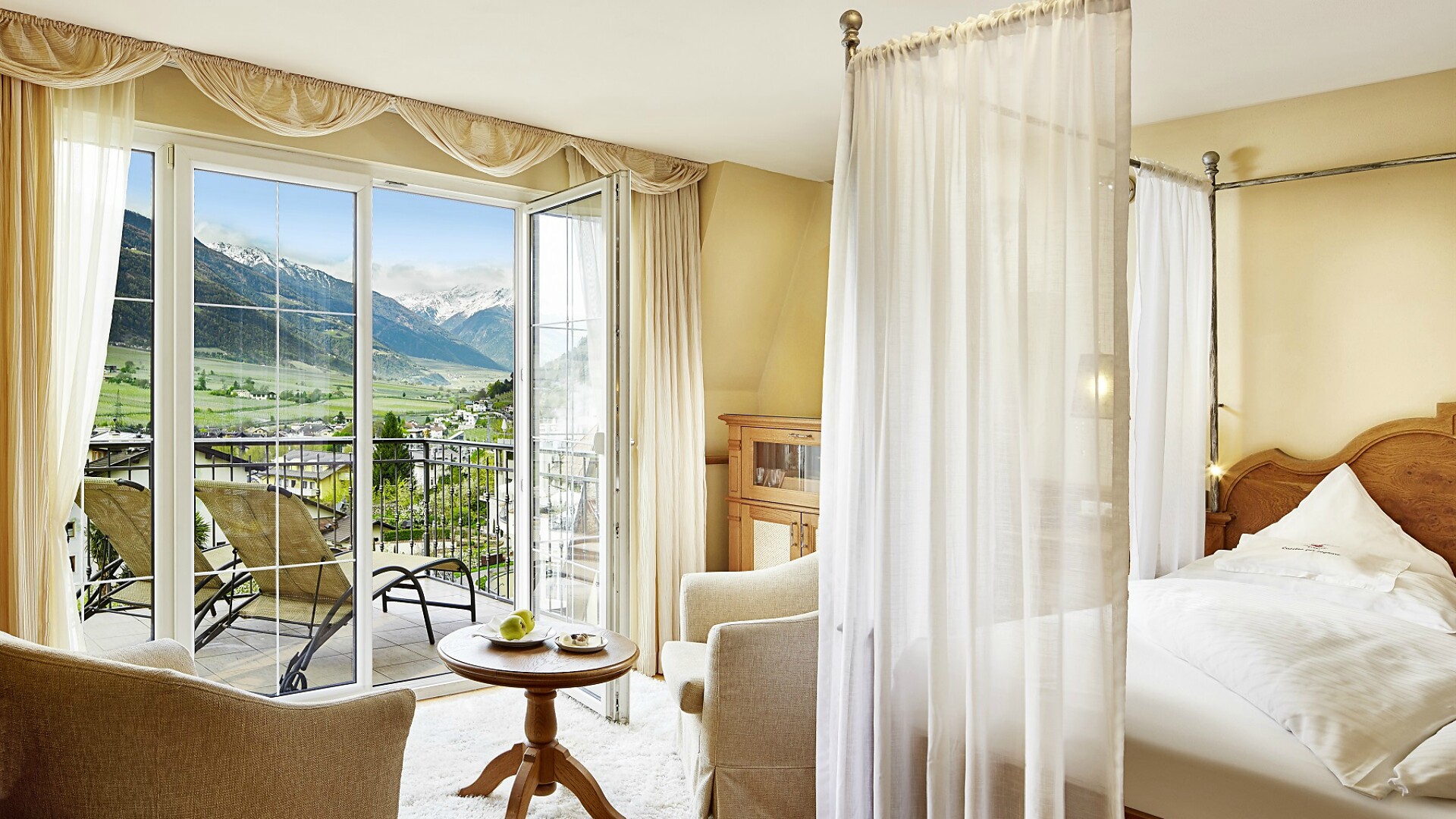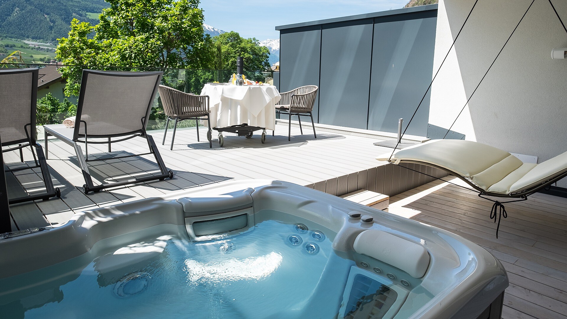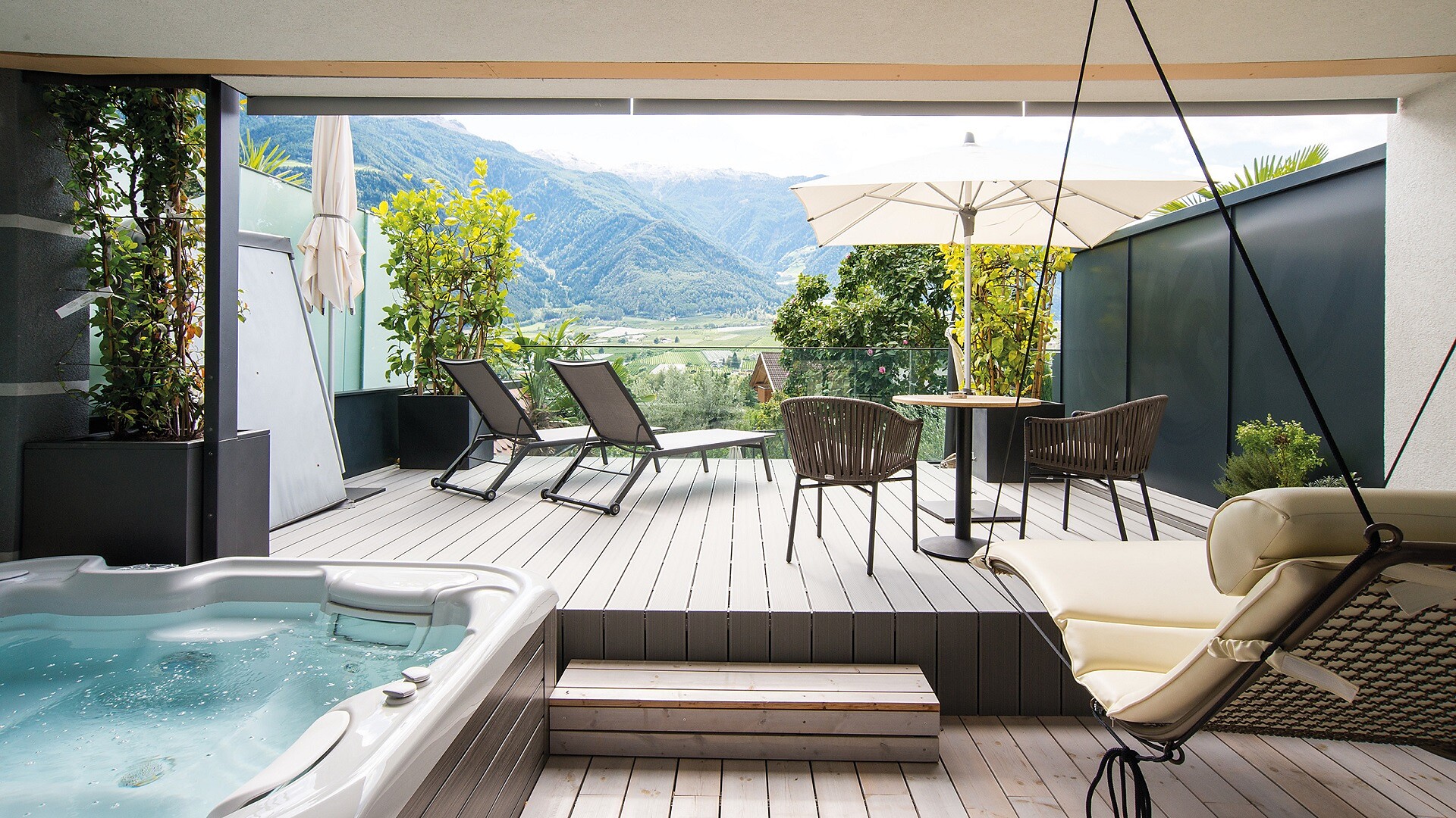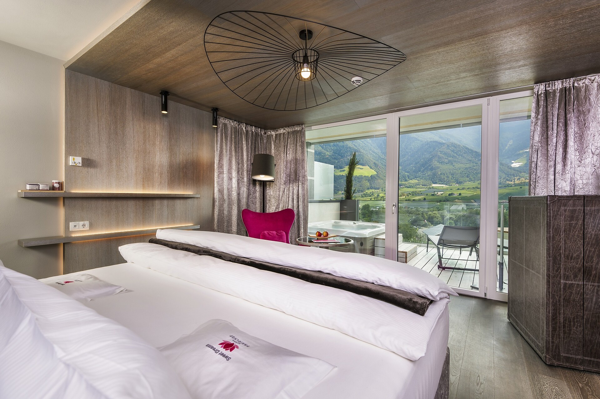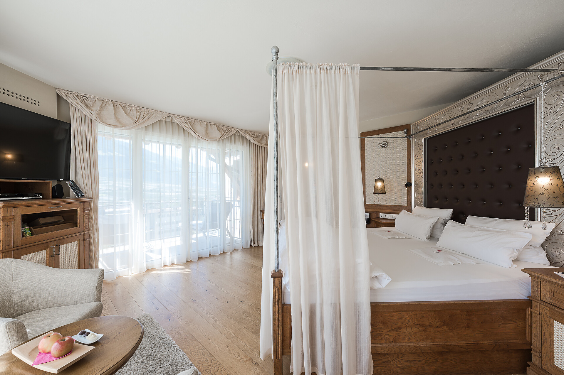 Suite, Doppelbett, Terrasse, Klimaanlage, Wohnecke, Minibar, Safe, Kaffee-/Tee-Maschine, Dusche / Bad, Separates WC, Bidet, Haarfön, Bademantel, HiFi, TV, Satellit/Kabel, WLAN, Internetanschluss, Haupthaus, Panoramablick, Südseite