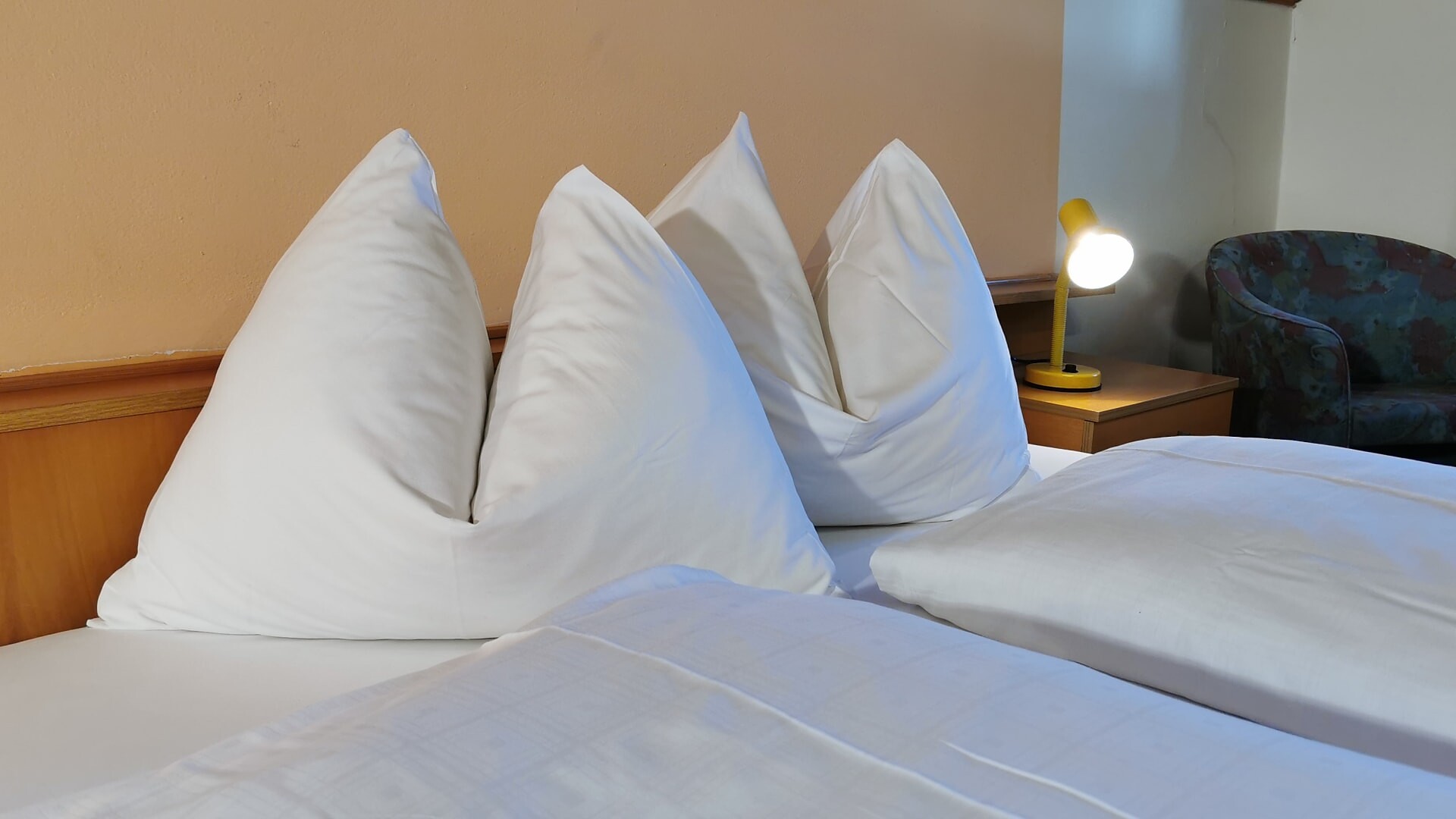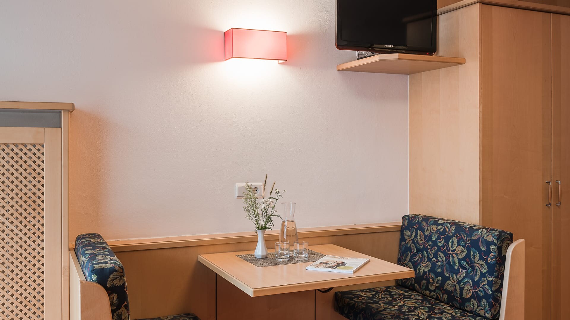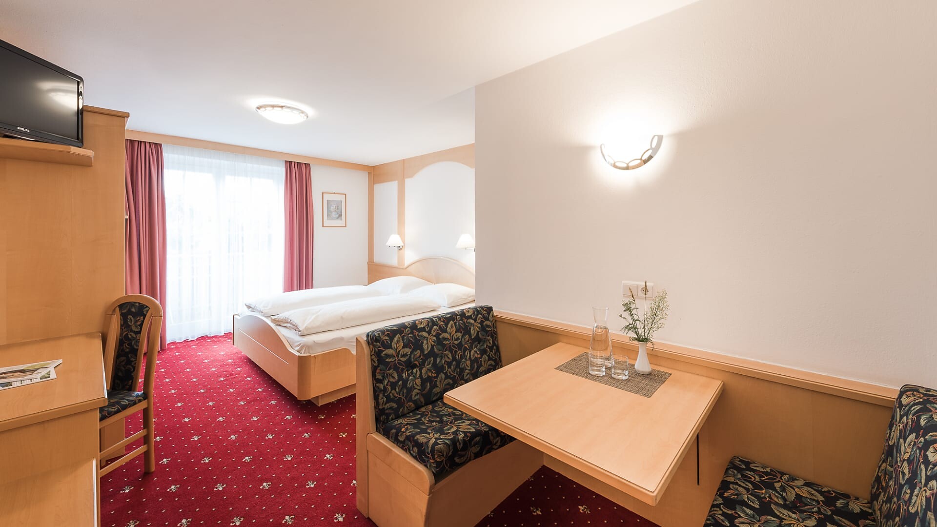 Wohnschlafraum mit Doppelbett und kleiner Sitzecke, Teppichboden. Flat-TV, Telefon, kostenloses W-LAN und Safe. Badezimmer neu renoviert mit Dusche/WC, Haarfön und kuscheliger Frottee-Badewäsche.