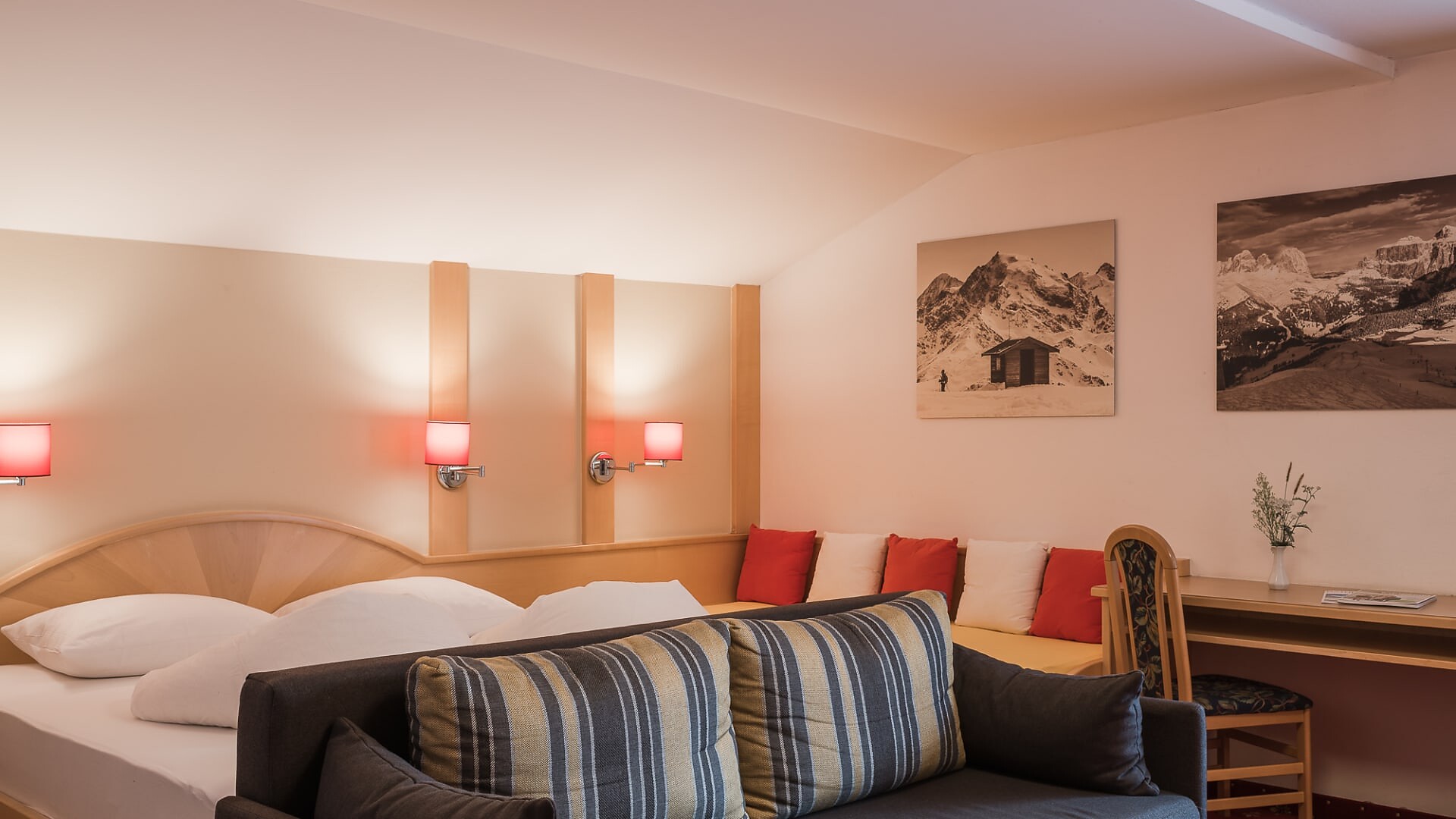 PLATZ FÜR DIE GANZE FAMILIE…30-33 m² großes Familienzimmer mit ruhigem Ostbalkon.Schlafbereich mit Doppelbett und Wohnbereich mit Doppelschlafcouch und Schreibtisch, Teppichboden. Flat-TV, Telefon, kostenloses W-LAN und Safe.Badezimmer neu renoviert mit Dusche/WC, Fön und kuscheliger Frottee-Badewäsche.
