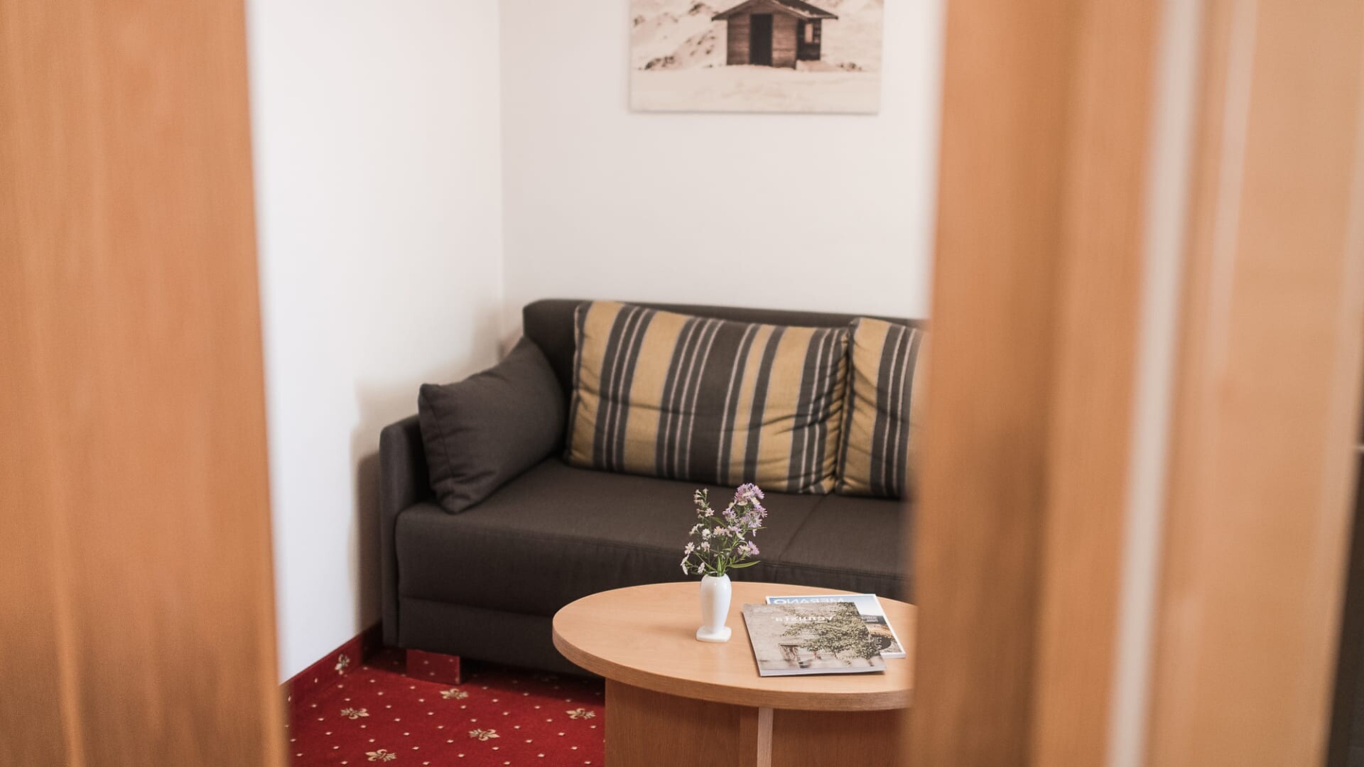 Wohnschlafraum mit Doppelbett, Einzelbett und Doppelschlafcouch bzw. kleiner Sitzecke, Teppichboden. Flat-TV, Telefon, kostenloses W-LAN und Safe. Badezimmer neu renoviert mit Dusche/WC, Fön und kuscheliger Frottee-Badewäsche.