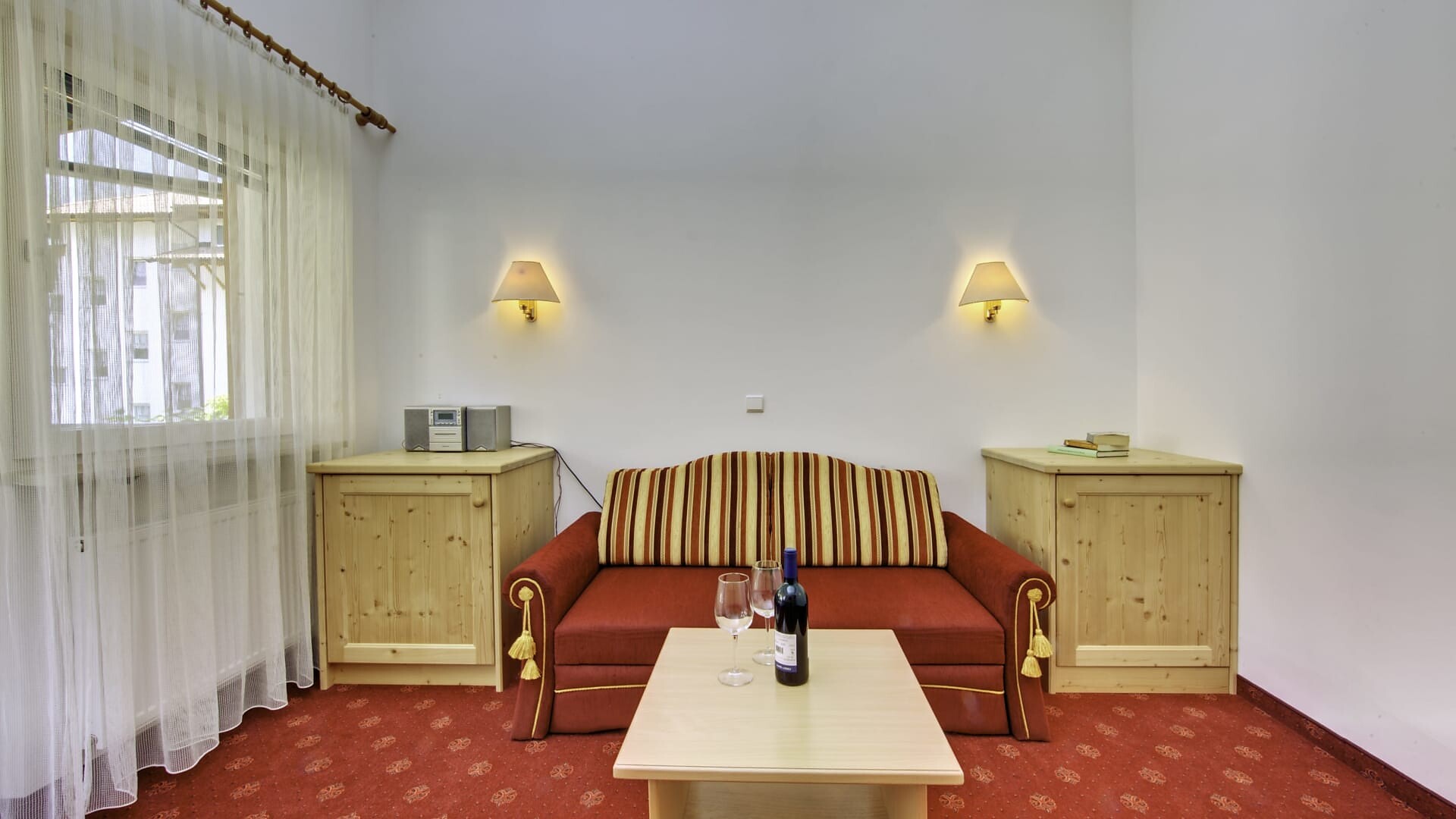 Schlafbereich mit Doppelbett und Schreibtisch. Wohnbereich (durch Schiebetür abgetrennt) mit Doppelschlafcouch und Schreibtisch, Teppichboden. 2 Flat-TV, Telefon, kostenloses W-LAN, Safe und Kühlschrank.