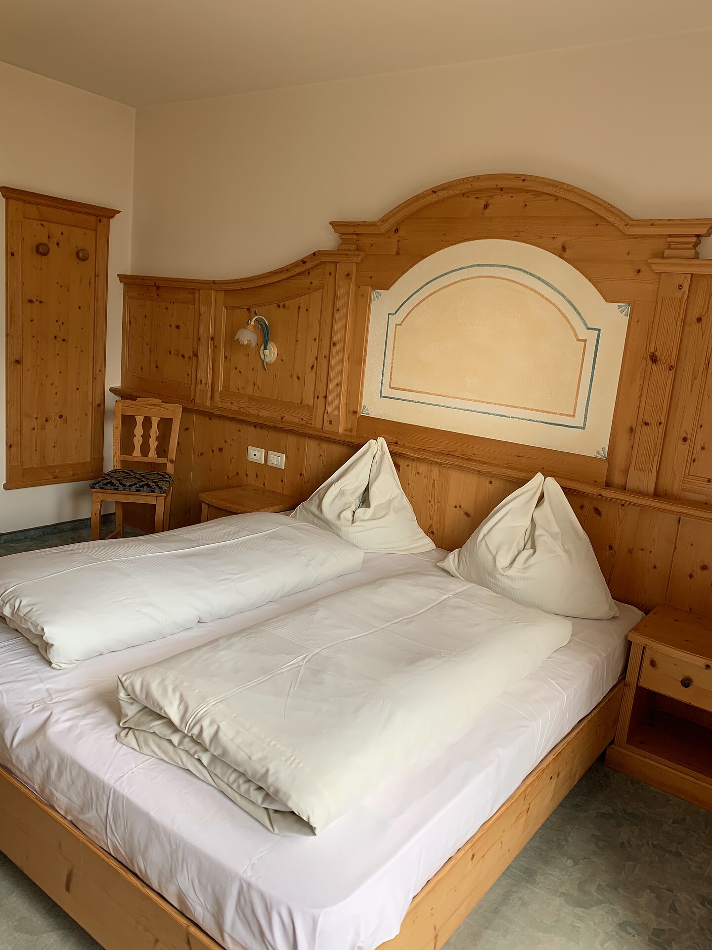 Wir bieten Ihnen rustikal eingerichtete Doppelzimmer mit TV, Wlan, eigenem Badezimmer, ein Freibad mit Liegewiese und ein Frühstücksbuffet.
