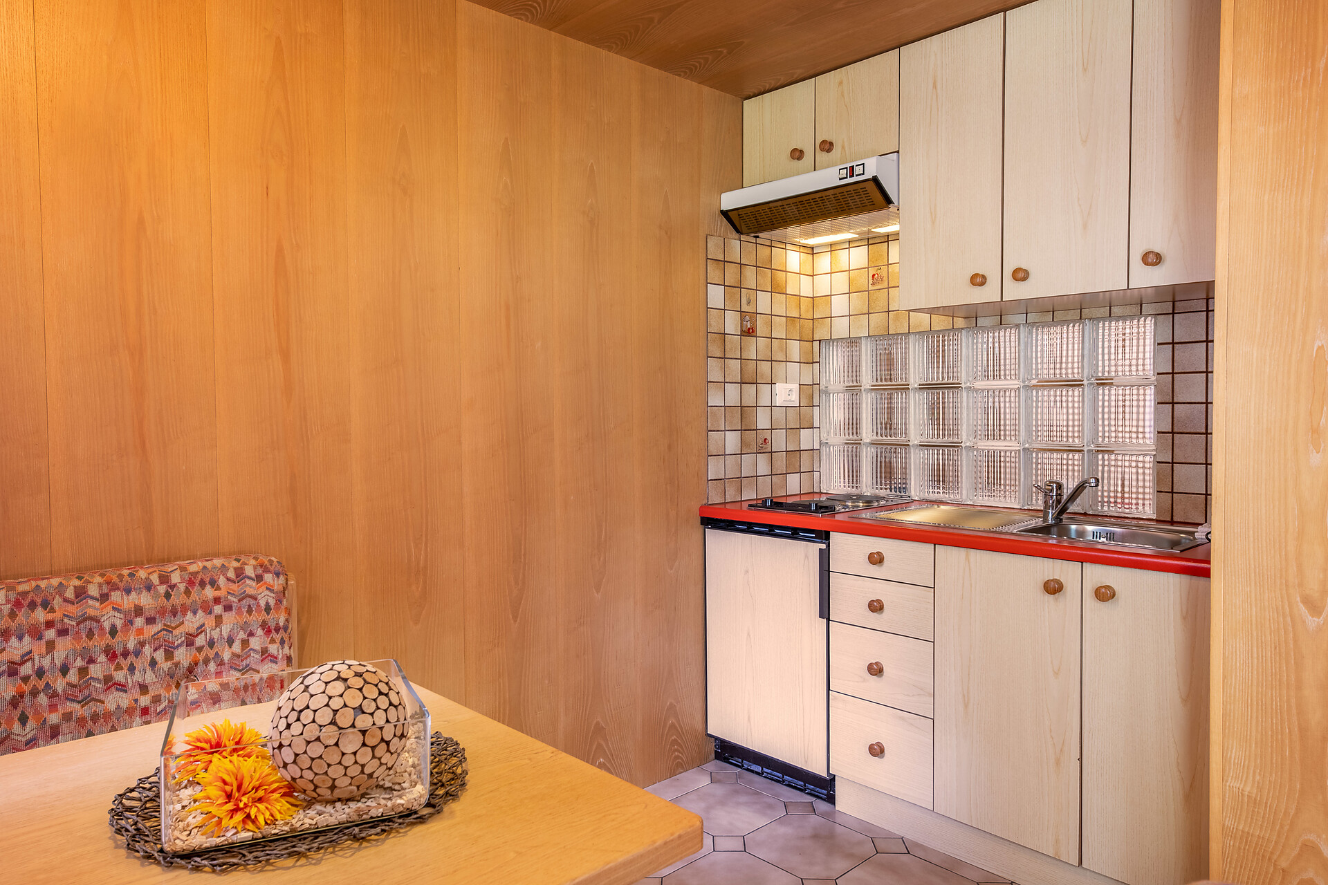 Kochnische mit Sitzecke, Kaffeemaschine und Wasserkocher
