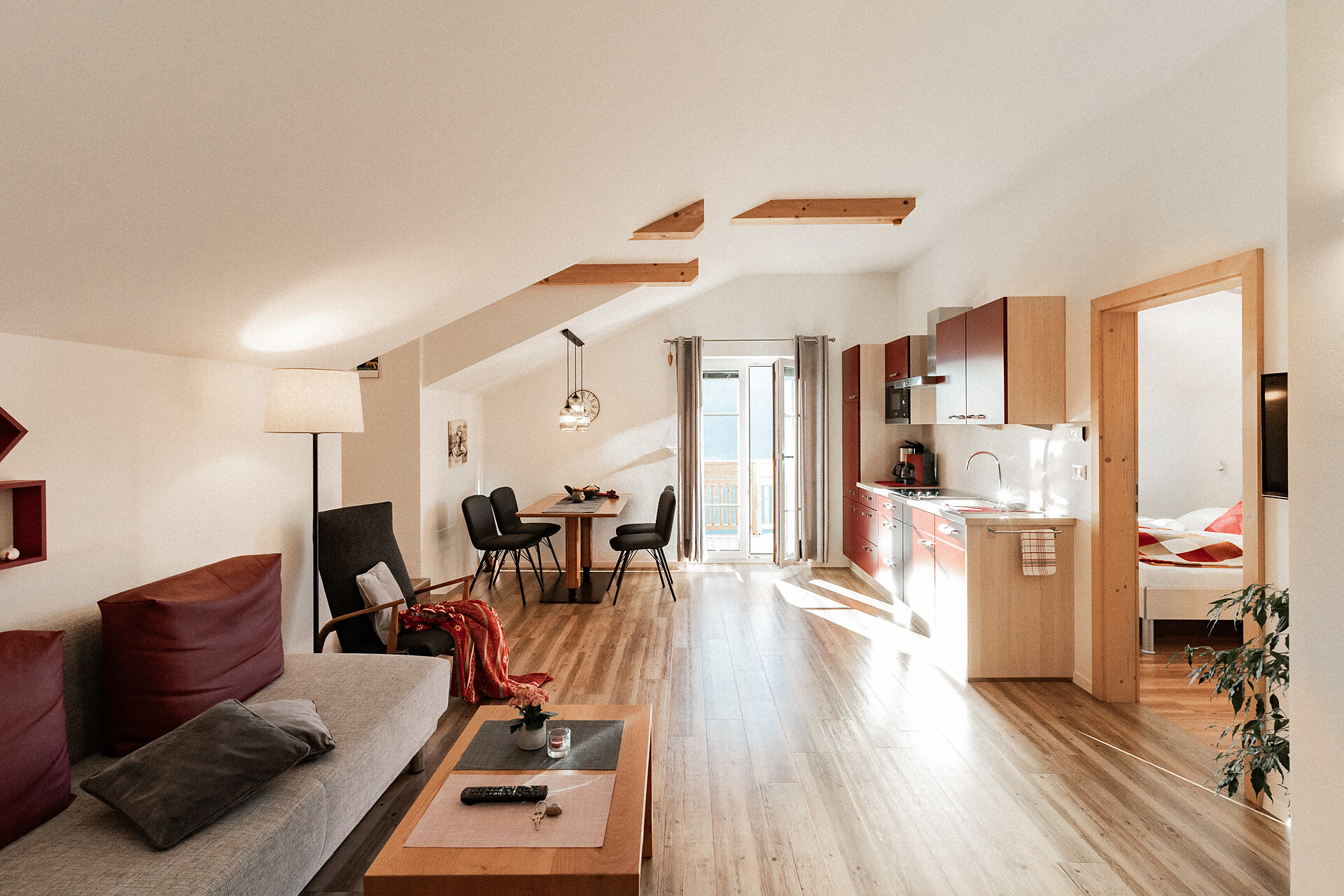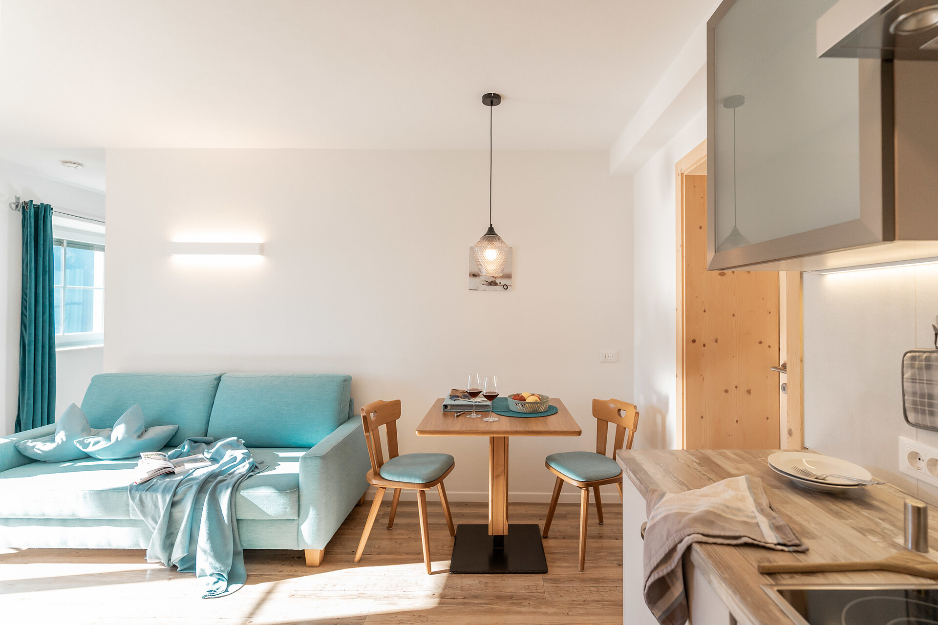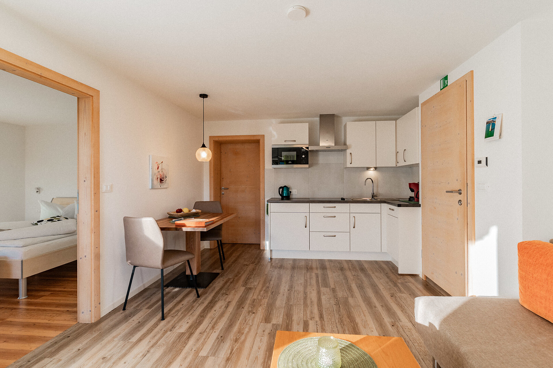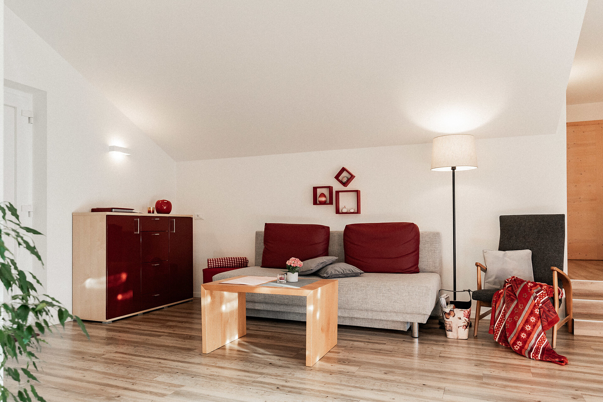 Die Liebe steckt im kleinsten Detail. 1. Obergeschoss – ideal für 2 Personen. Klein, aber oho ist unser Apartment s’Nestl mit seinen 40 m². Und es macht seinem Namen alle Ehre. Hier wohnt ihr wie in einem Nest, wo es ganz kuschelig und gemütlich ist. Und doch fehlt es euch in dieser Ferienwohnung nichts. Sogar einen Balkon habt ihr, zum Draußensitzen und Ausblick-Genießen.